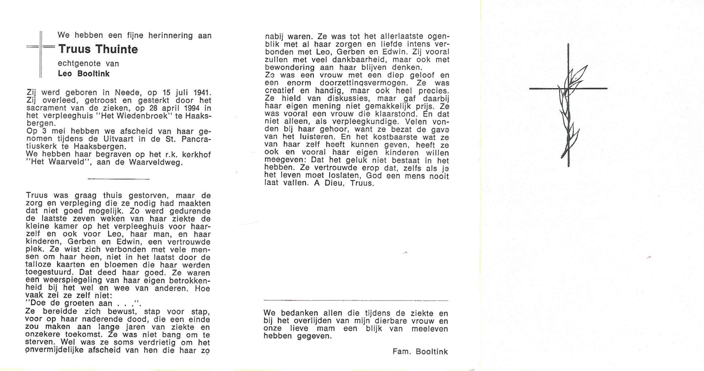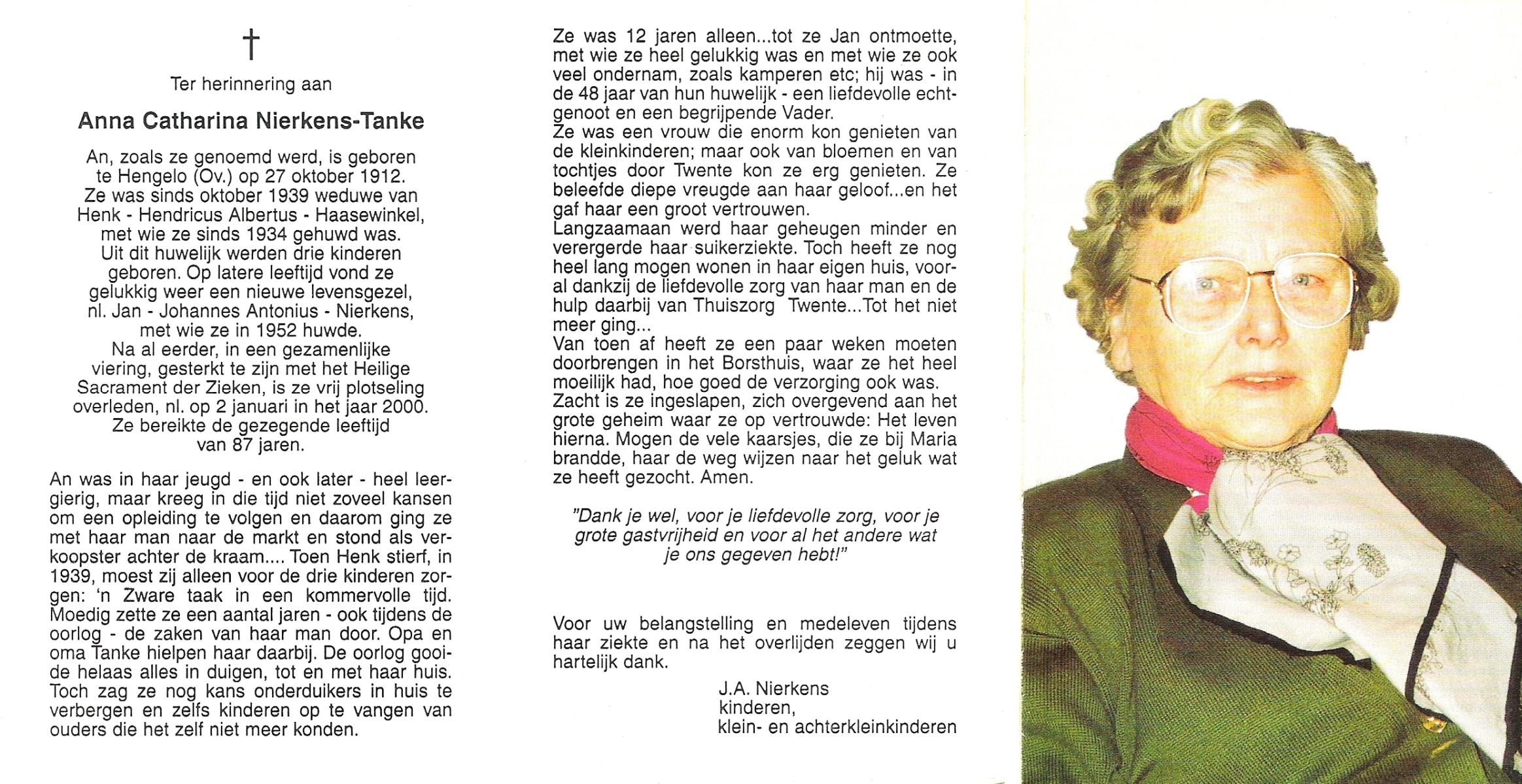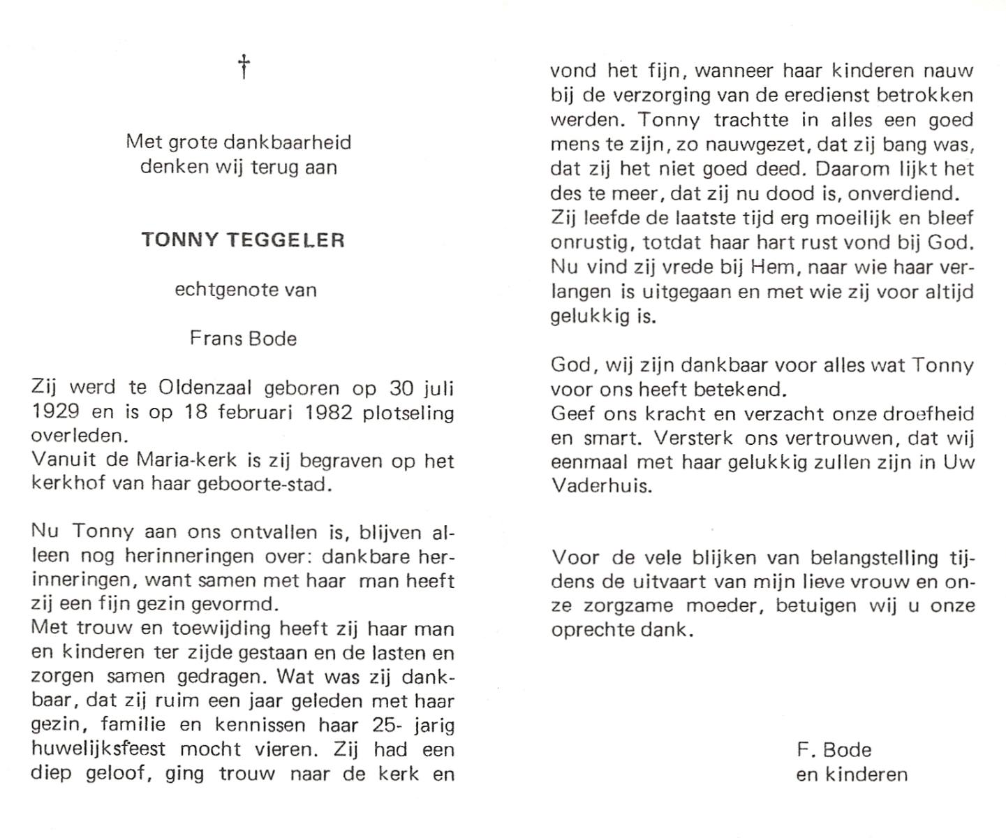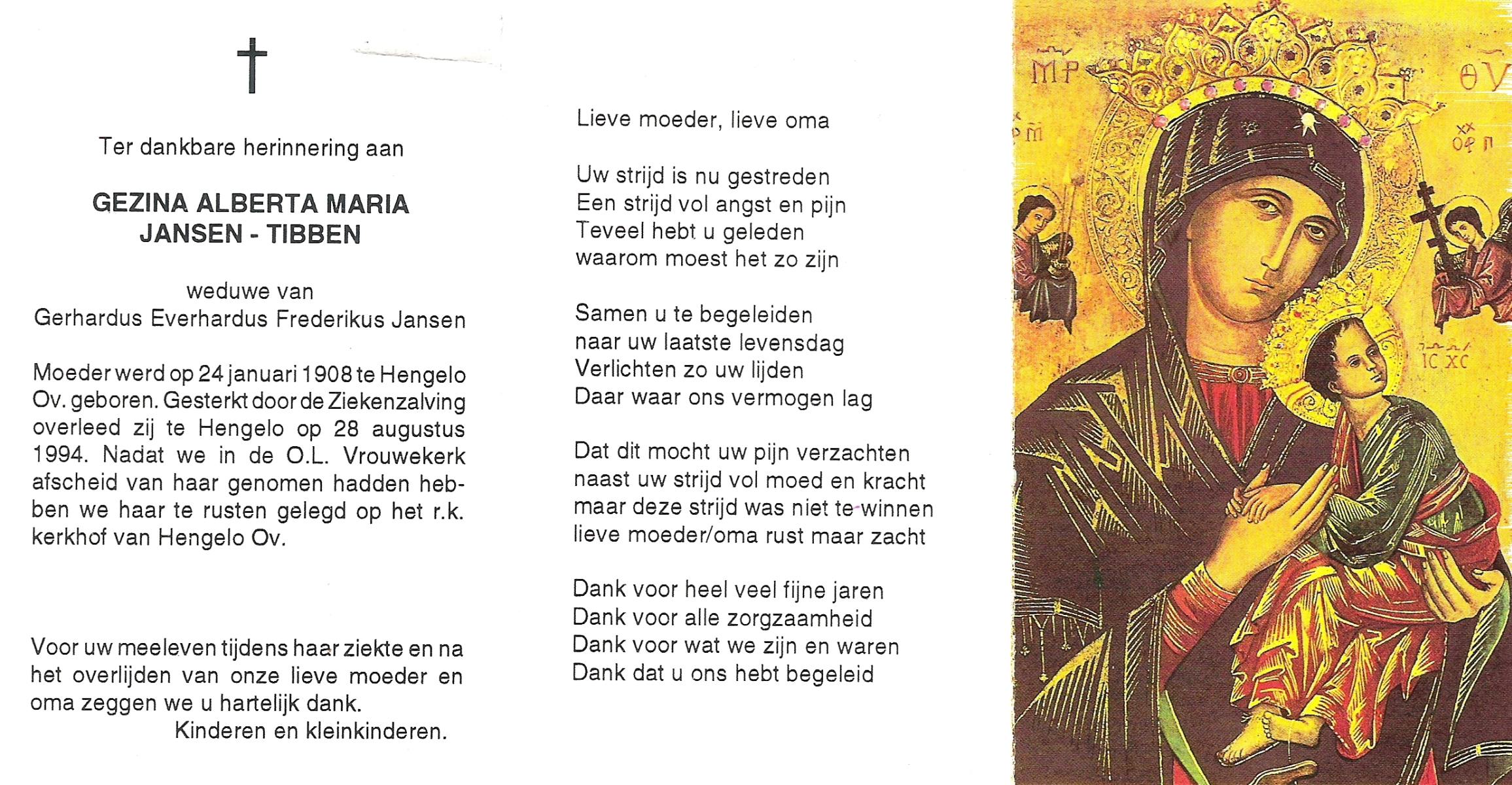 TIETHOF, Anna Geertruida, geboren op 29-8-1909 te Hengelo (O), overleden op 17-11-1989 te Haaksbergen op 80-jarige leeftijd, begraven op 22-11-1989 te Hengelo (Ov.).