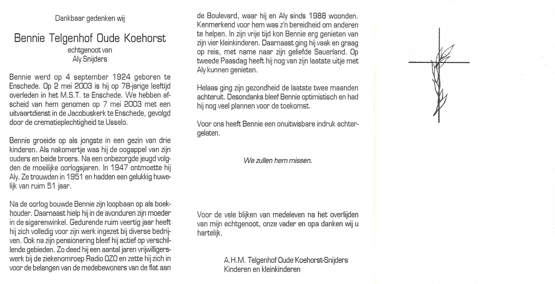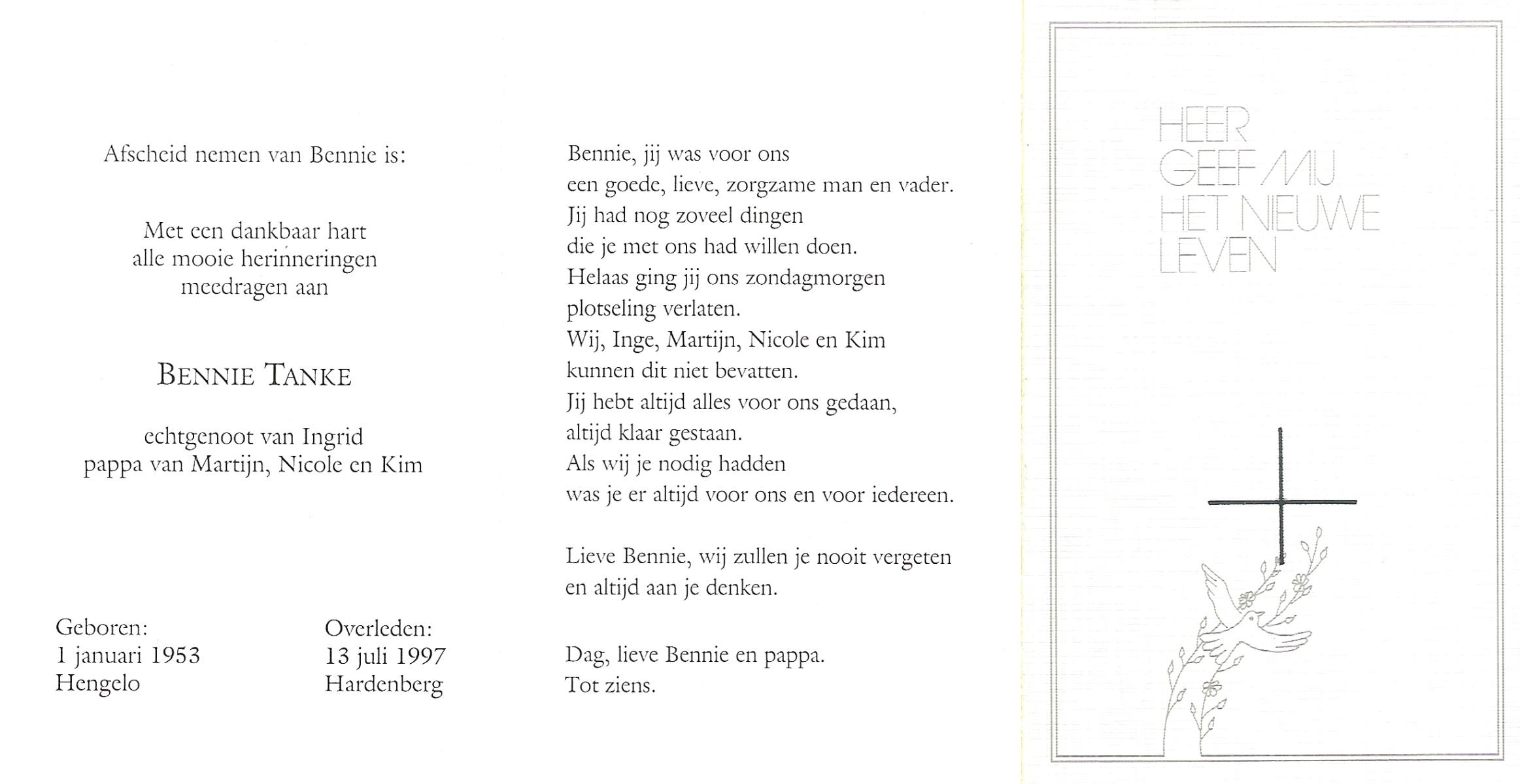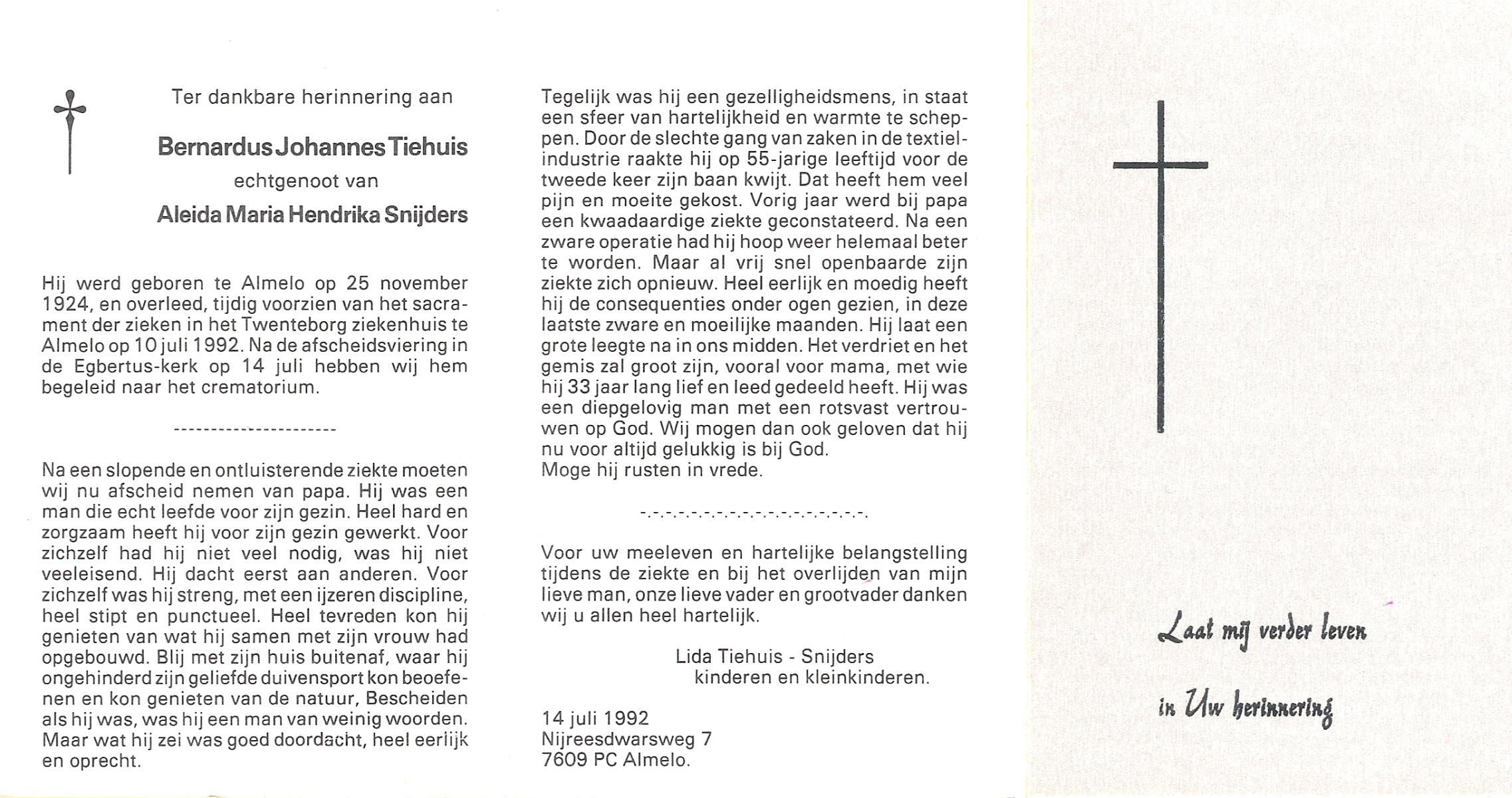 TIEHUIS, Bernardus Johannes, geboren op 25-11-1924 te Almelo, overleden op 10-7-1992 te Almelo op 67-jarige leeftijd, gecremeerd op 14-7-1992 te Almelo.