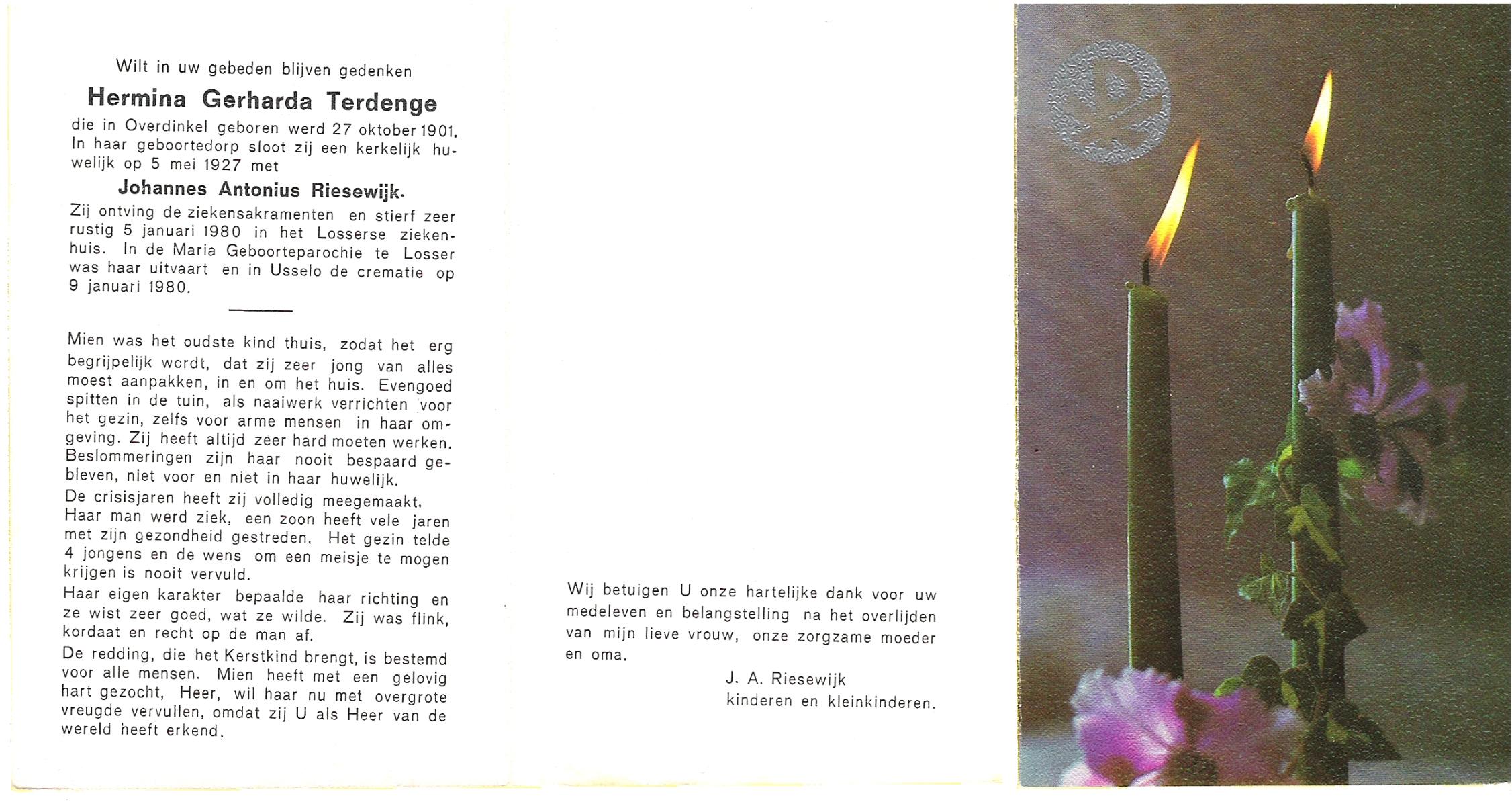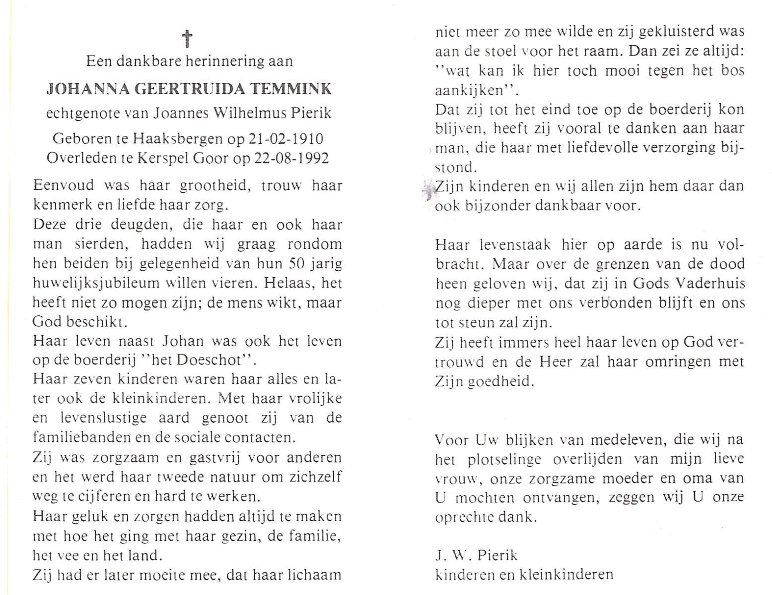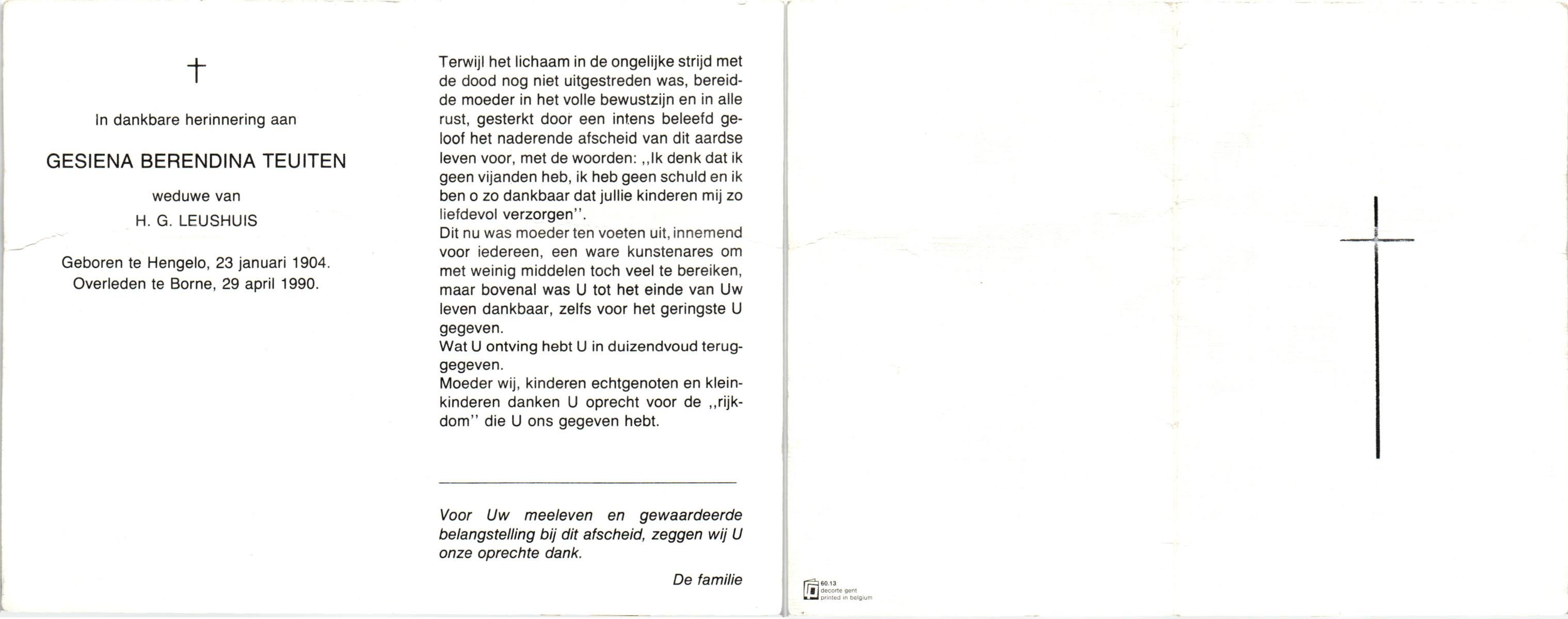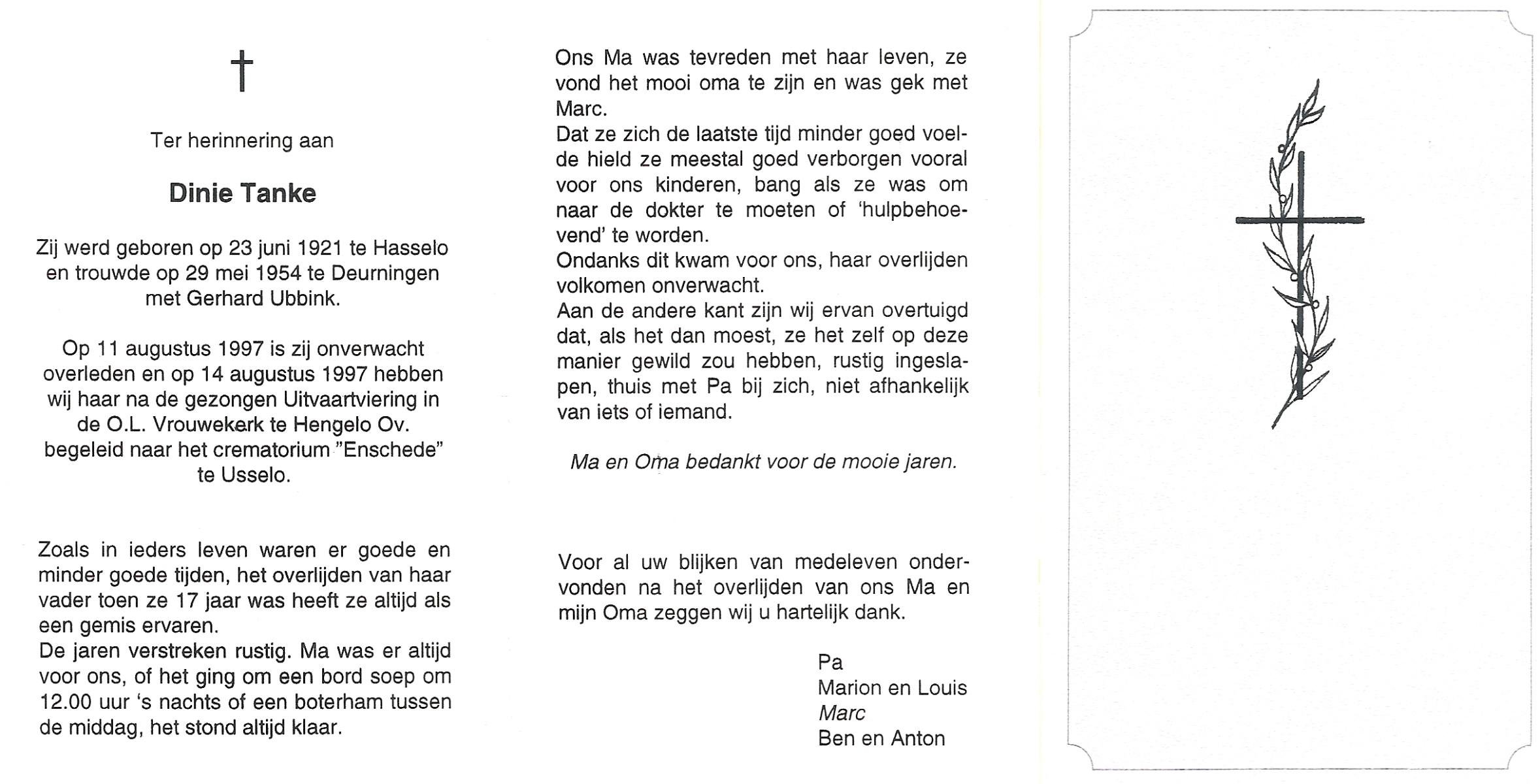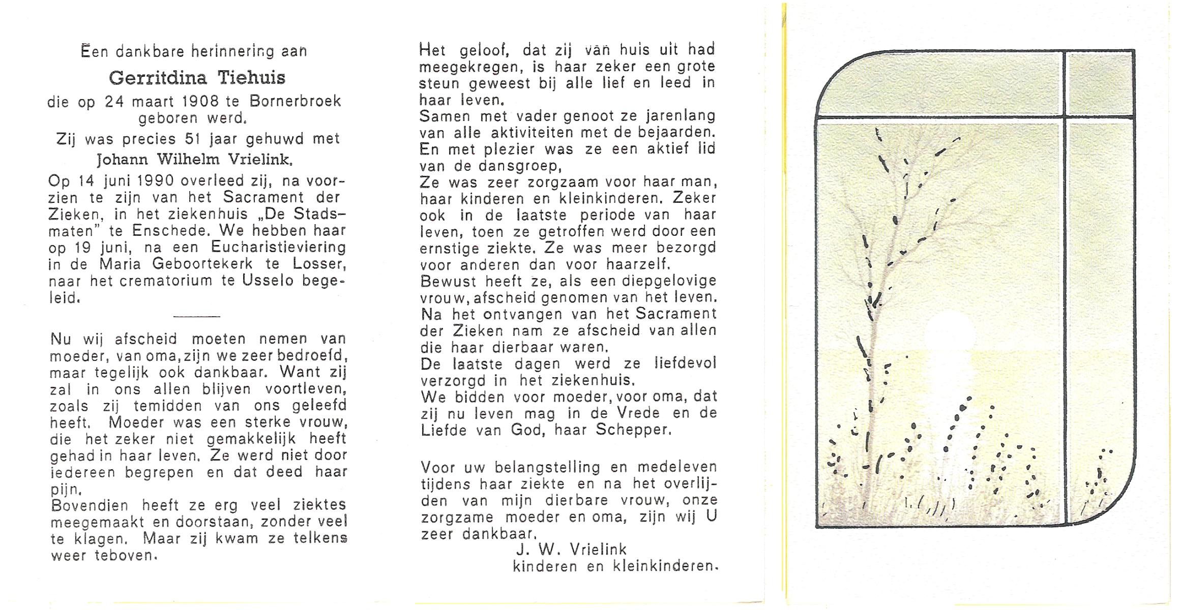 TIEHUIS, Gerritdina, geboren op 24-3-1908 te Bornerbroek, overleden op 14-6-1990 te Enschede op 82-jarige leeftijd, gecremeerd op 19-6-1990 te Usselo.
