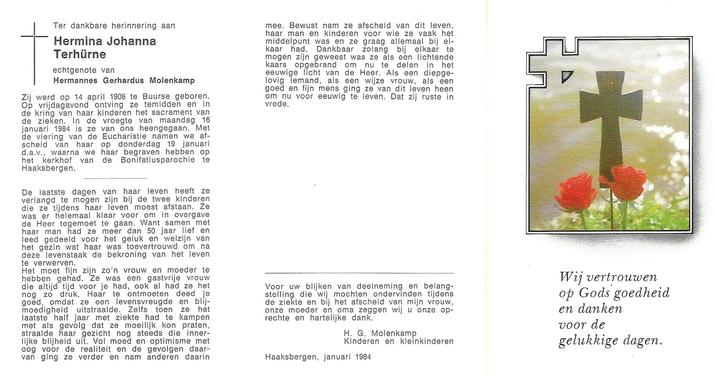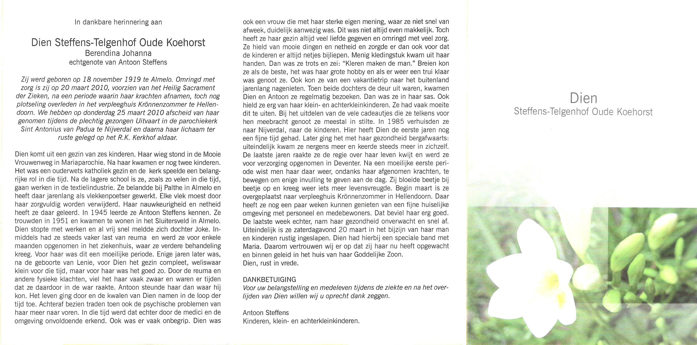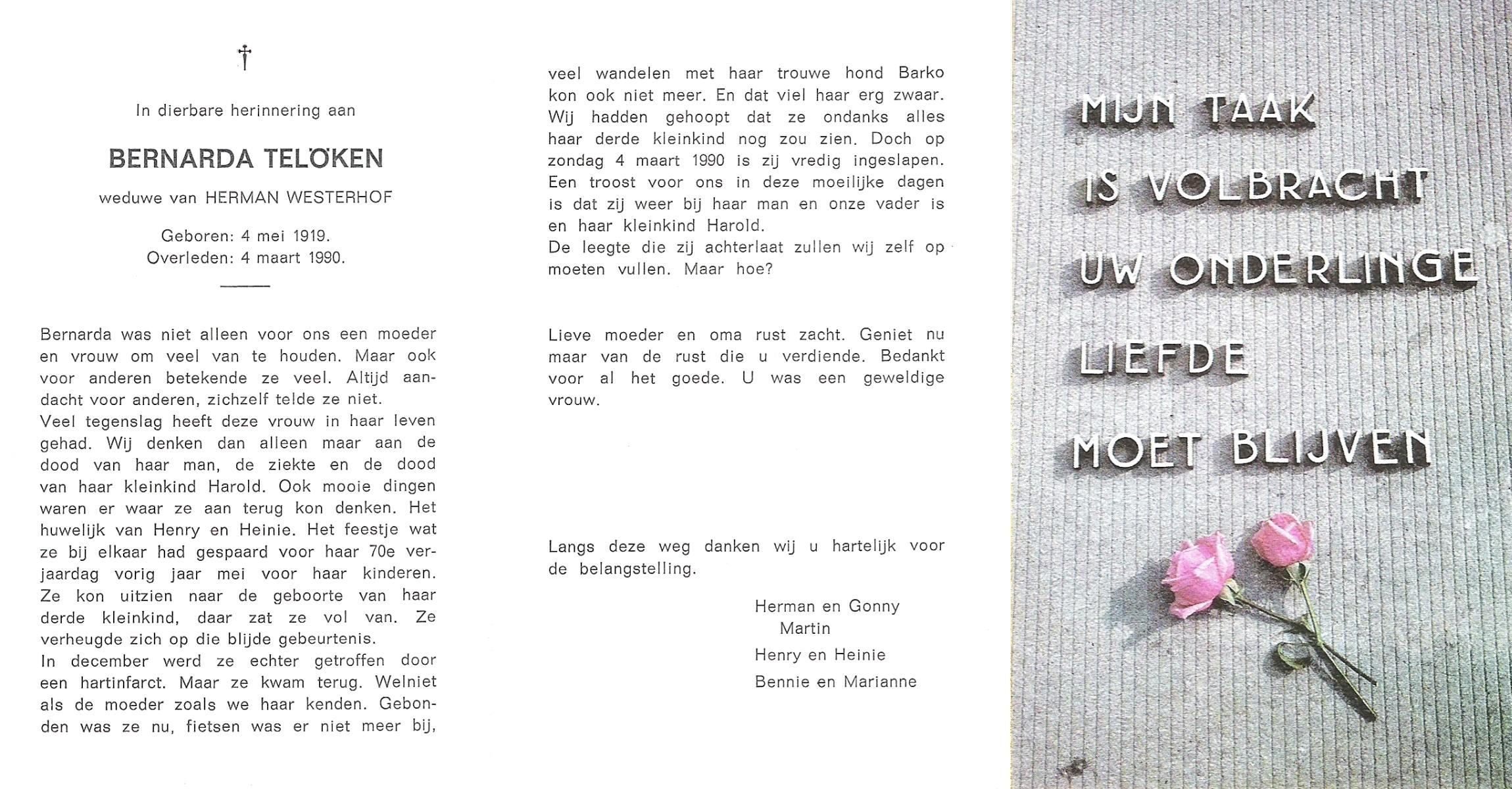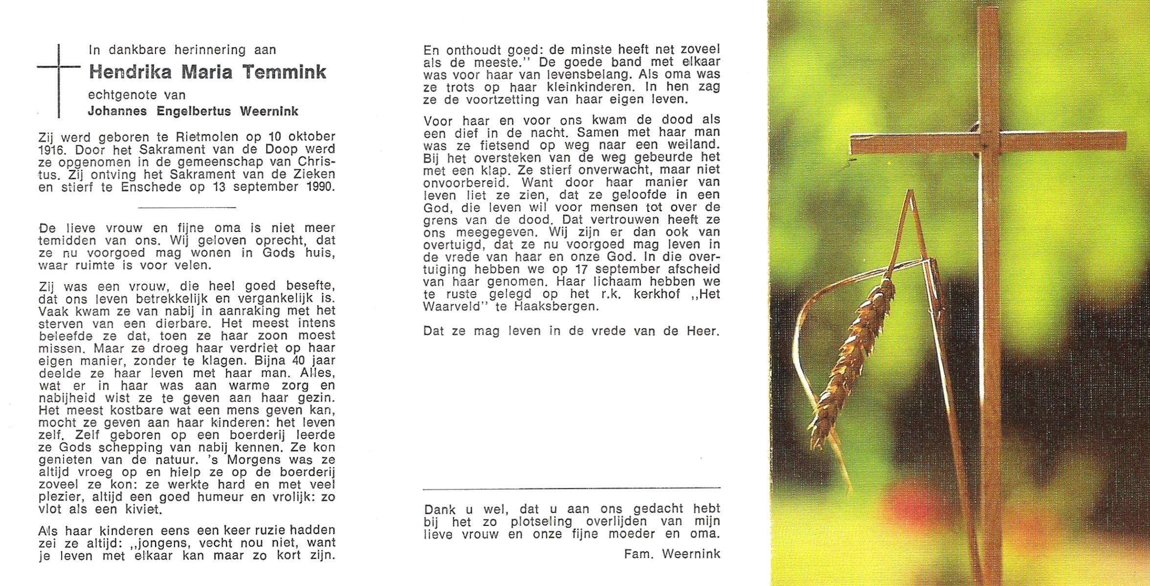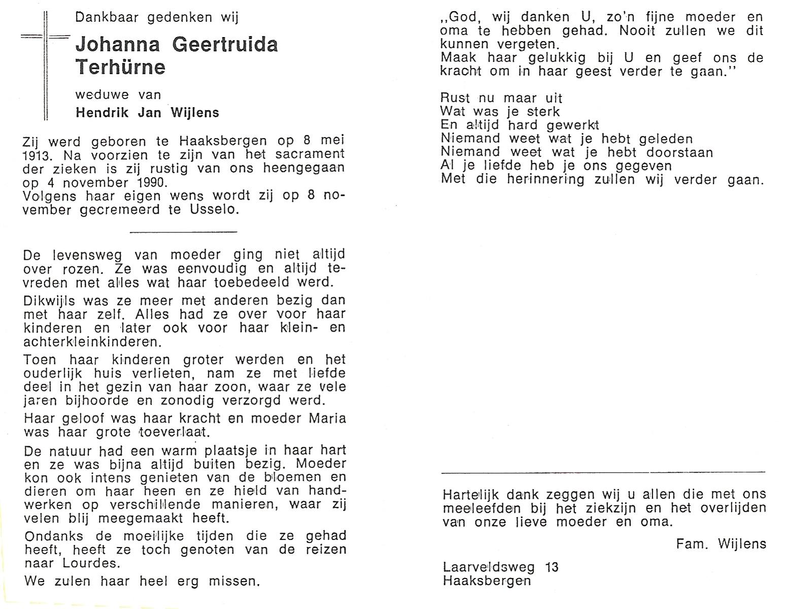 TIEHUIS, Gerritdina, geboren op 24-3-1908 te Bornerbroek, overleden op 14-6-1990 te Enschede op 82-jarige leeftijd, gecremeerd op 19-6-1990 te Usselo.
