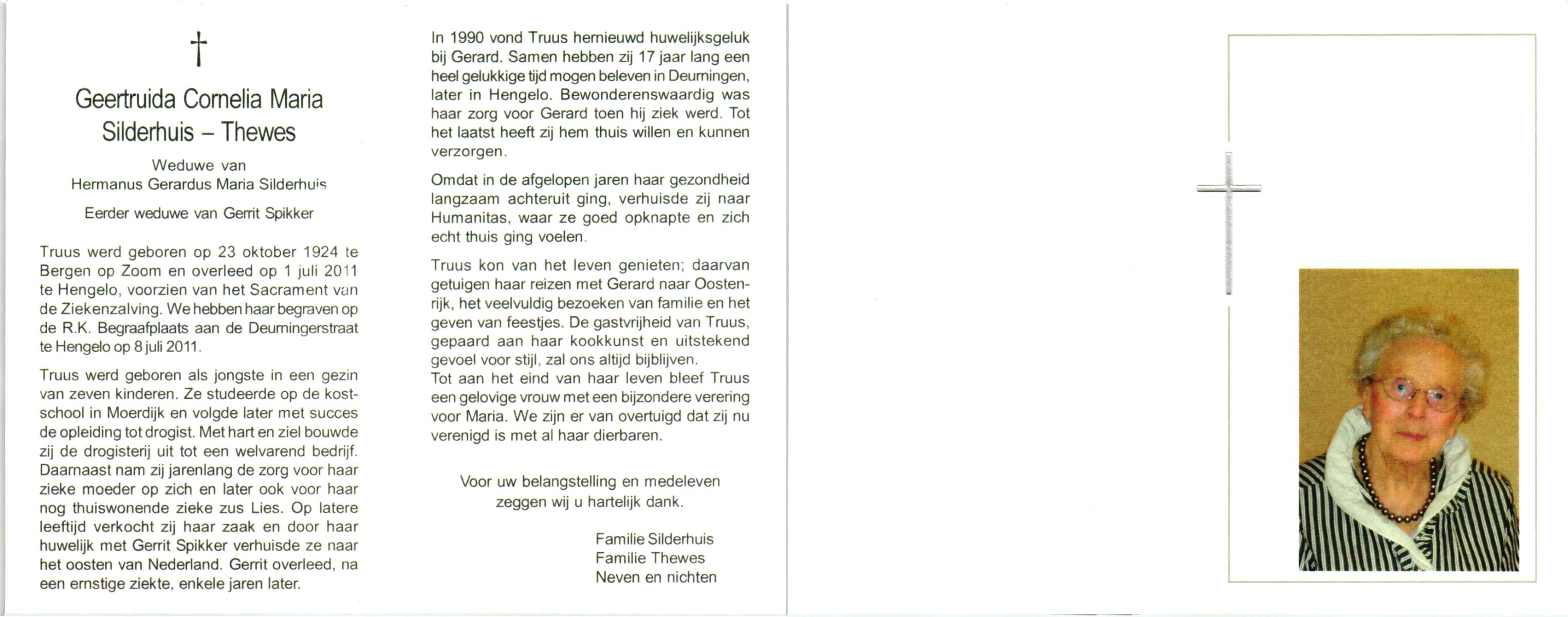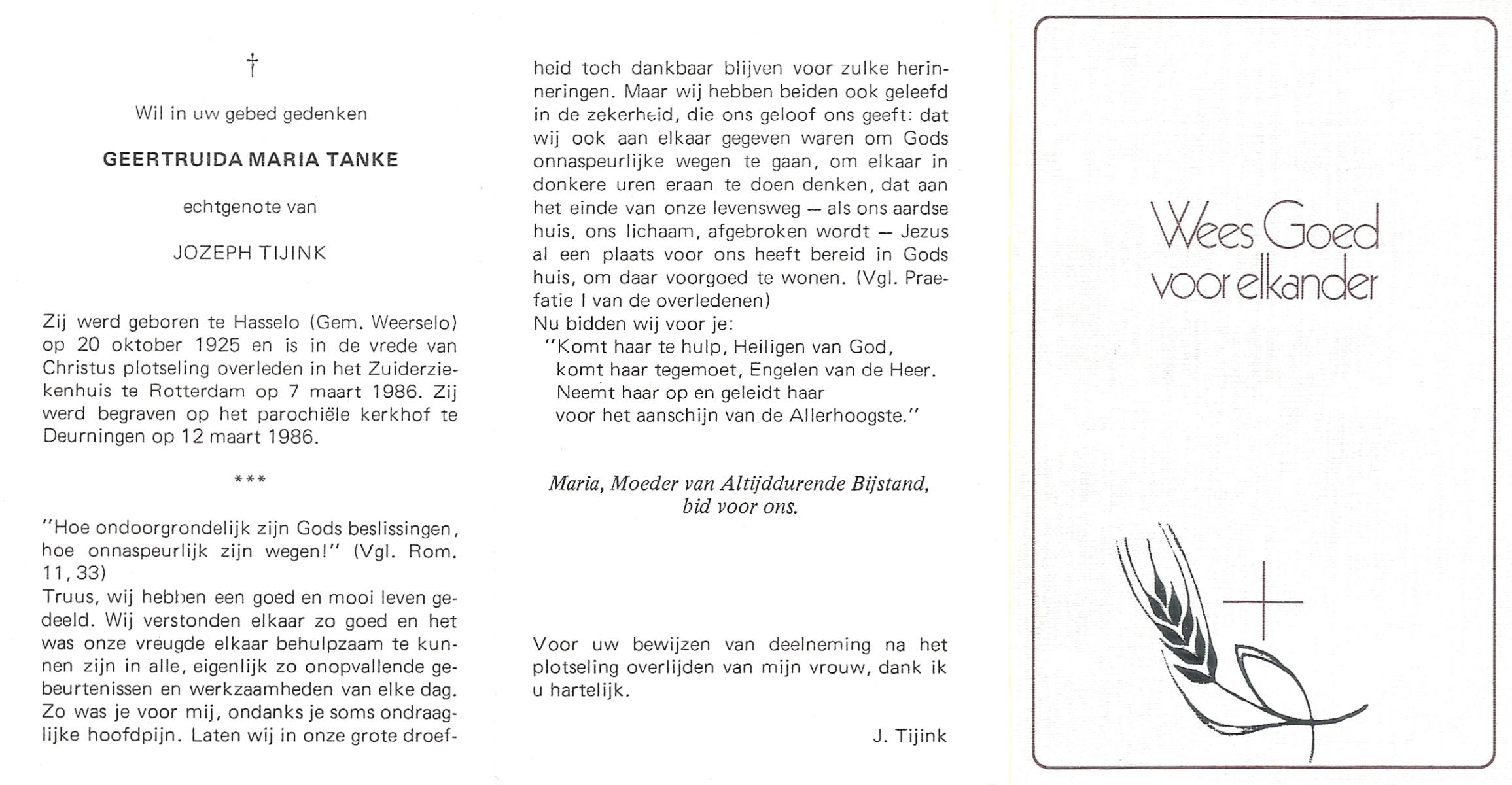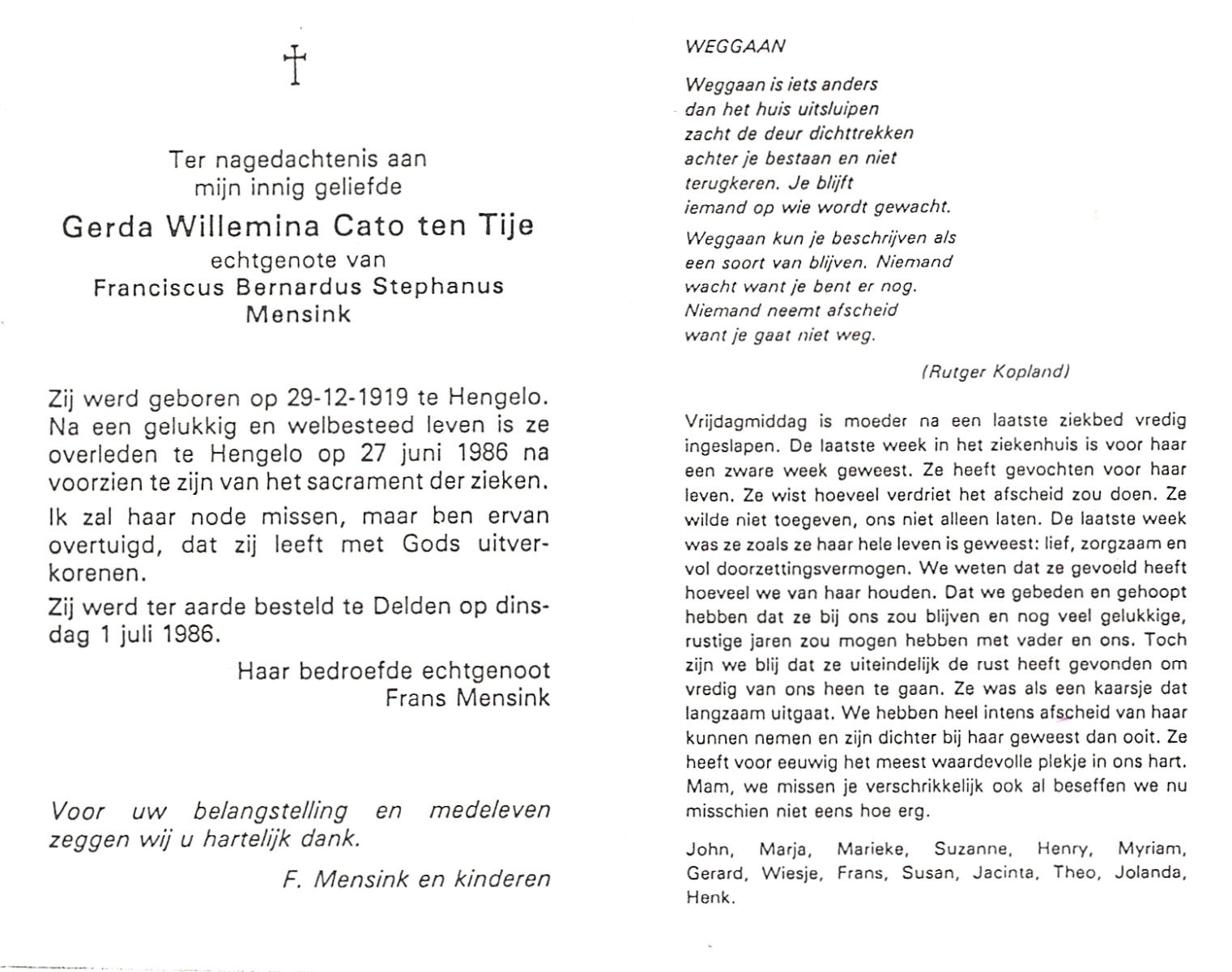 TIJE, ten, Gerda Willemina Cato, geboren op 29-12-1919 te Hengelo (O), overleden op 27-6-1986 te Hengelo (Ov.) op 66-jarige leeftijd, begraven op 1-7-1986 te Delden.