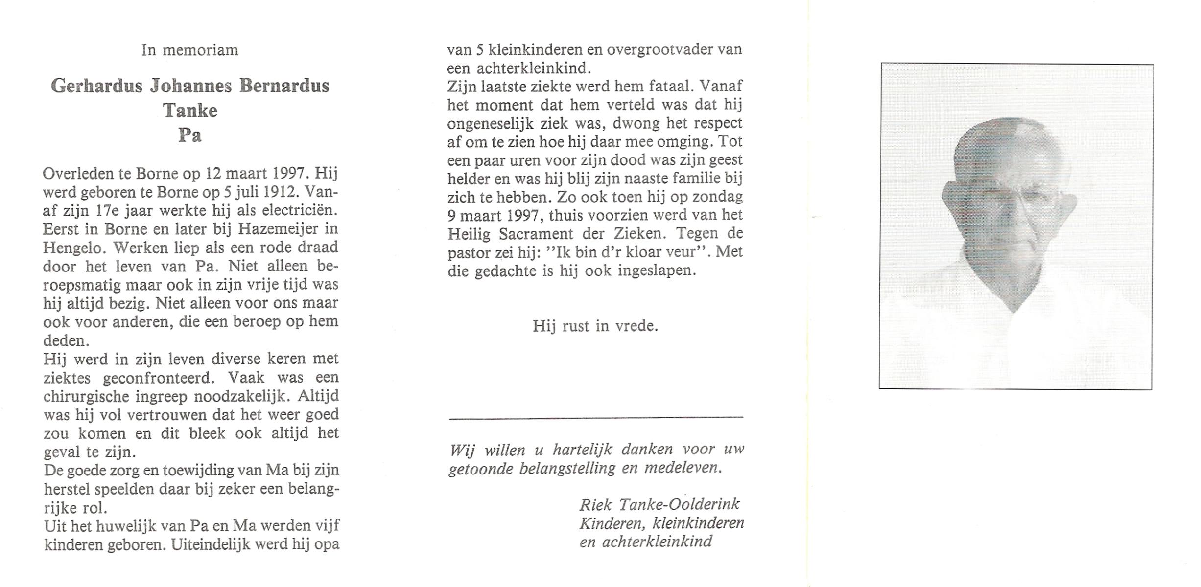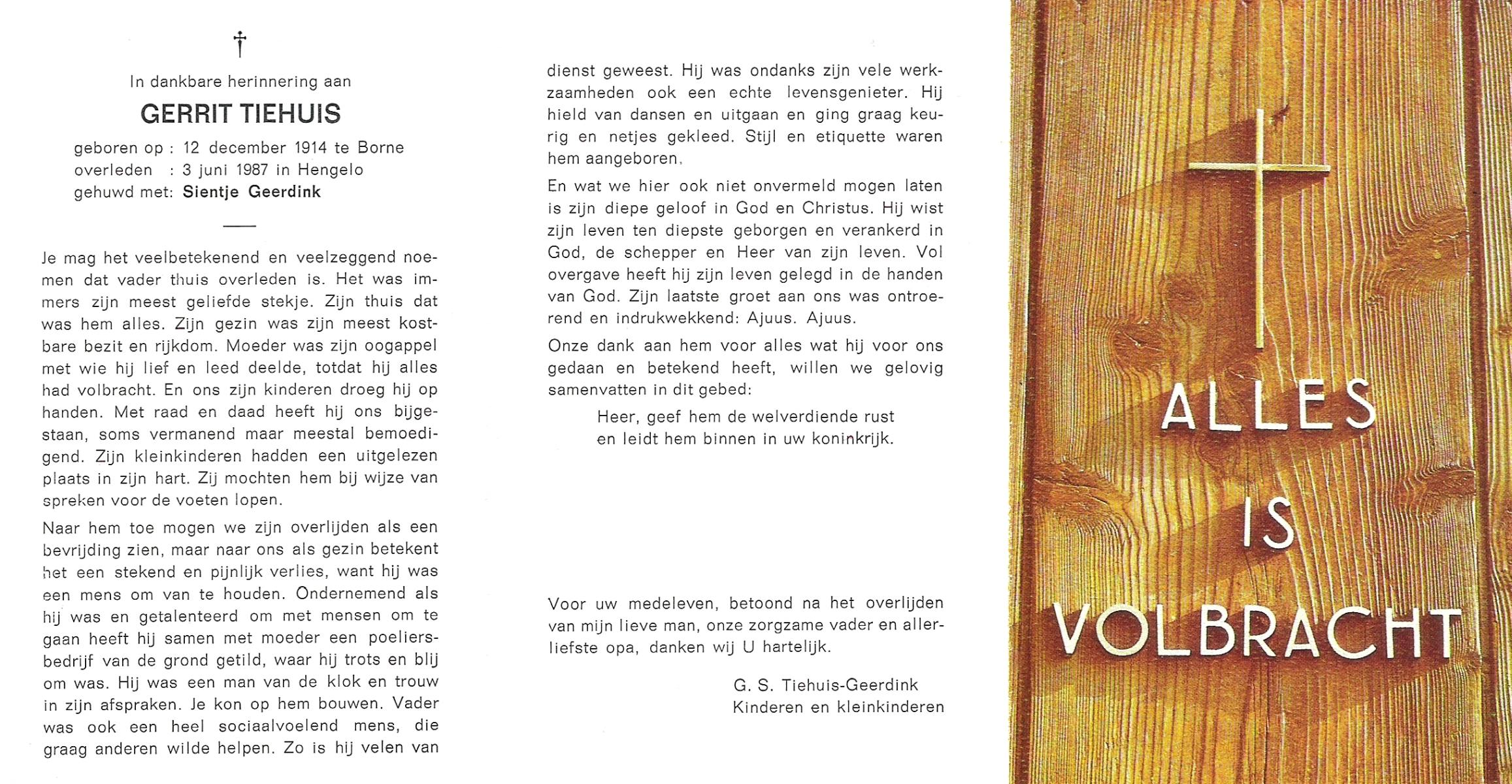 TIEHUIS, Gerrit, geboren op 12-12-1914 te Borne, overleden op 3-6-1987 te Hengelo (Ov.) op 72-jarige leeftijd.