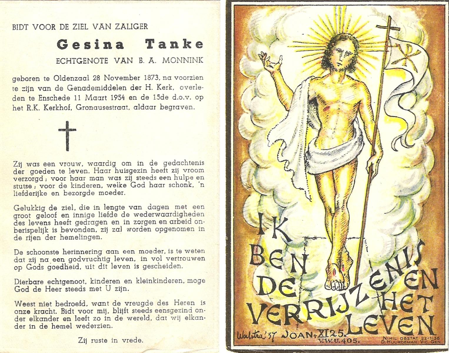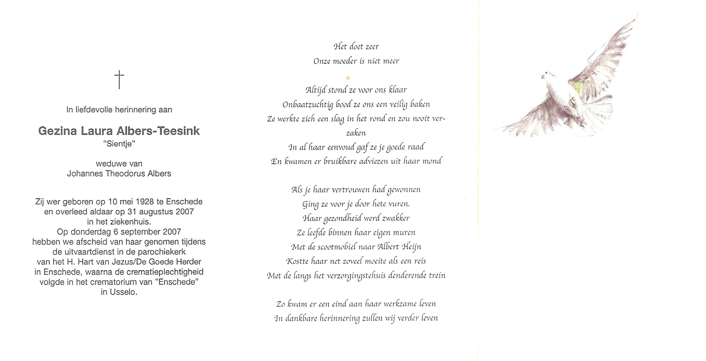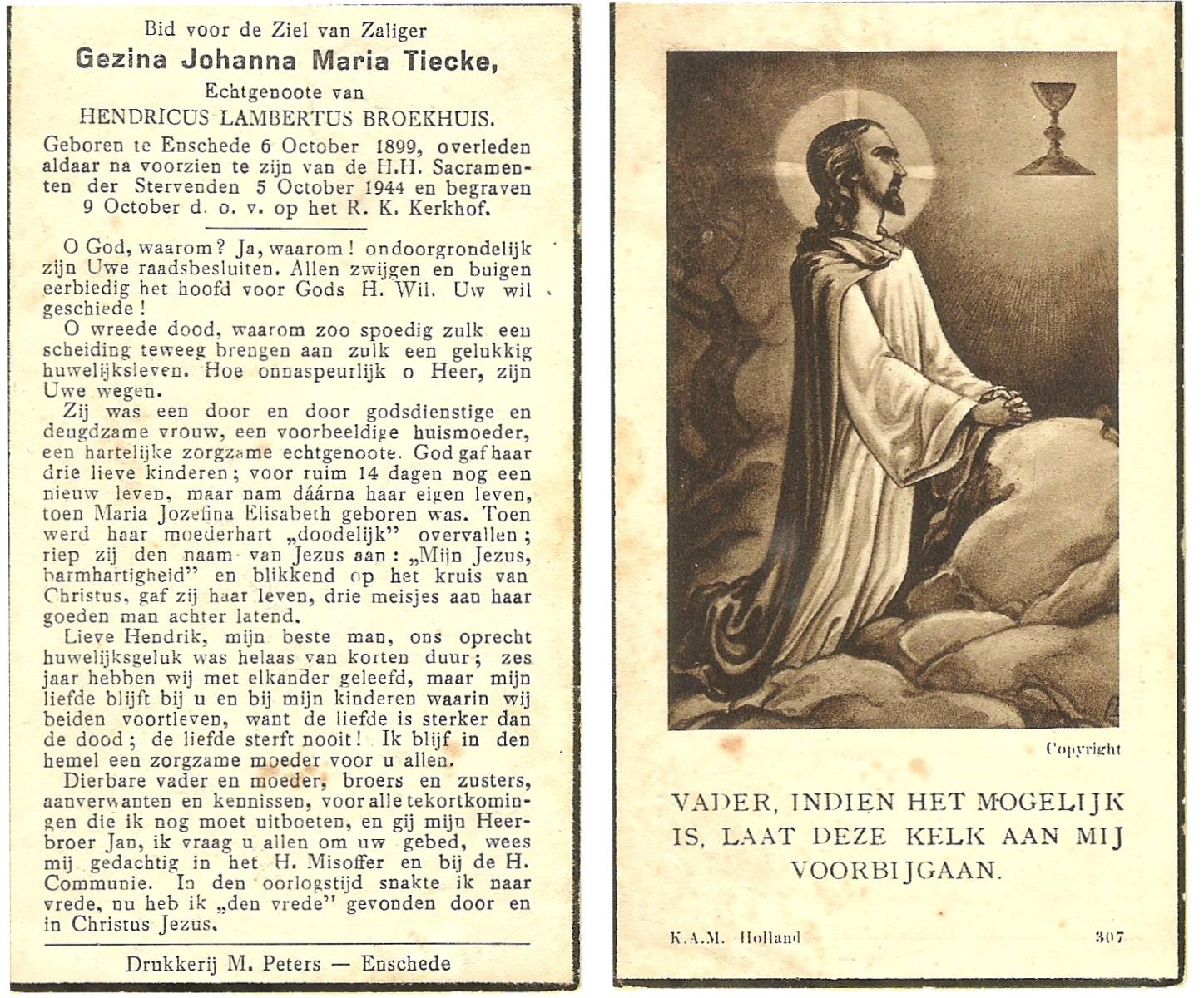 TIECKE, Gezina Johanna Maria, geboren op 06-10-1899 te Enschede, overleden op 5-10-1944 te Enschede op 44-jarige leeftijd, begraven op 9-10-1944 te Enschede.