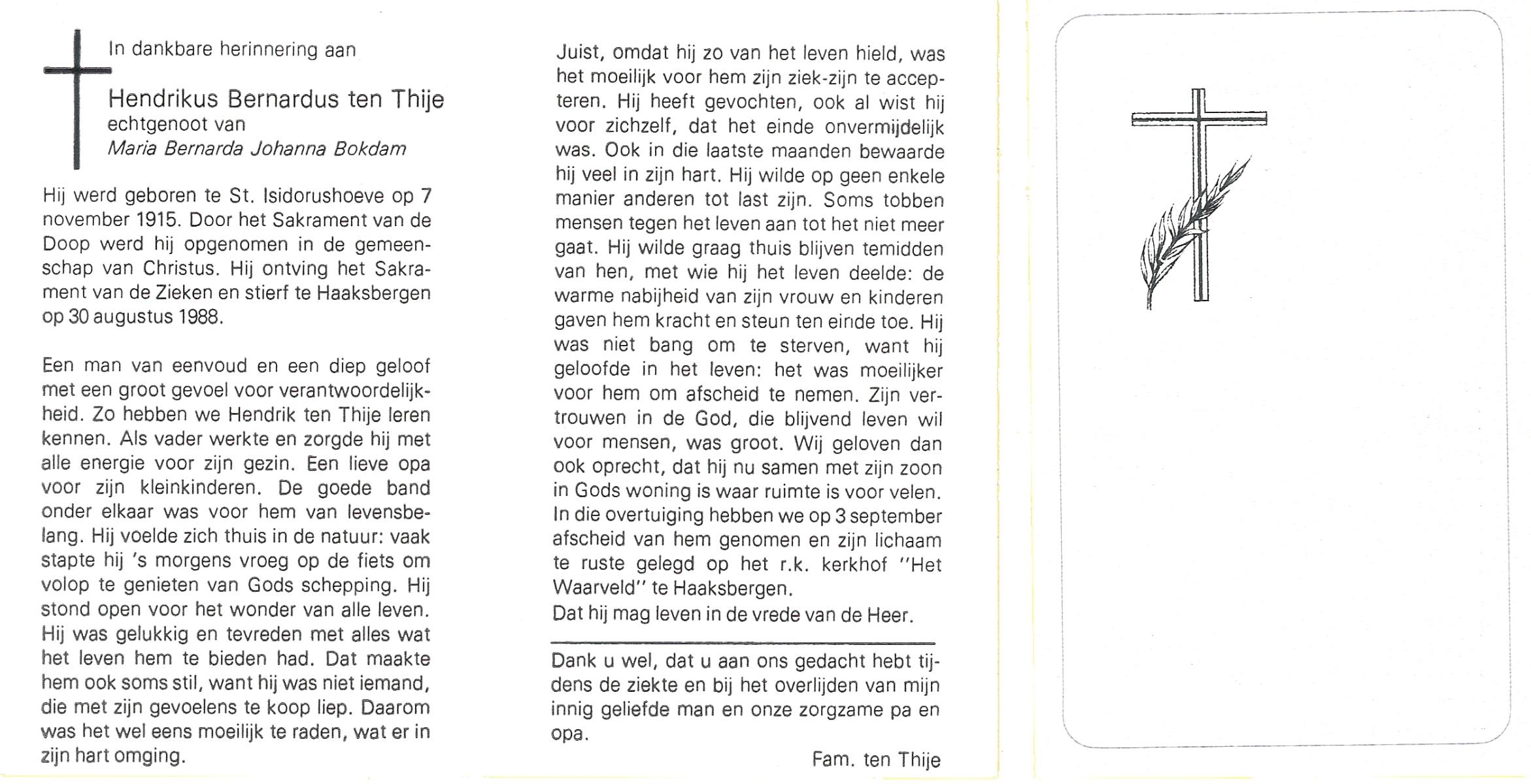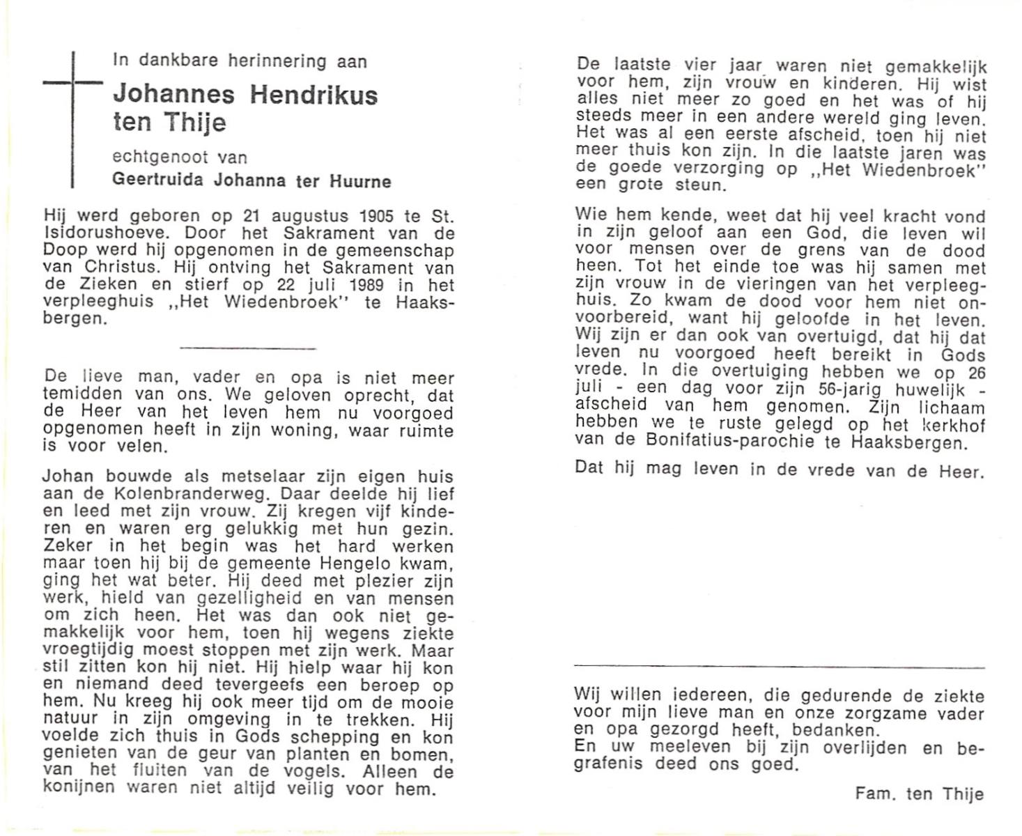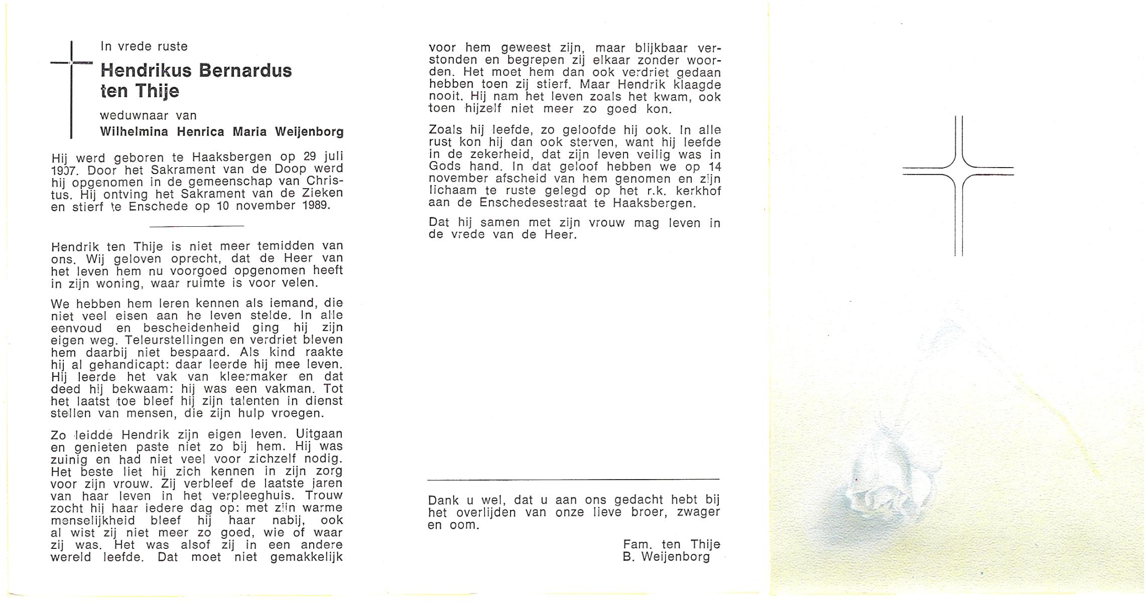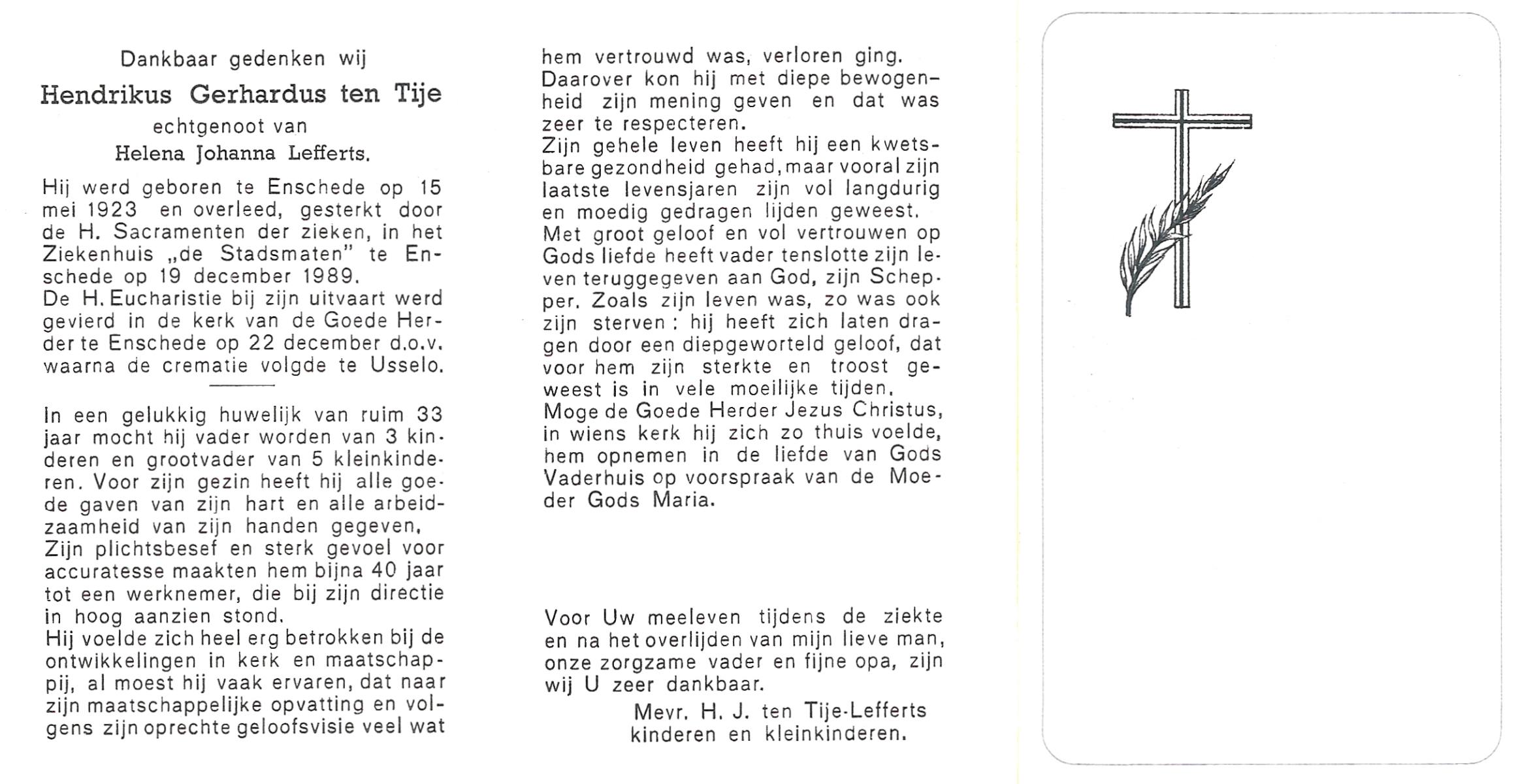 TIJE, ten, Hendrikus Gerhardus, geboren op 15-5-1923 te Enschede, overleden op 19-12-1989 te Enschede op 66-jarige leeftijd, gecremeerd op 22-12-1989 te Usselo.