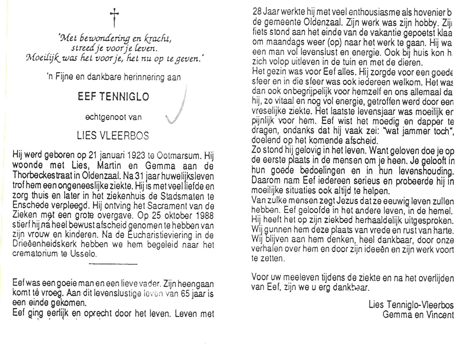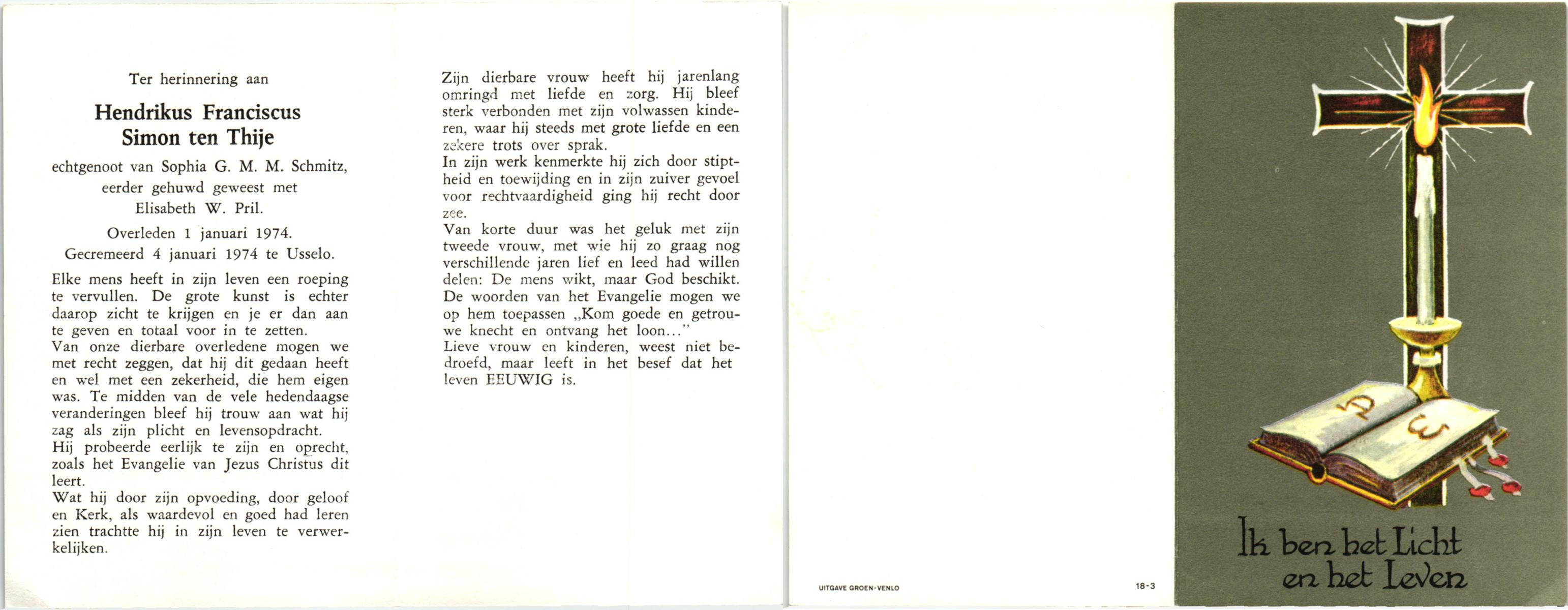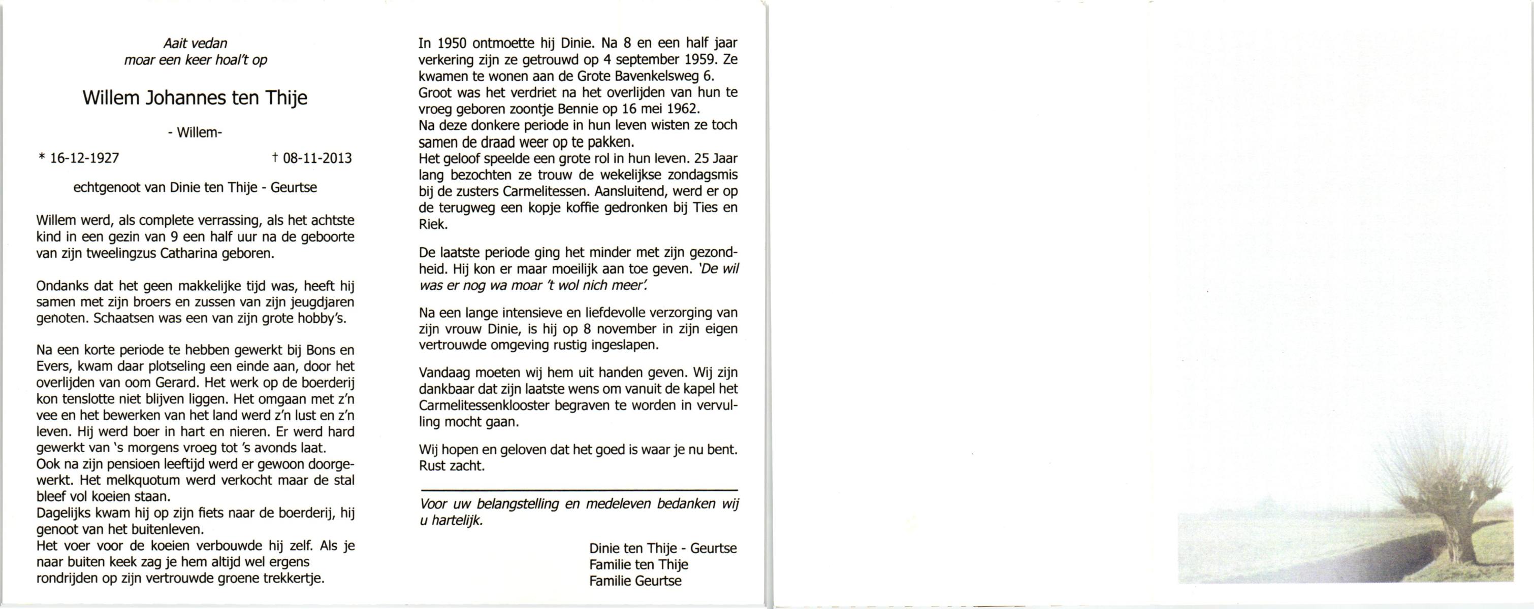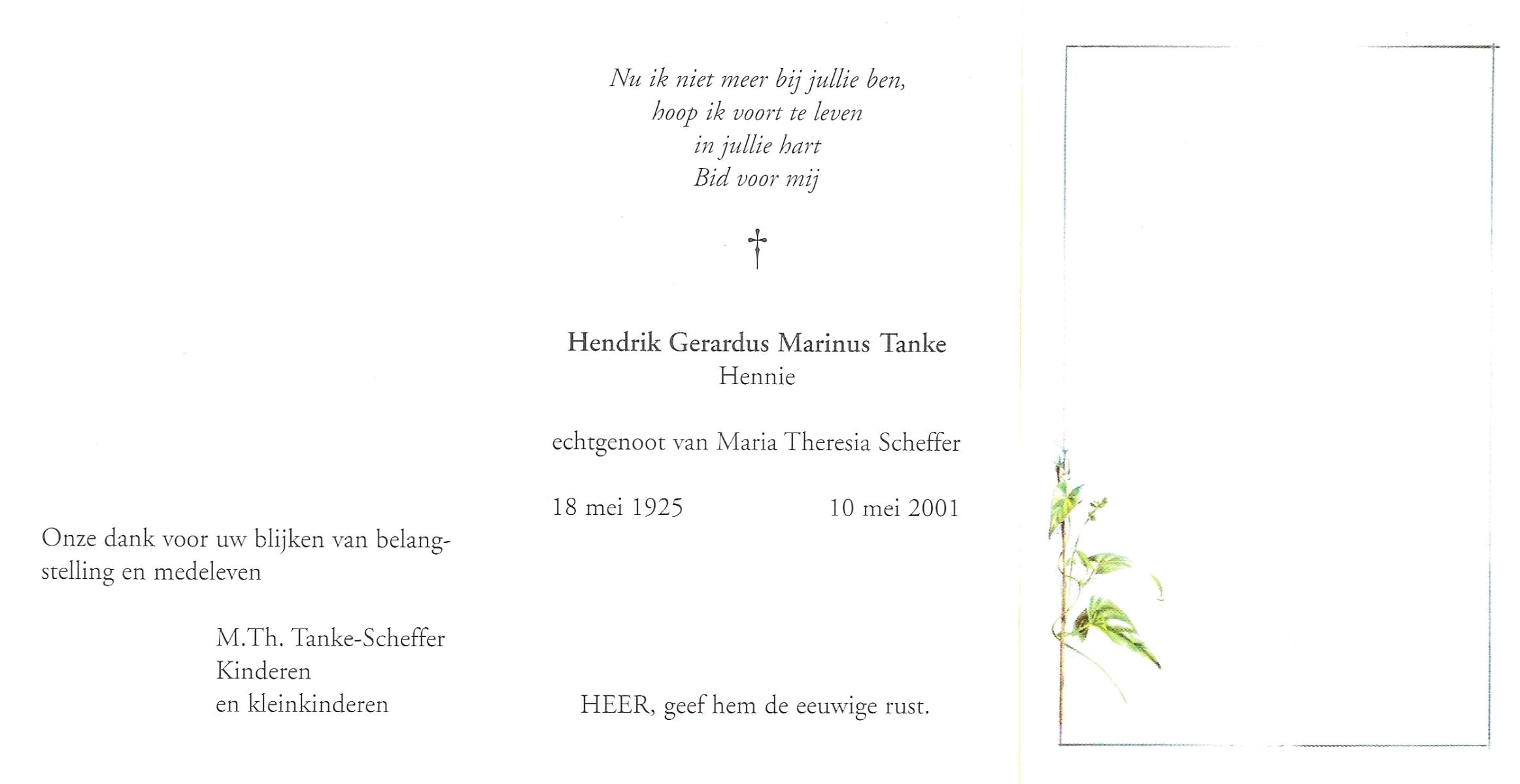 TIJE, ten, Hendrikus Gerhardus, geboren op 15-5-1923 te Enschede, overleden op 19-12-1989 te Enschede op 66-jarige leeftijd, gecremeerd op 22-12-1989 te Usselo.