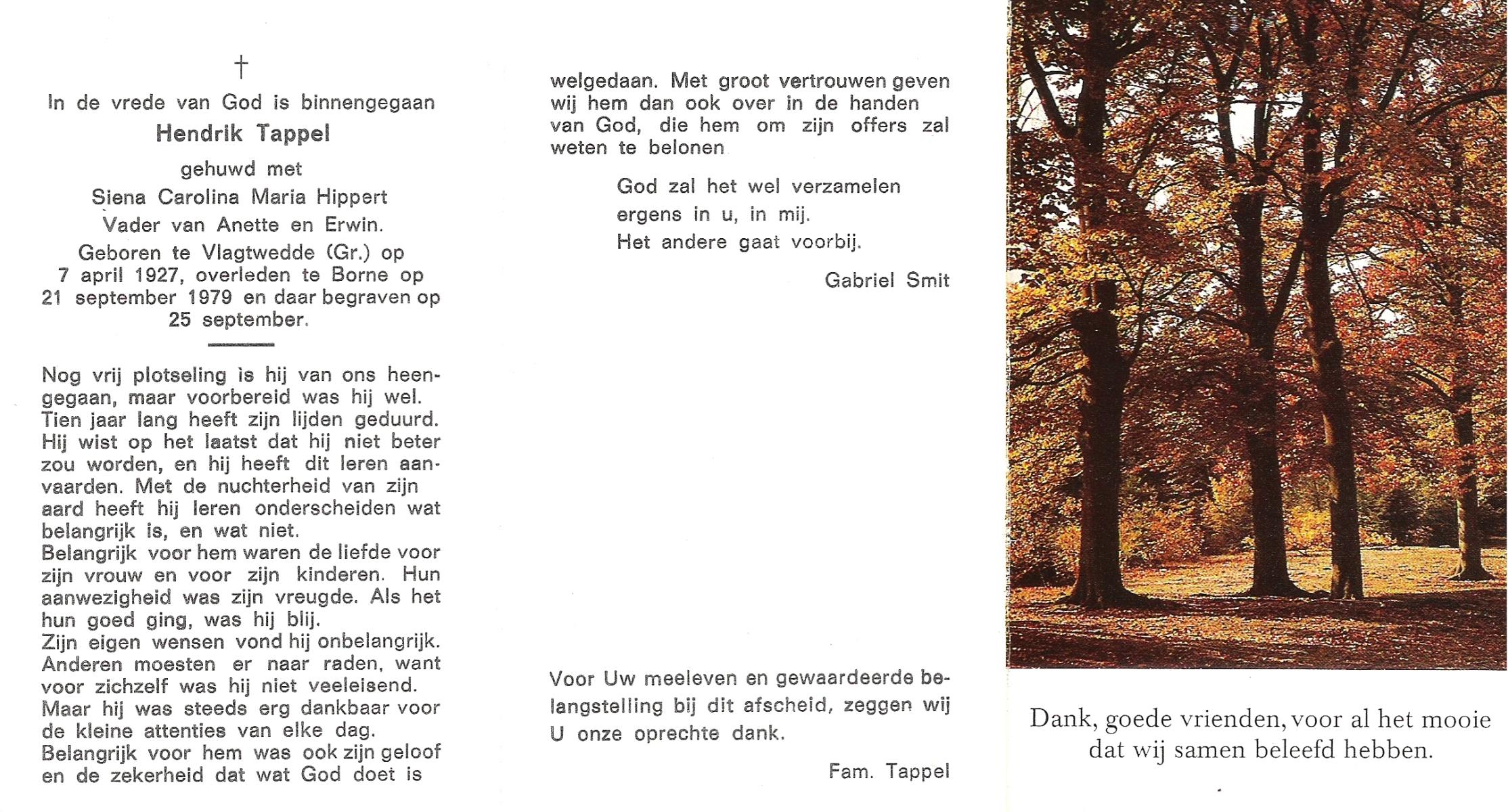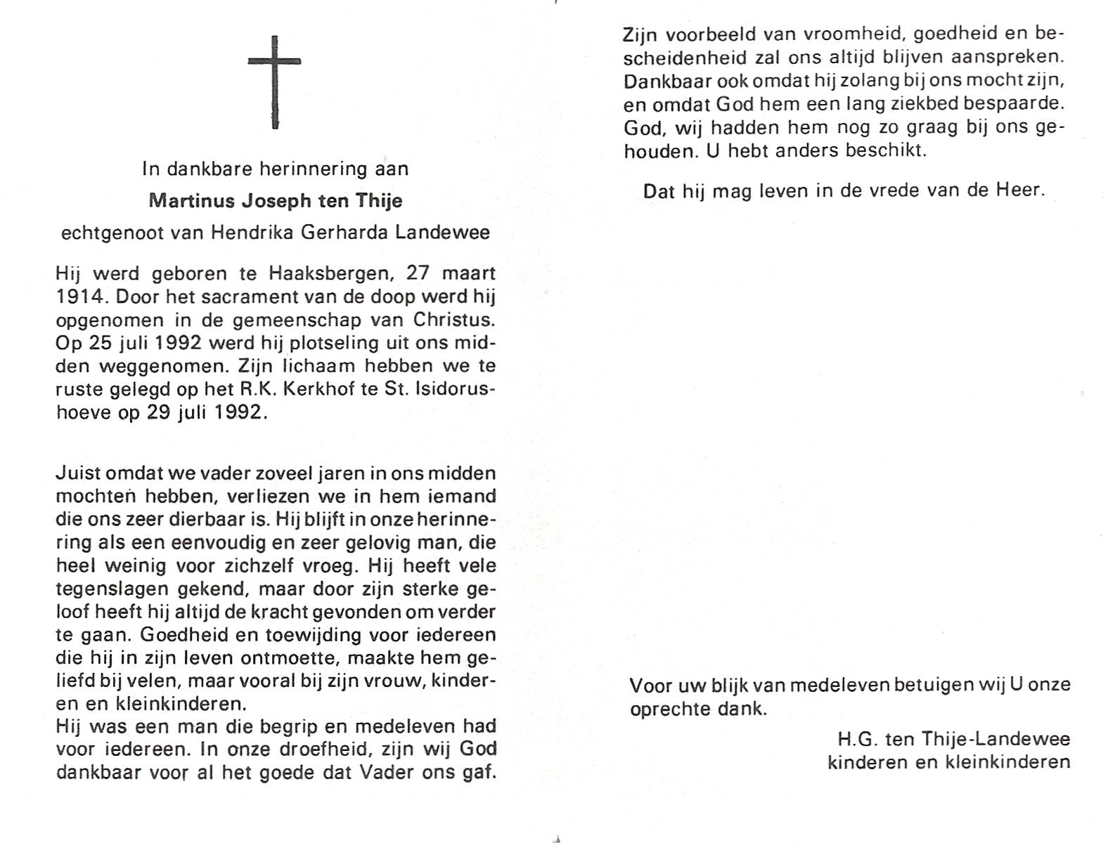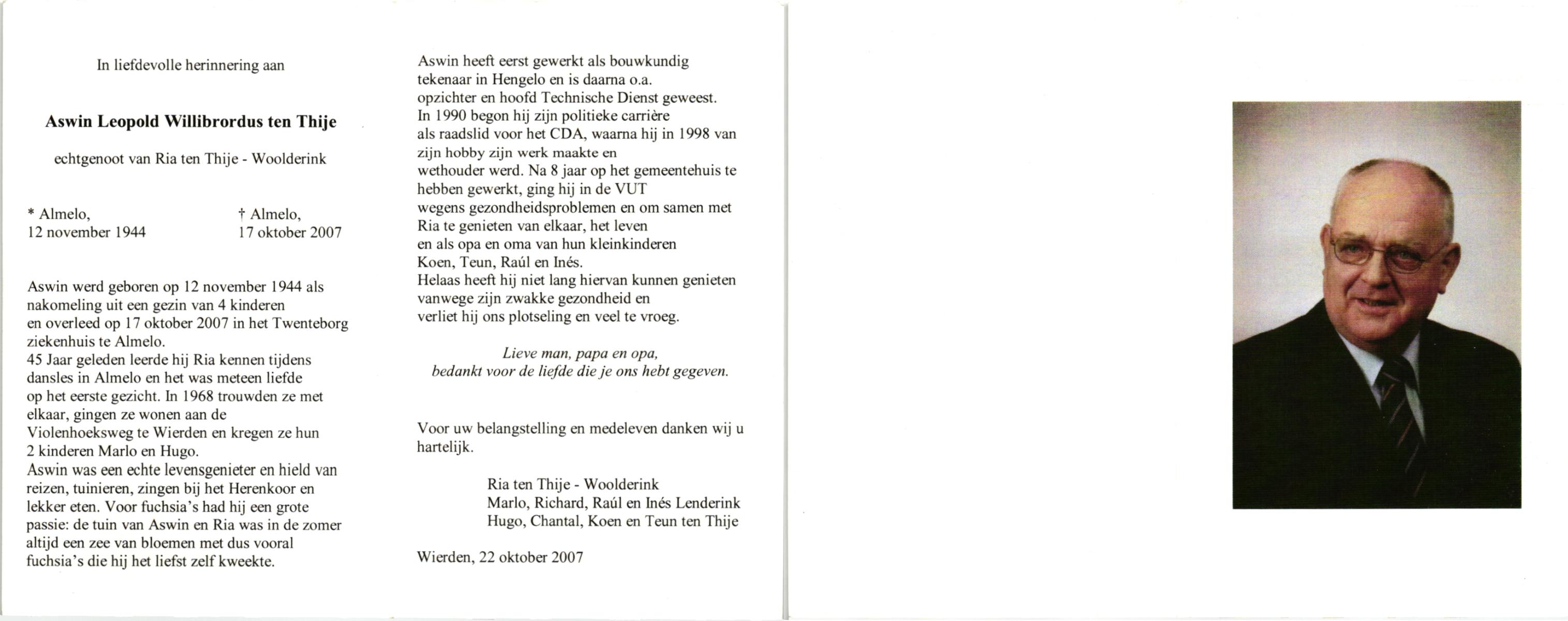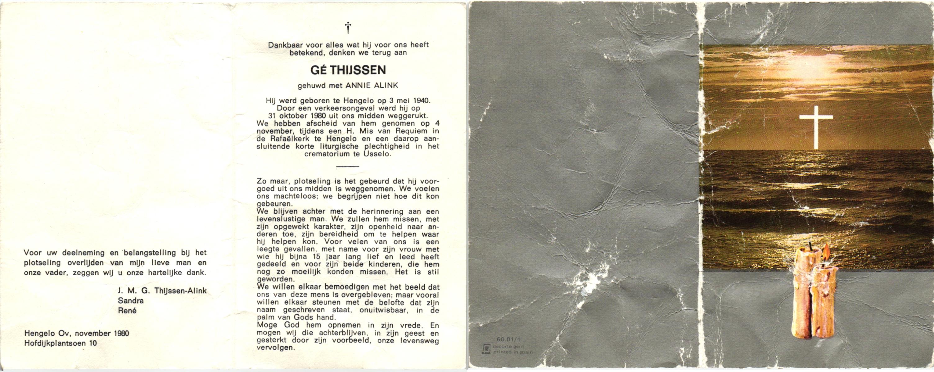 TIJE, ten, Hendrikus Gerhardus, geboren op 15-5-1923 te Enschede, overleden op 19-12-1989 te Enschede op 66-jarige leeftijd, gecremeerd op 22-12-1989 te Usselo.