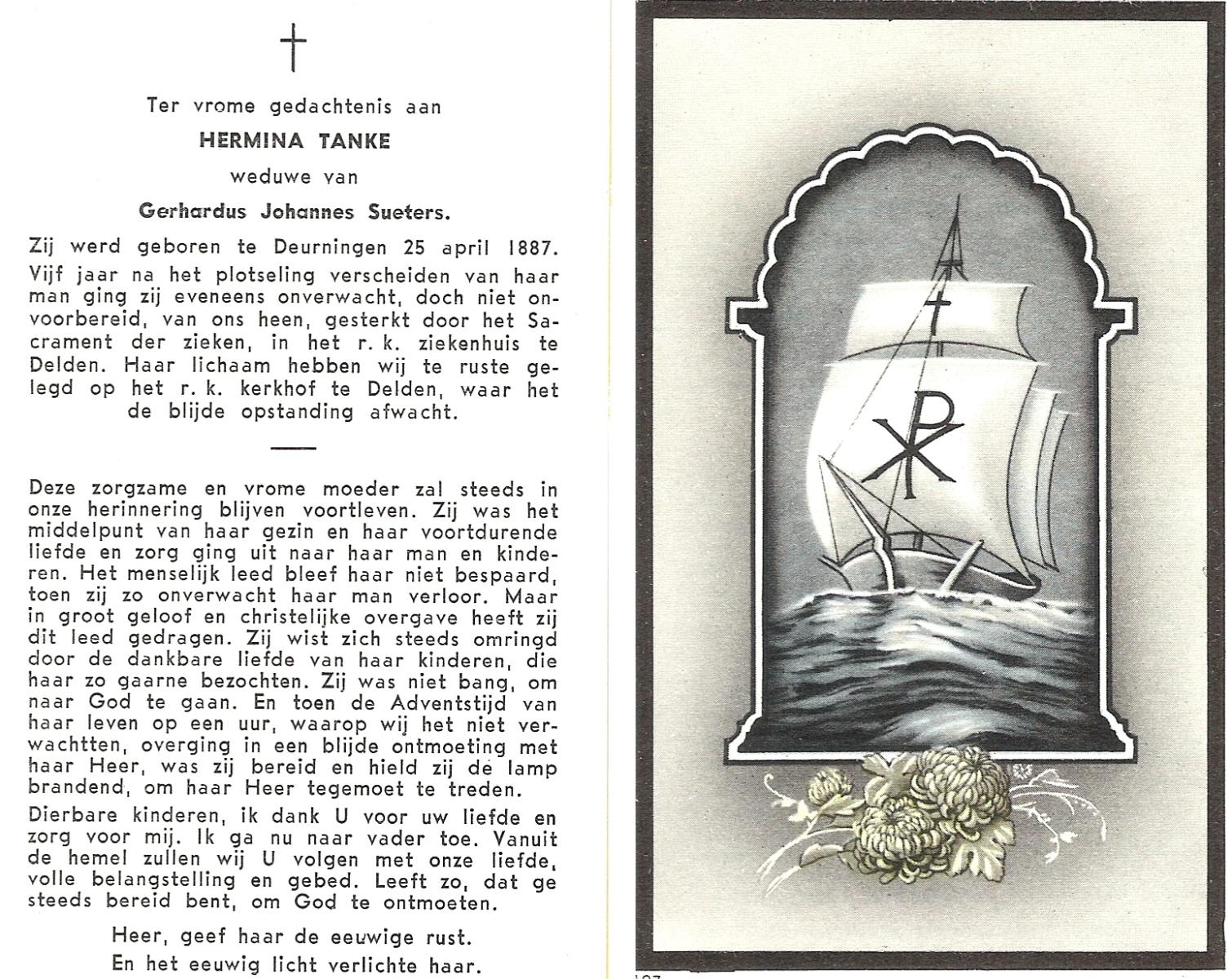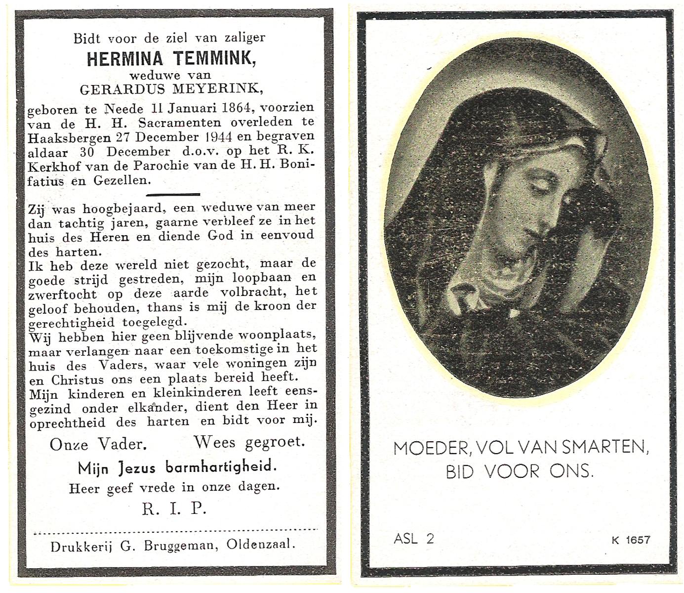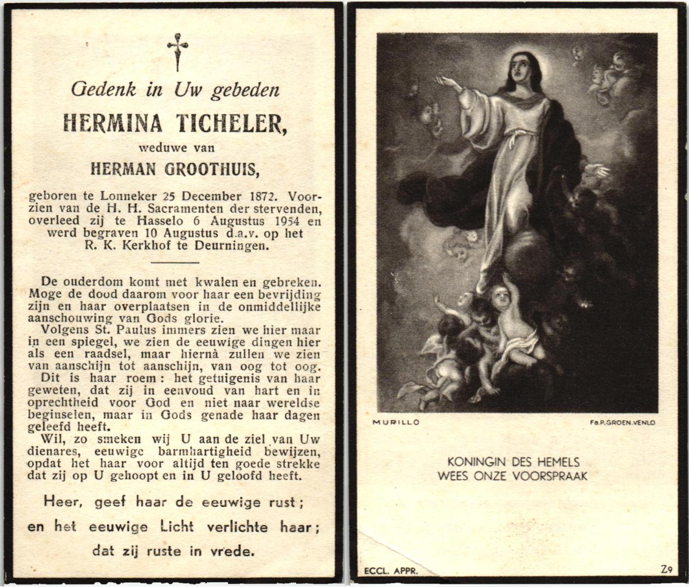 TICHELER, Hermina, geboren op 25-12-1872 te Lonneker, overleden op 6-8-1954 te Hasselo op 81-jarige leeftijd, begraven op 10-8-1954 te Deurningen.