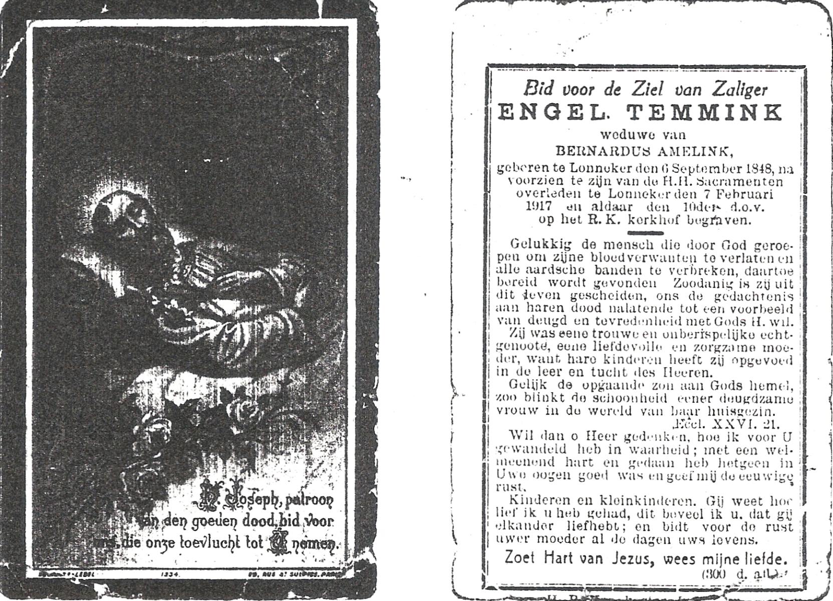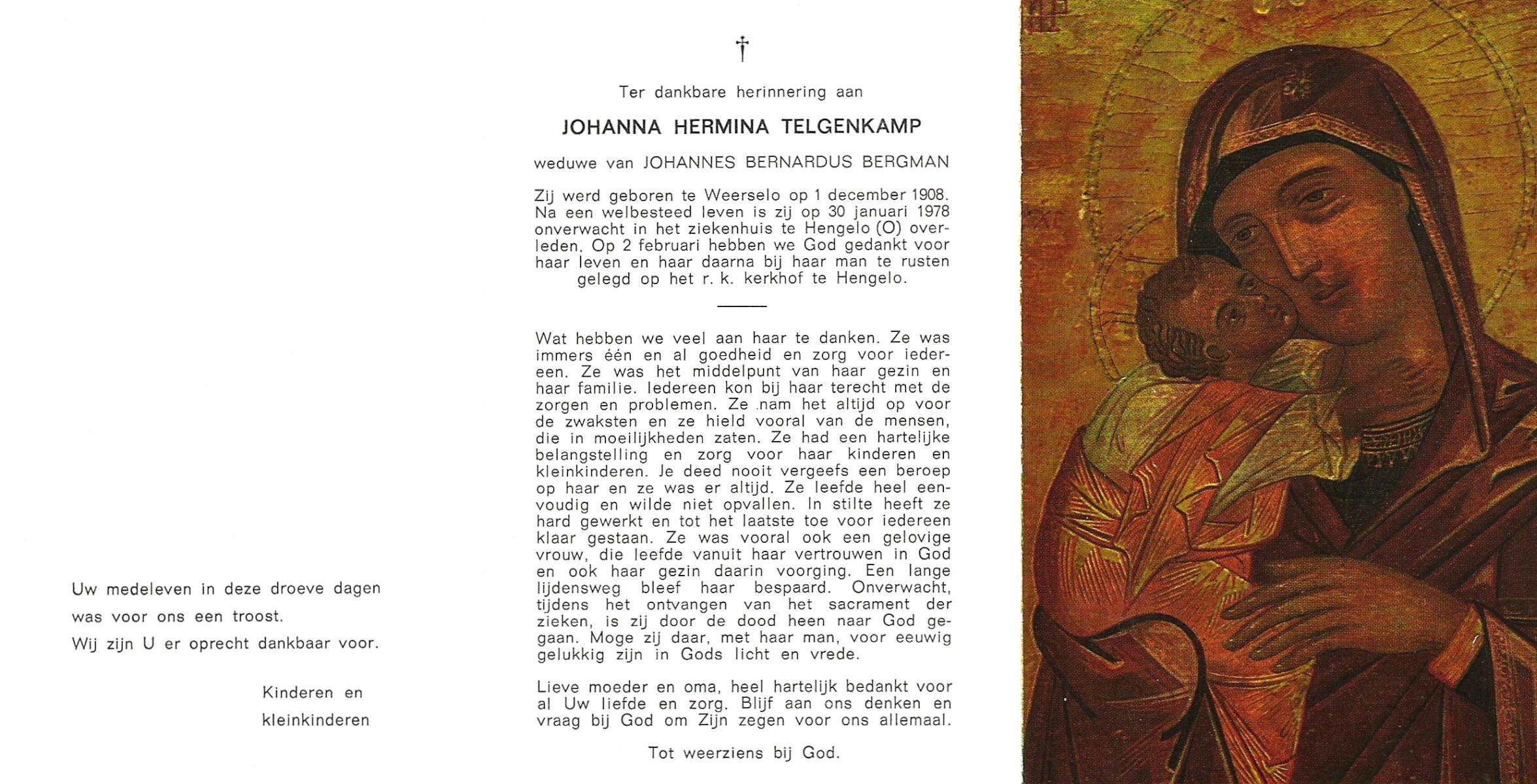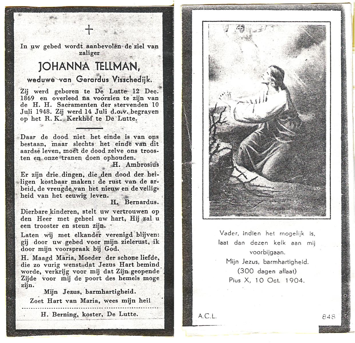 TICHELER, Hermina, geboren op 25-12-1872 te Lonneker, overleden op 6-8-1954 te Hasselo op 81-jarige leeftijd, begraven op 10-8-1954 te Deurningen.