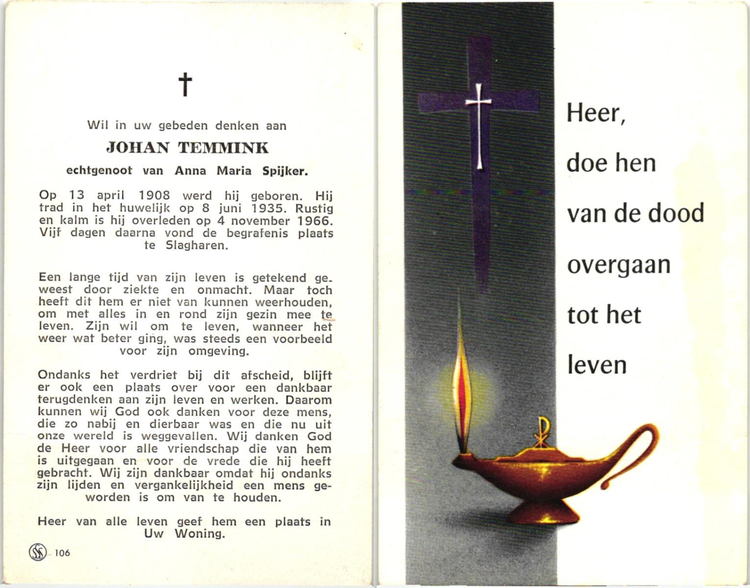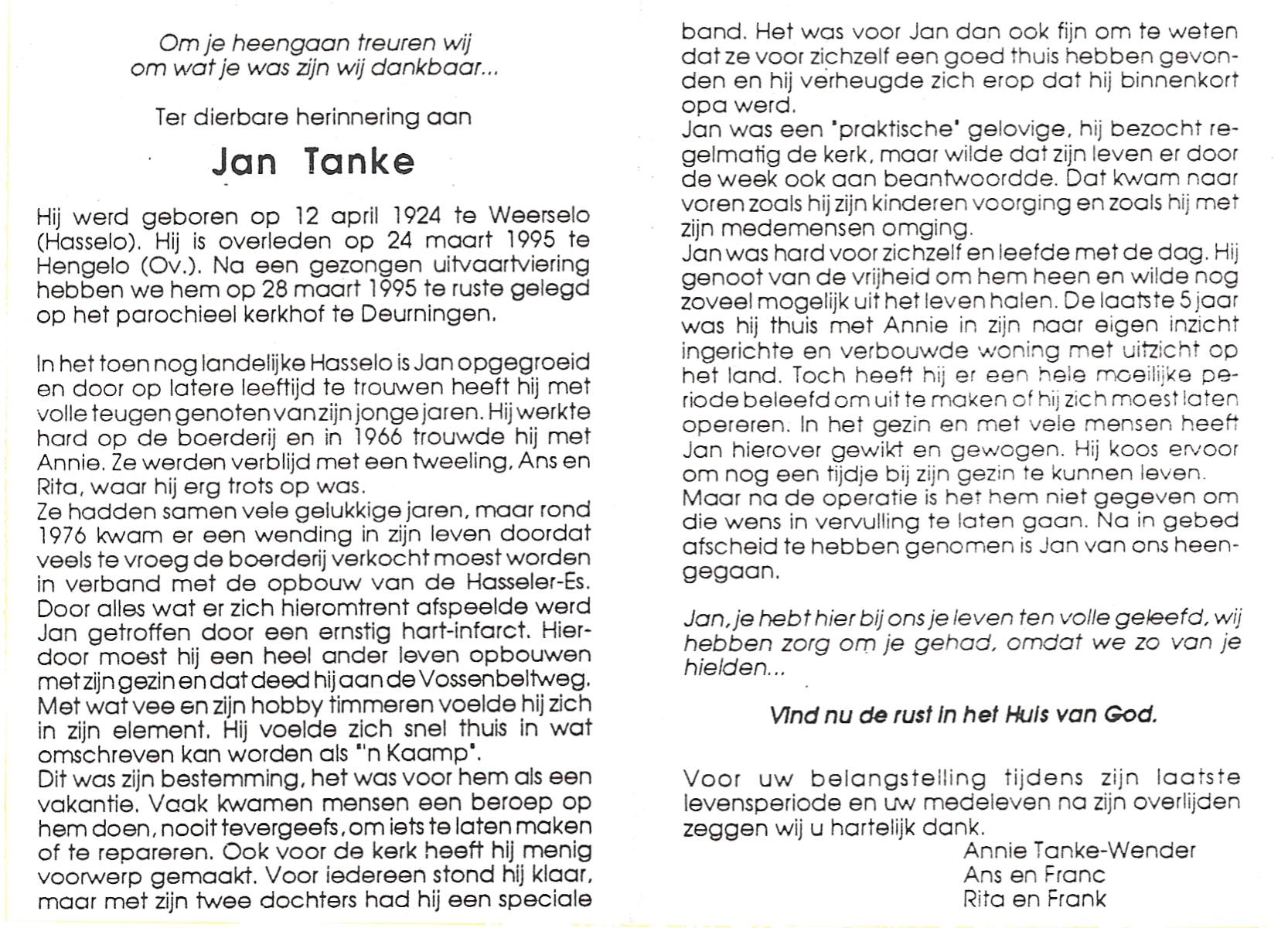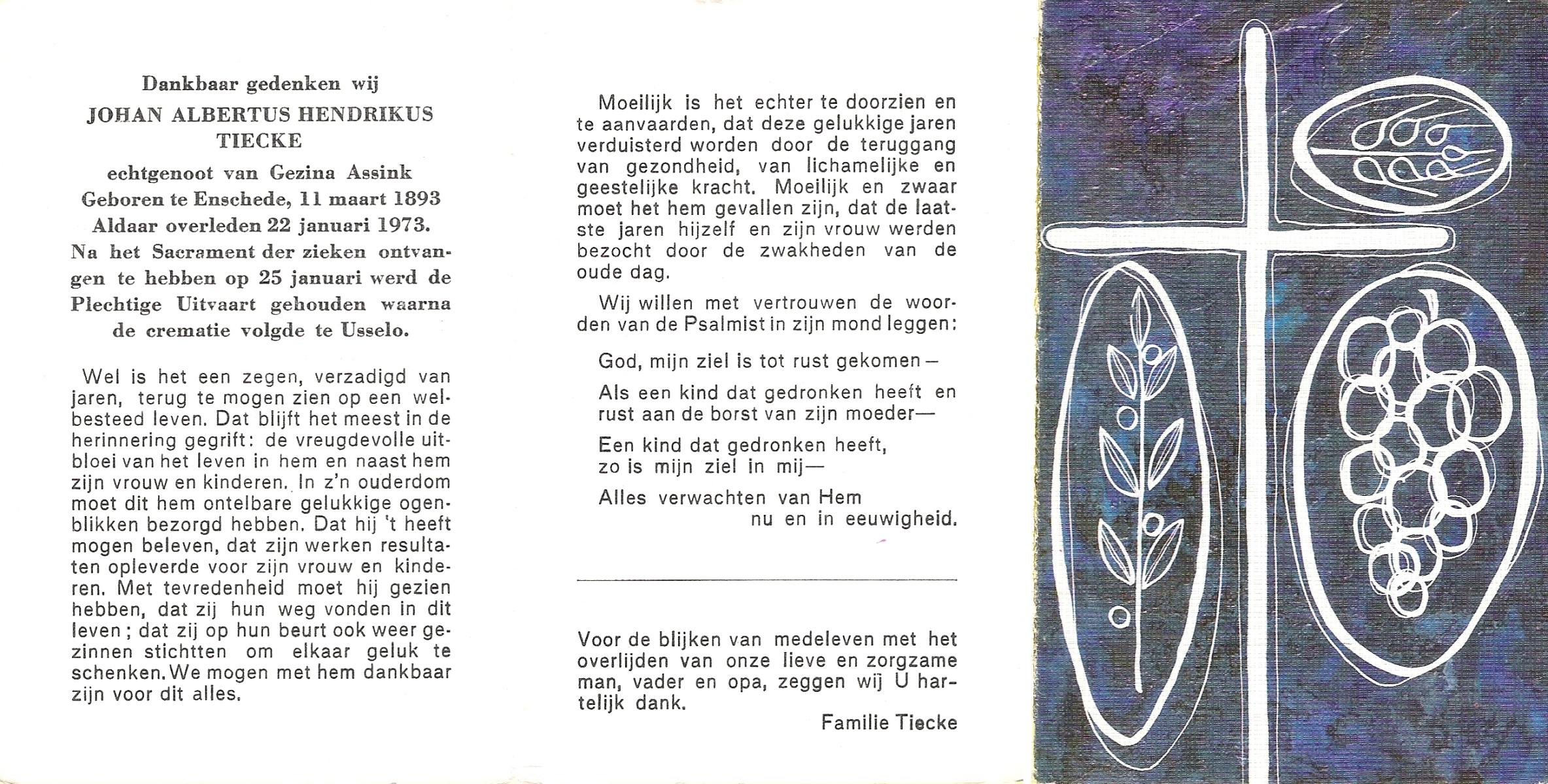 TIECKE, Johan Albertus Hendrikus, geboren op 11-03-1893 te Enschede, overleden op 22-1-1973 te Enschede op 79-jarige leeftijd, gecremeerd op 25-1-1973 te Usselo.