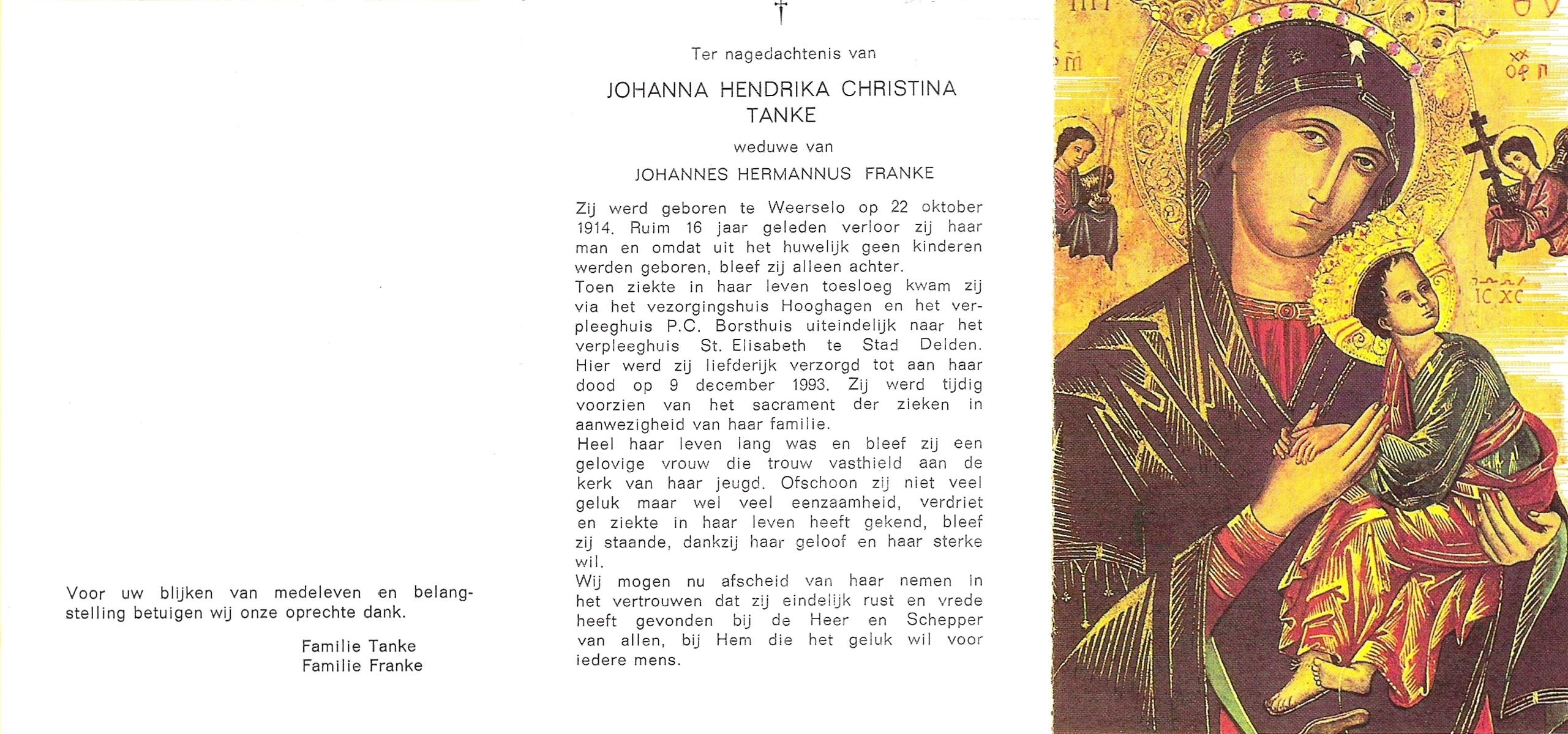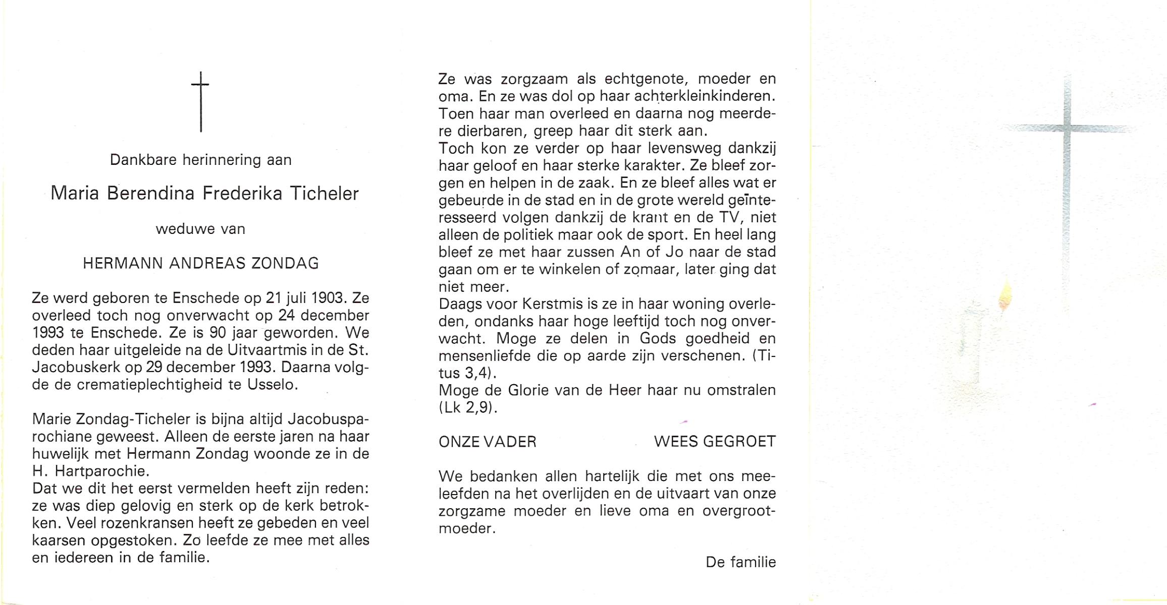 TICHELER, Maria Berendina Frederika, geboren op 21-7-1903 te Enschede, overleden op 24-12-1993 te Enschede op 90-jarige leeftijd, gecremeerd op 29-12-1993 te Usselo.