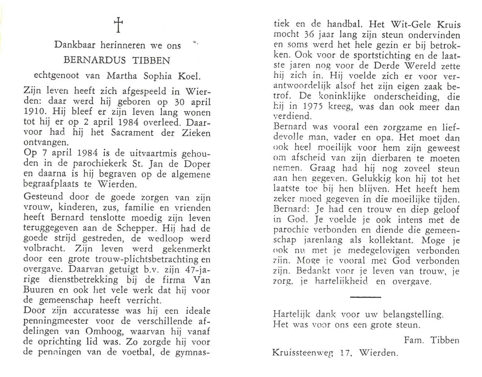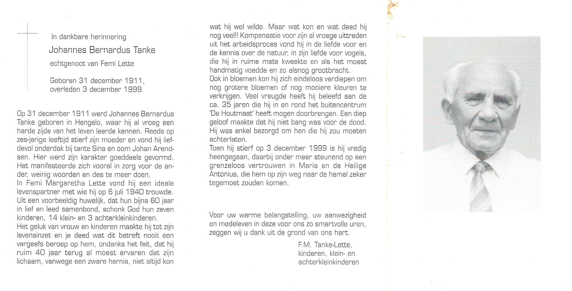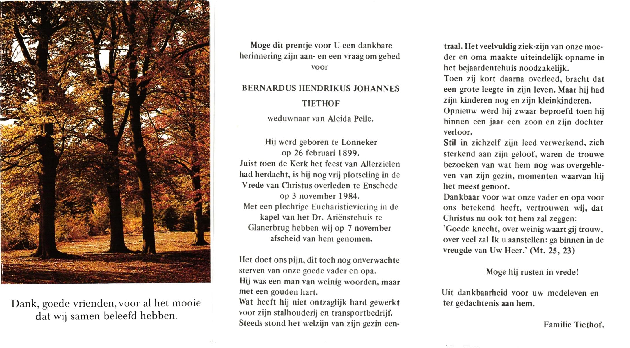 TIETHOF, Bernardus Hendrikus Johannes, geboren op 26-02-1899 te Lonneker, overleden op 3-11-1984 te Enschede op 85-jarige leeftijd, begraven op 7-11-1984 te Glanerbrug.