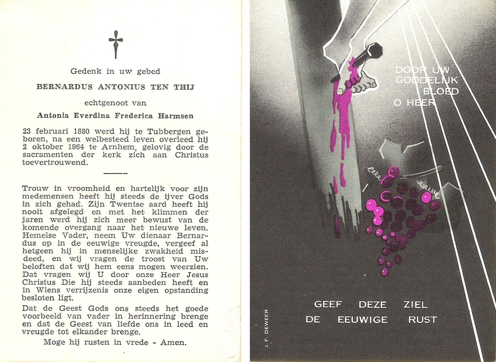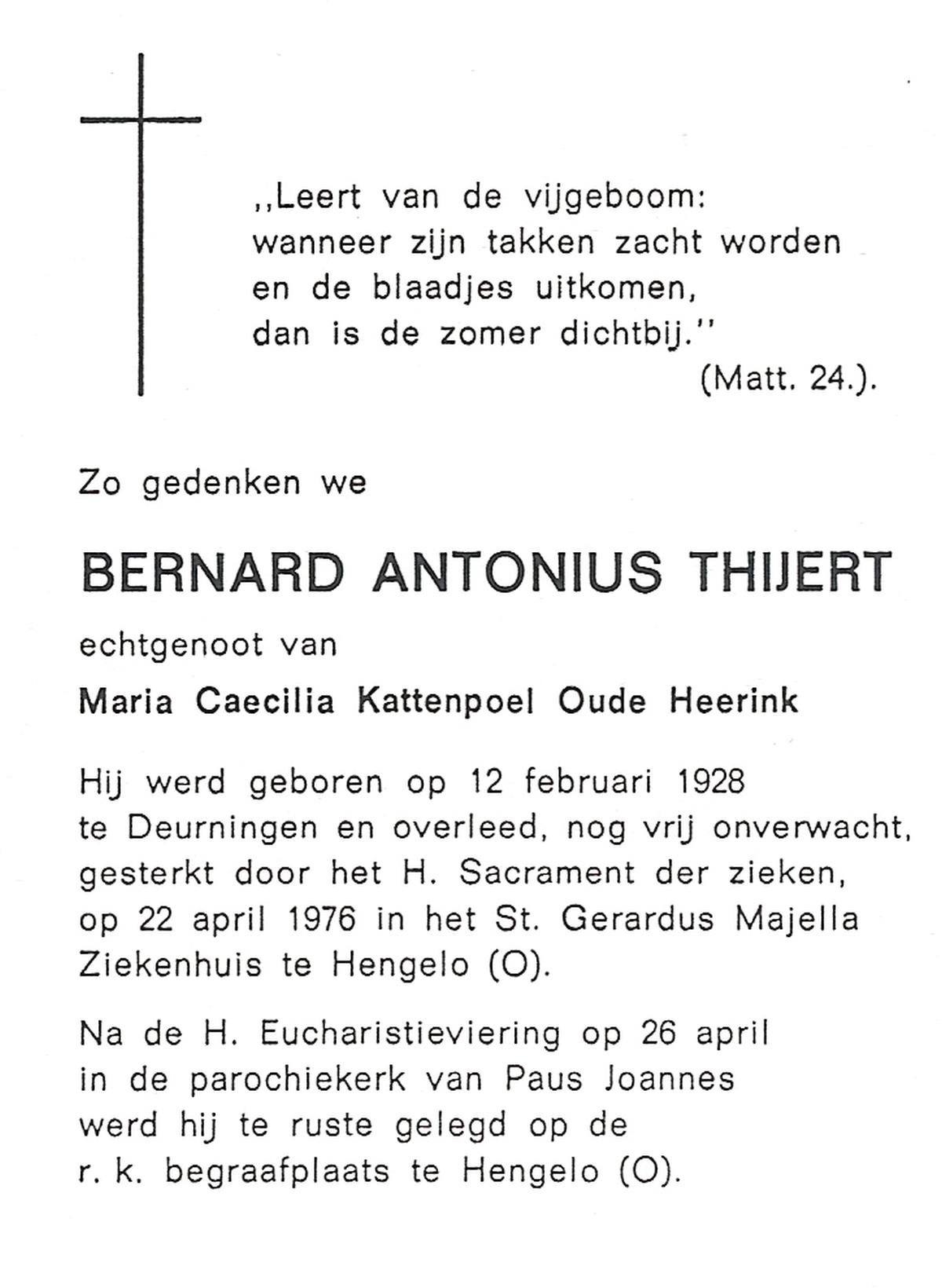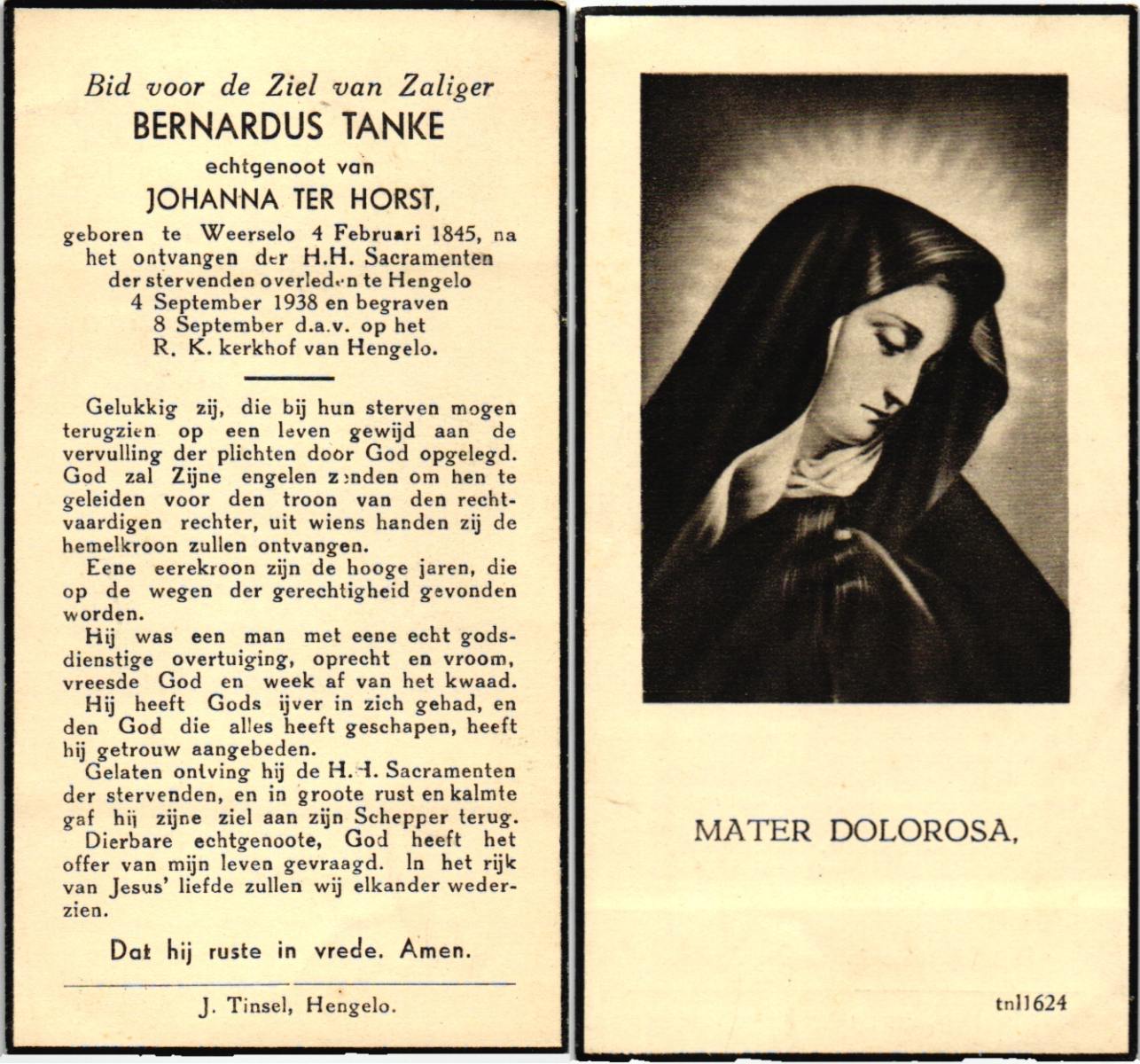 TIETHOF, Bernardus Hendrikus Johannes, geboren op 26-02-1899 te Lonneker, overleden op 3-11-1984 te Enschede op 85-jarige leeftijd, begraven op 7-11-1984 te Glanerbrug.