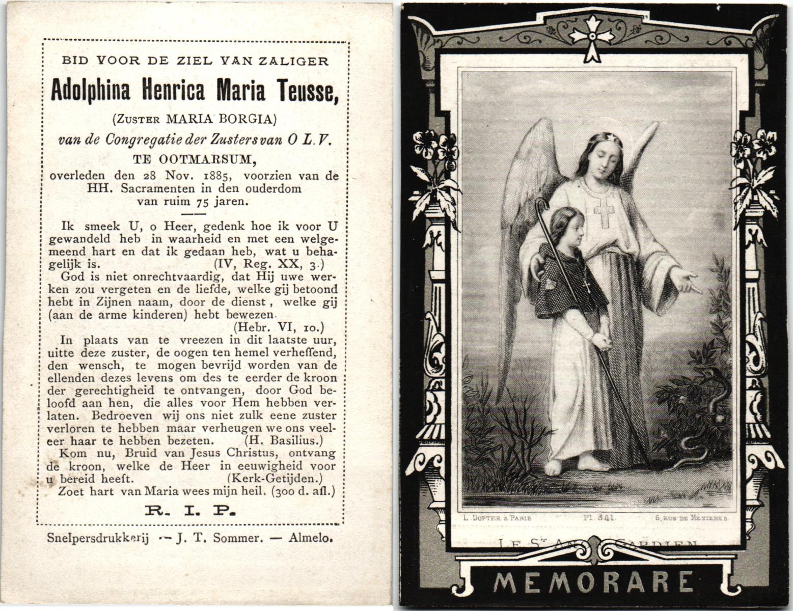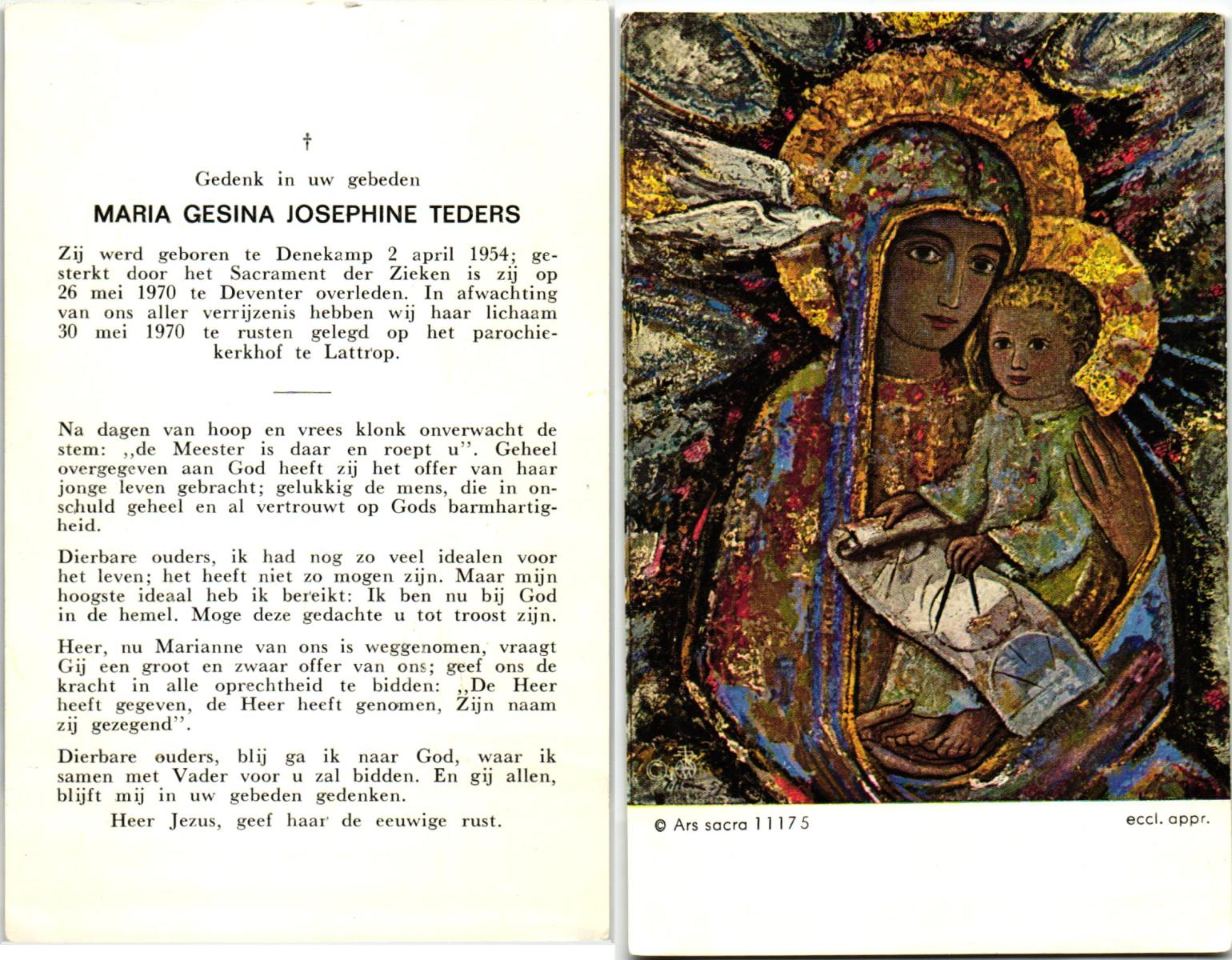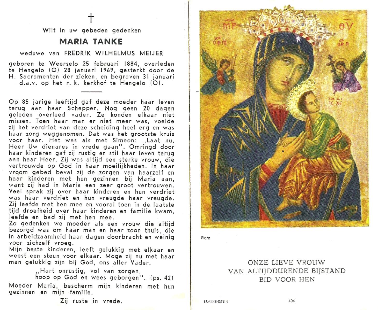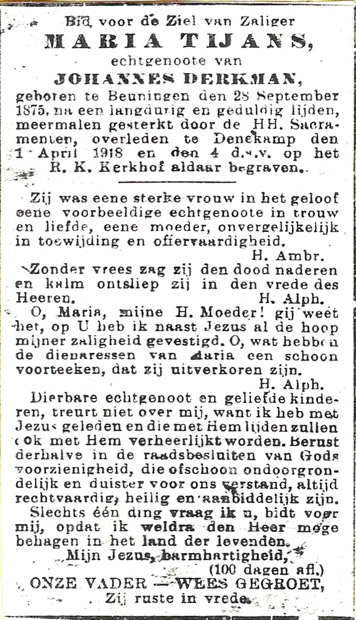 TIJANS, Maria, geboren op 28-09-1875 te Beuningen (Ov.), overleden op 1-4-1918 te Denekamp op 42-jarige leeftijd, begraven op 4-4-1918 te Denekamp R.K.kerkhof.