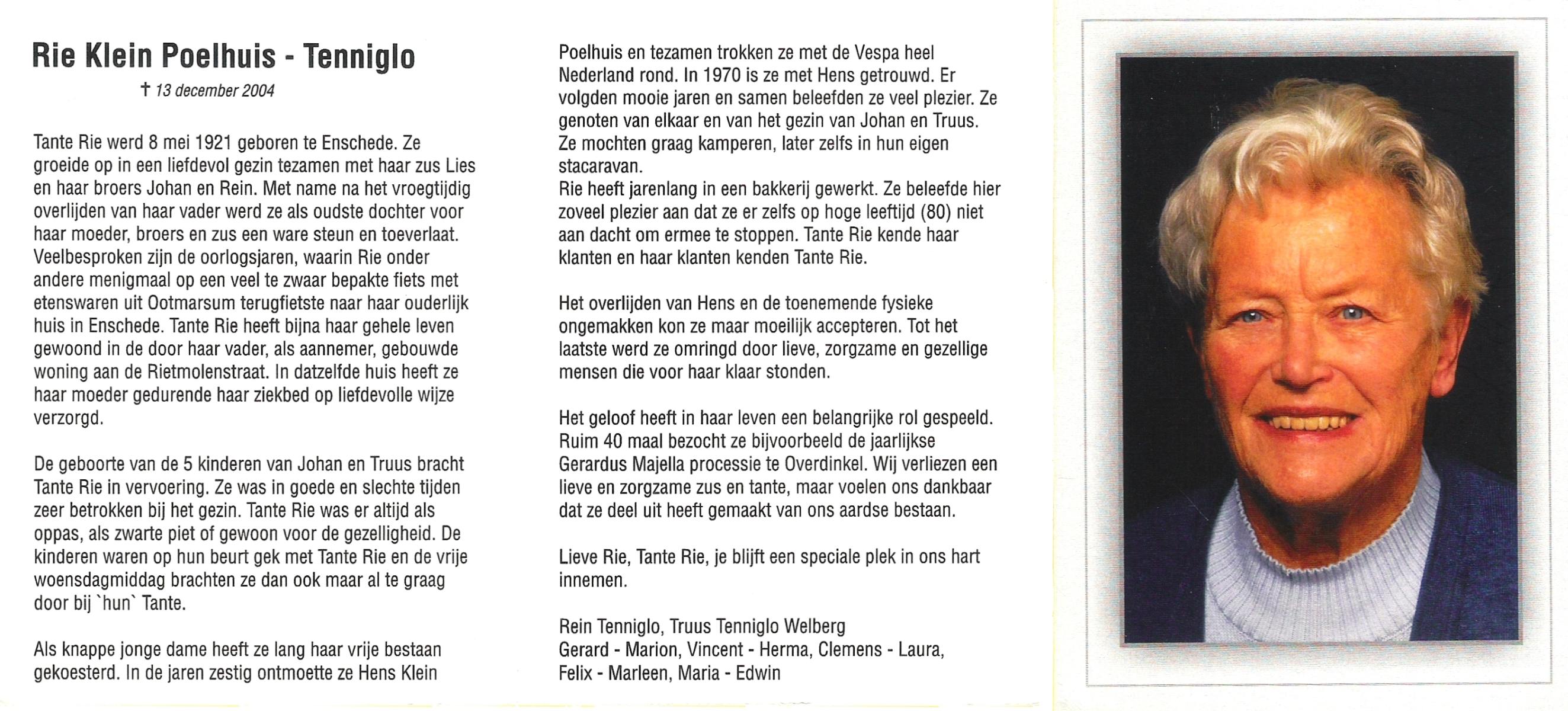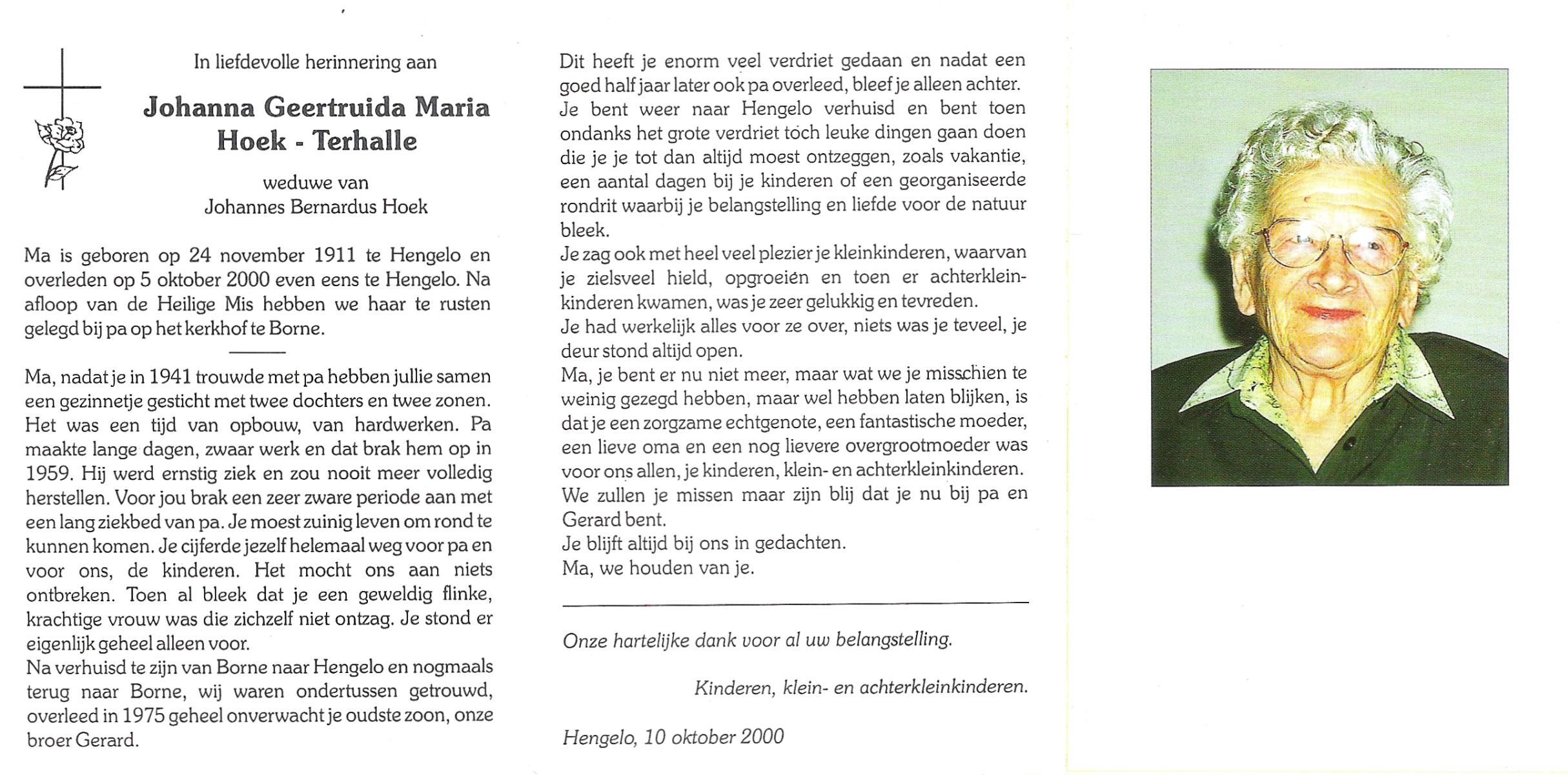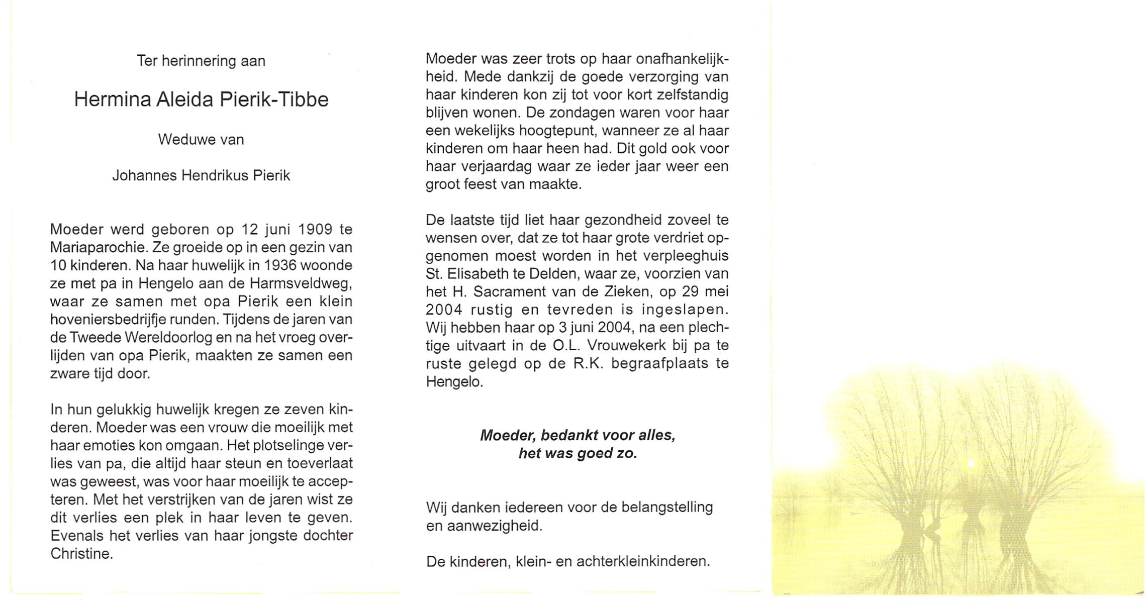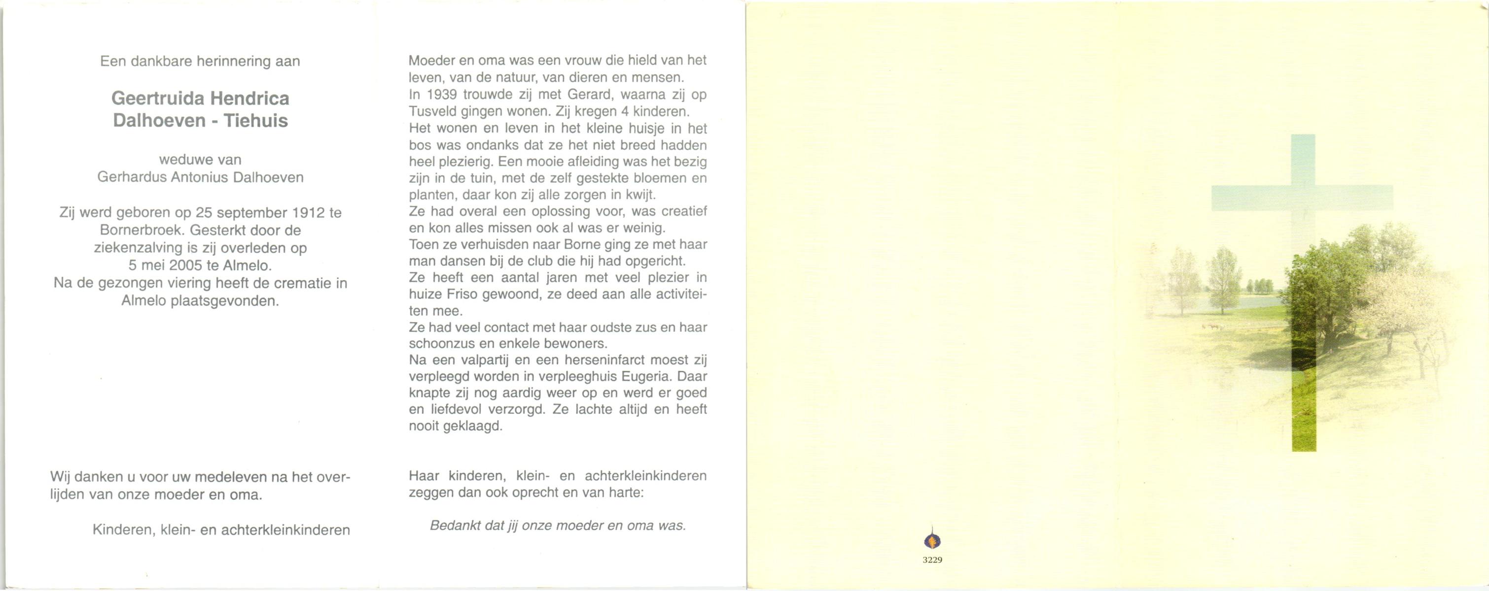 TIEHUIS, Geertruida Hendrica, geboren op 25-9-1912 te Bornerbroek, overleden op 5-5-2005 te Almelo op 92-jarige leeftijd, gecremeerd te Almelo.