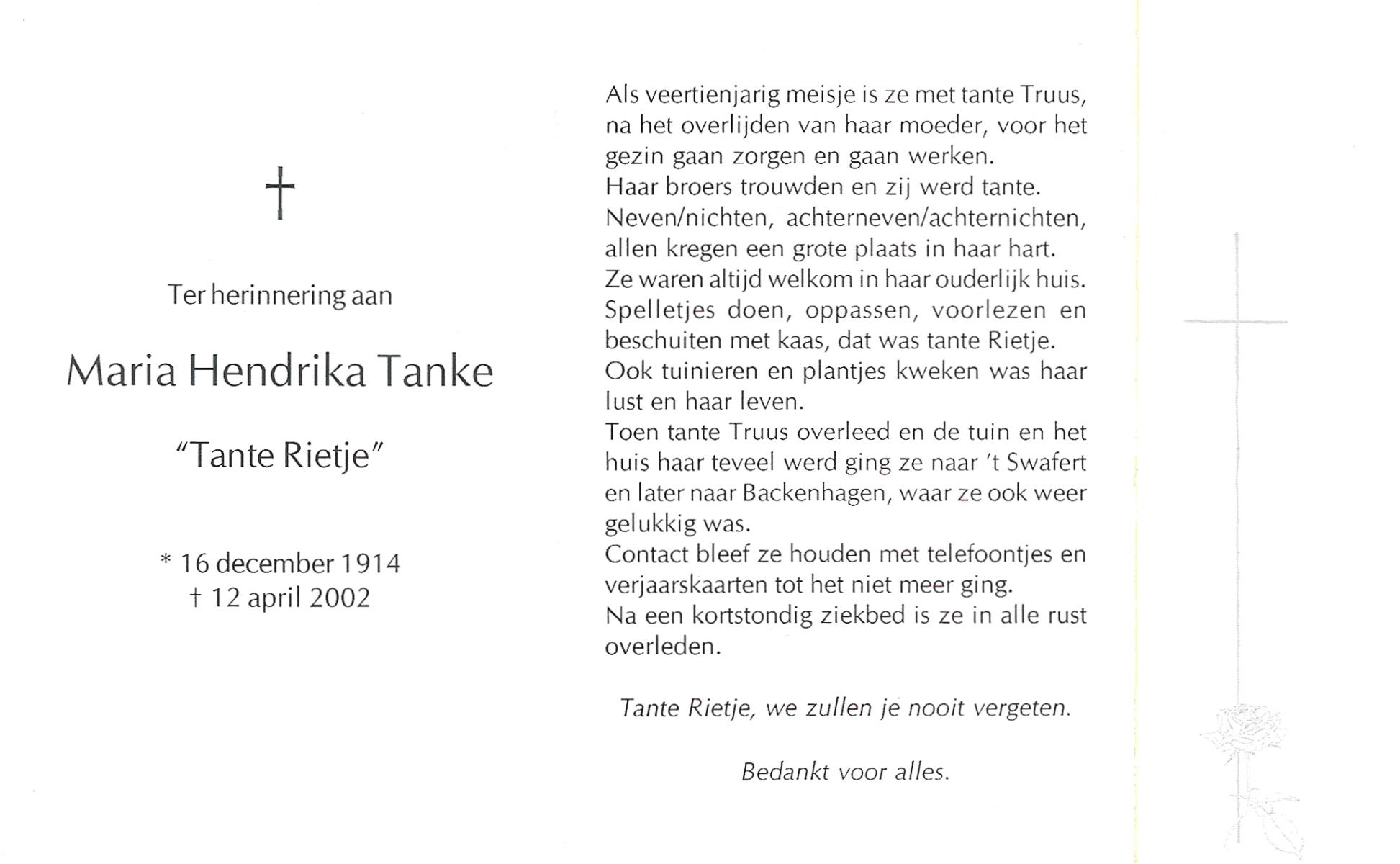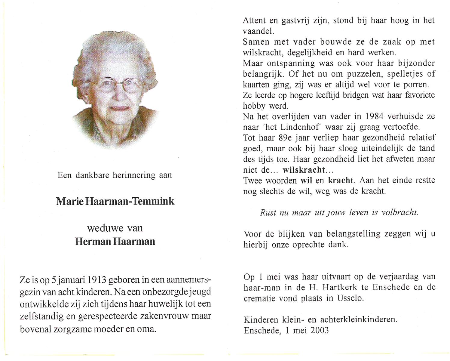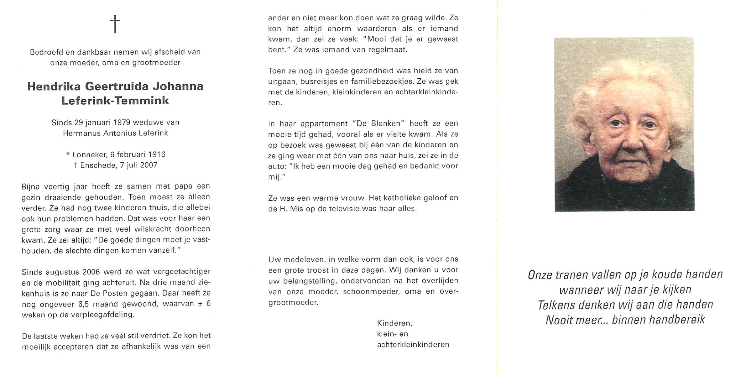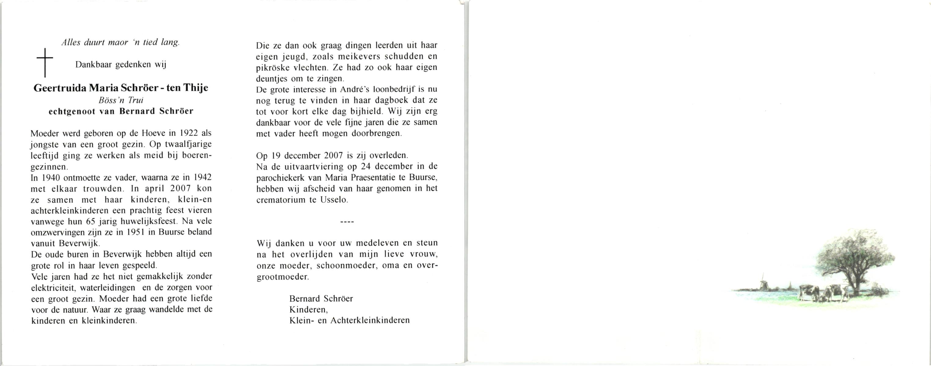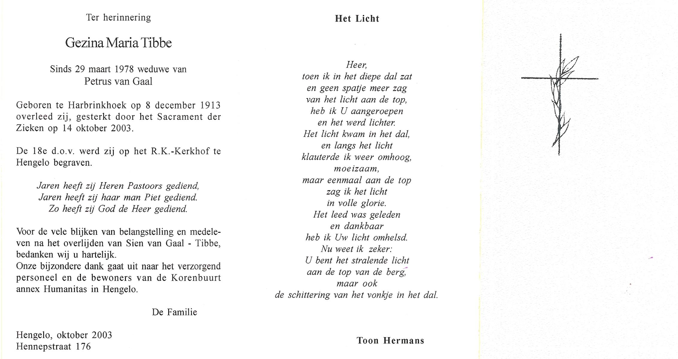 TIEHUIS, Geertruida Hendrica, geboren op 25-9-1912 te Bornerbroek, overleden op 5-5-2005 te Almelo op 92-jarige leeftijd, gecremeerd te Almelo.