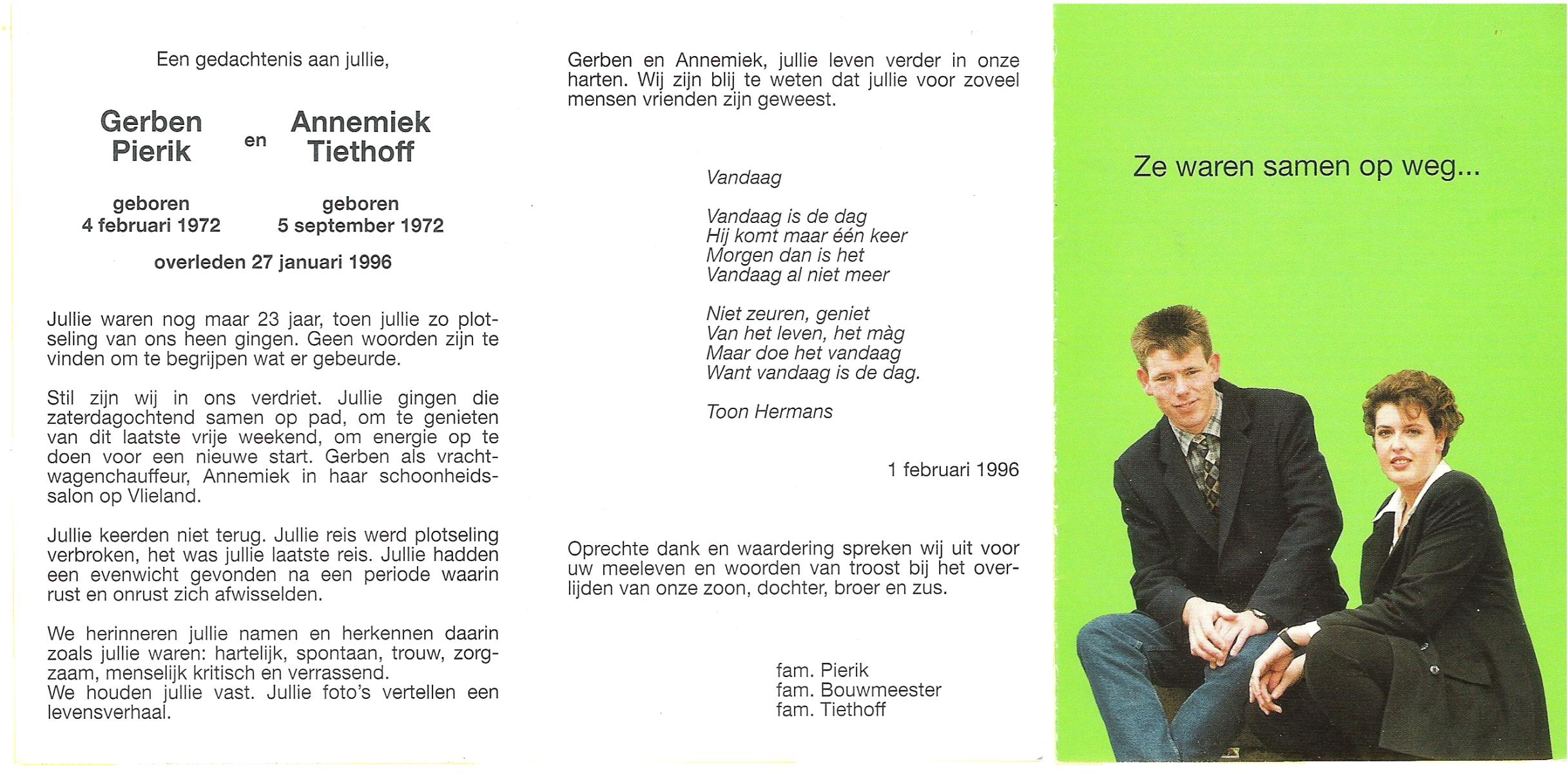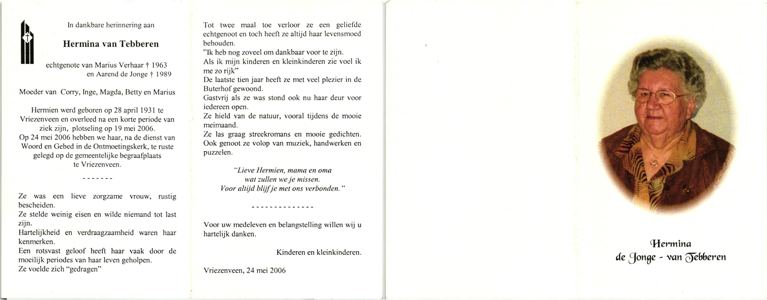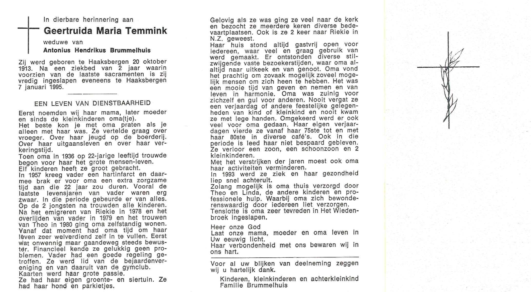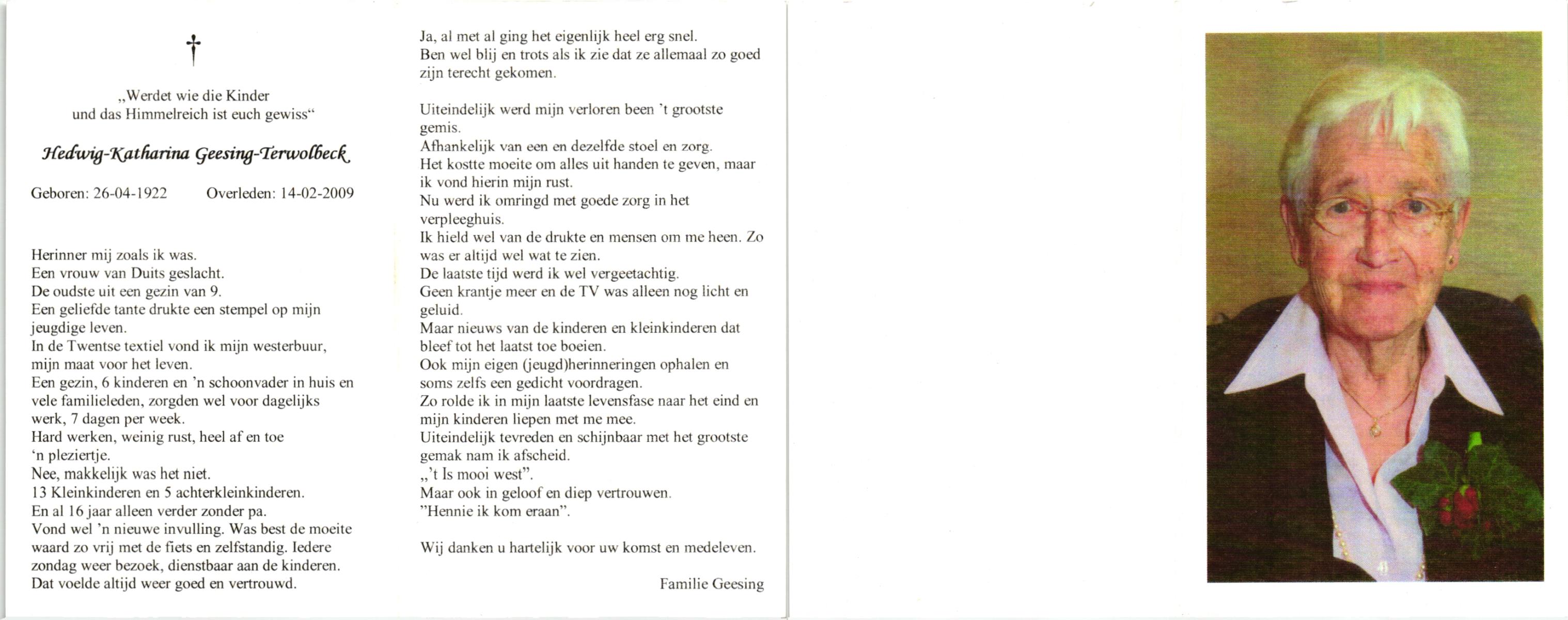 TIEHUIS, Geertruida Hendrica, geboren op 25-9-1912 te Bornerbroek, overleden op 5-5-2005 te Almelo op 92-jarige leeftijd, gecremeerd te Almelo.