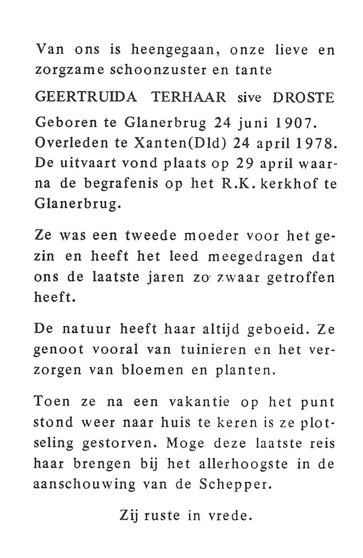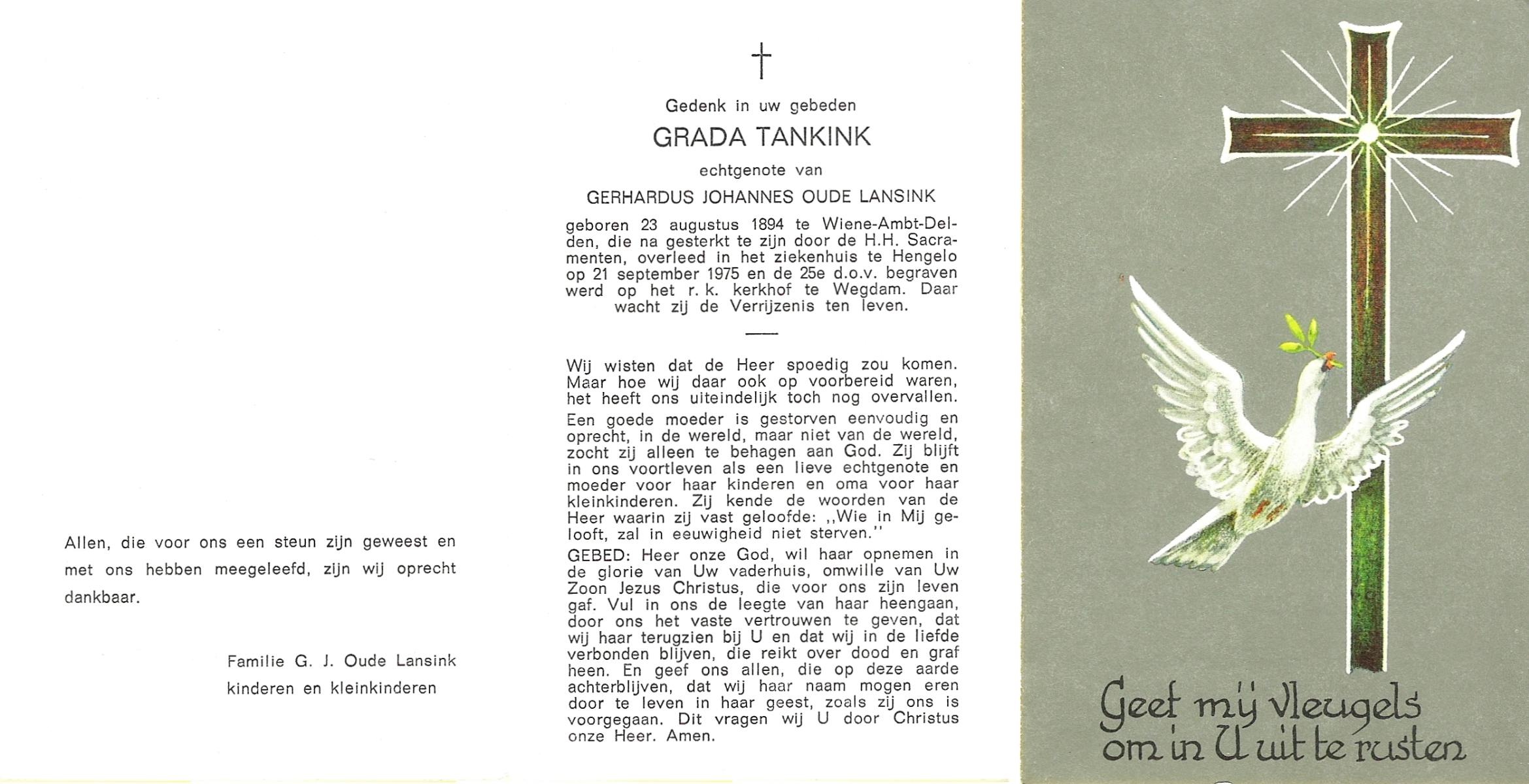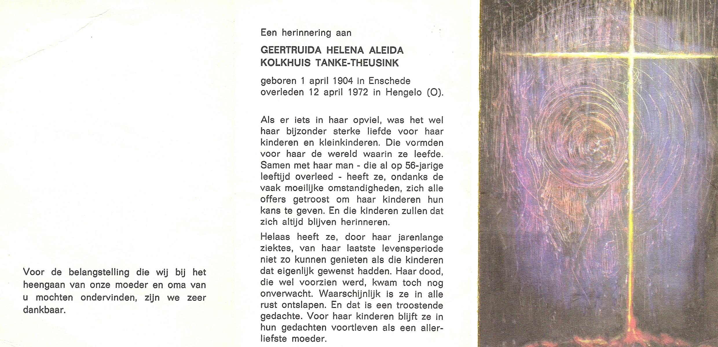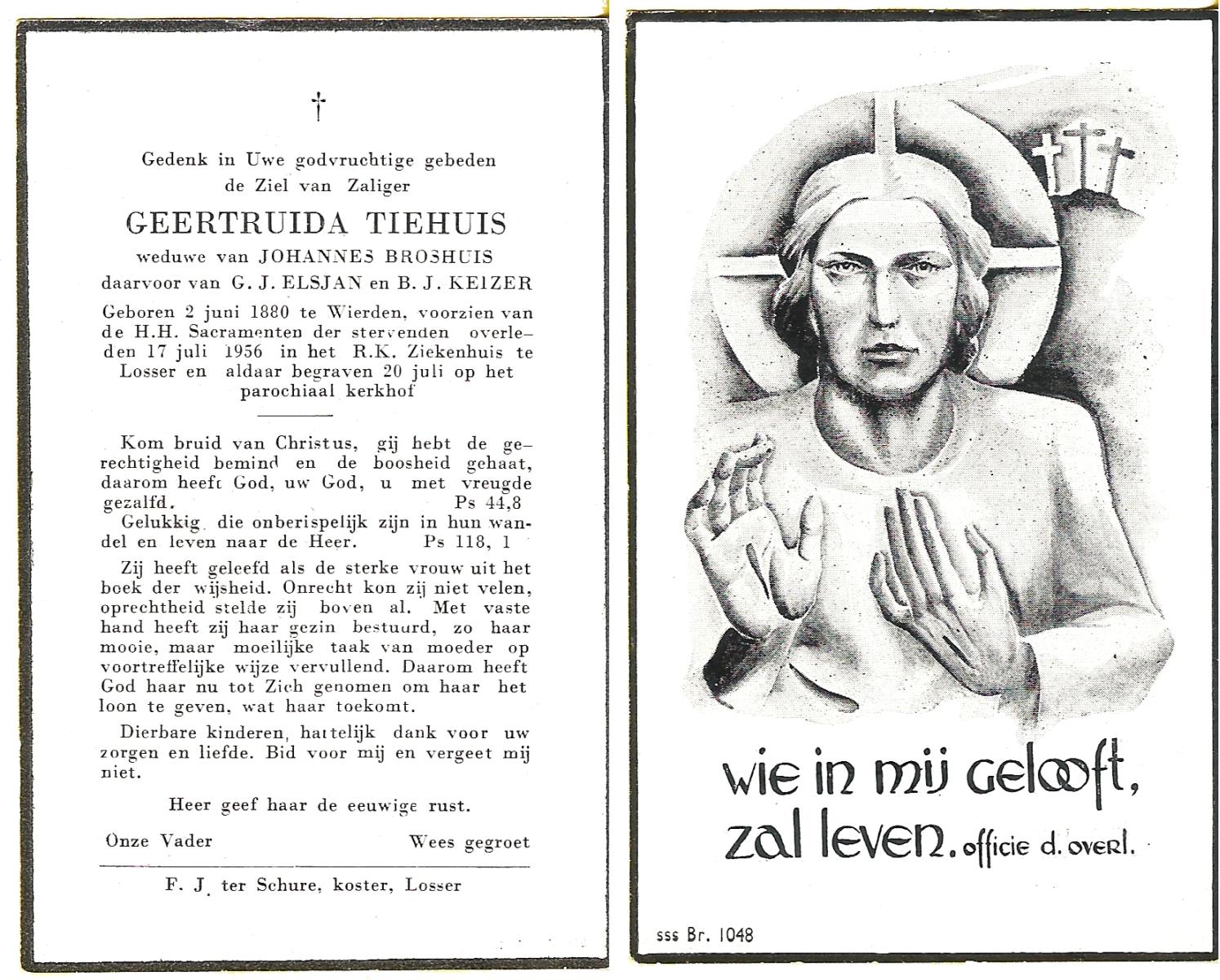 TIEHUIS, Geertruida, geboren op 02-06-1880 te Wierden, overleden op 17-7-1956 te Losser op 76-jarige leeftijd, begraven op 20-7-1956 te Losser.