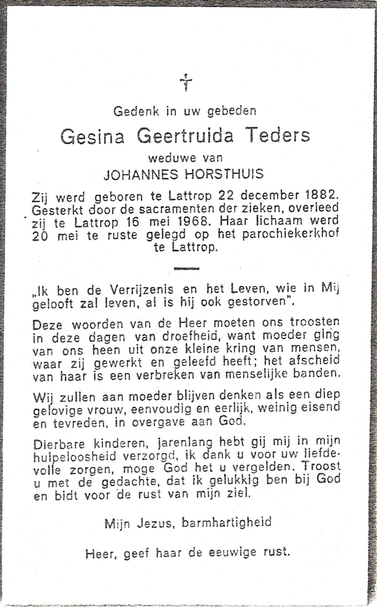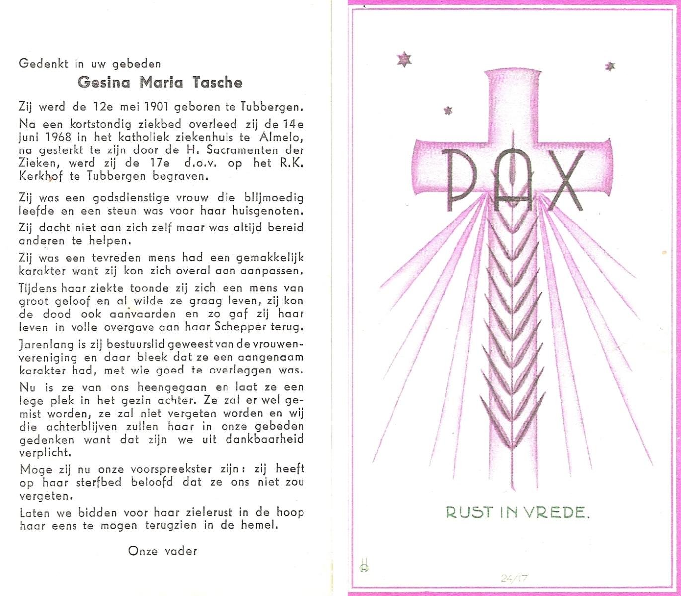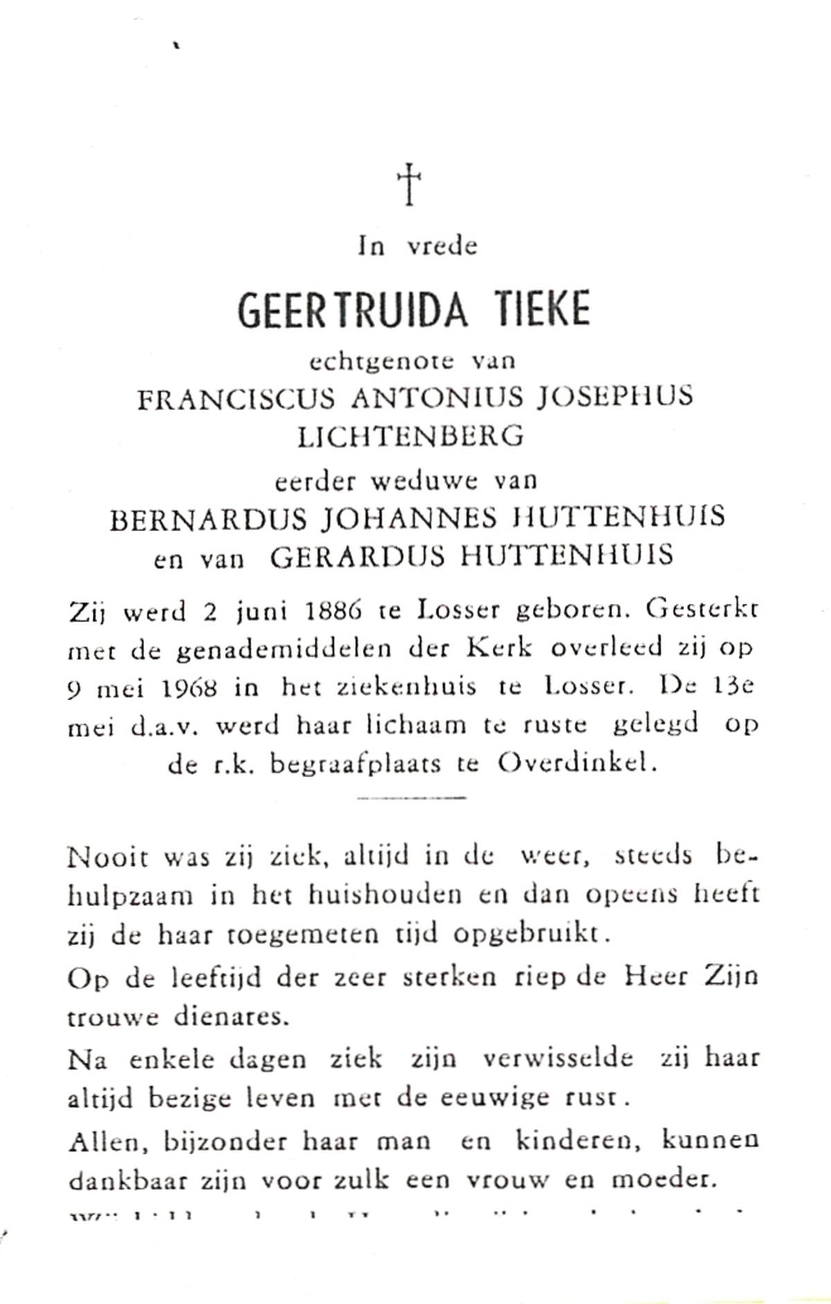 TIEKE, Geertruida, geboren op 02-06-1886 te Losser, overleden op 9-5-1968 te Losser op 81-jarige leeftijd, begraven op 13-5-1968 te Overdinkel.