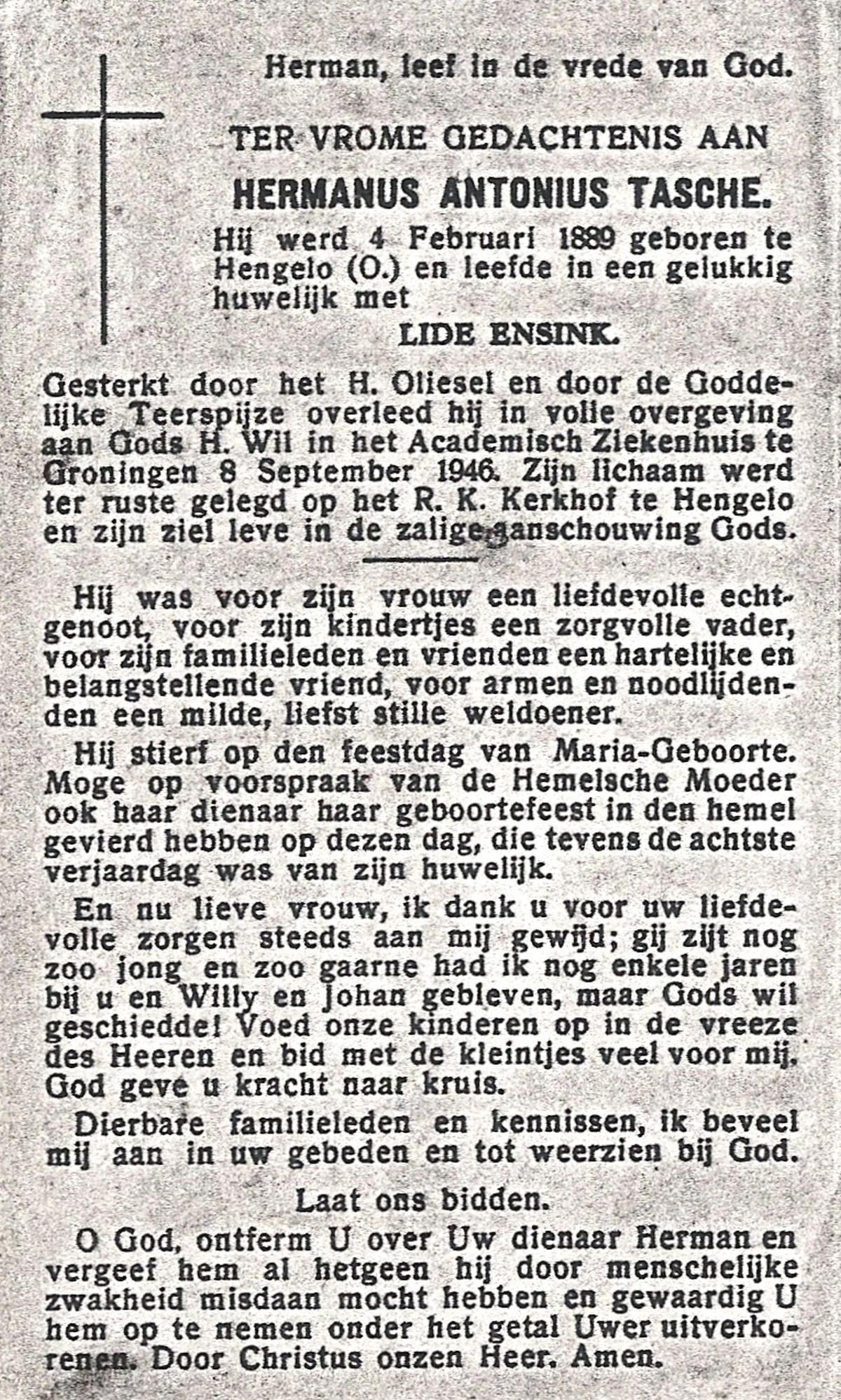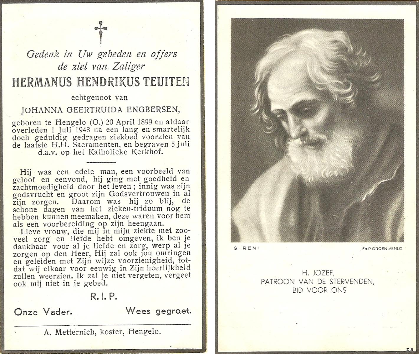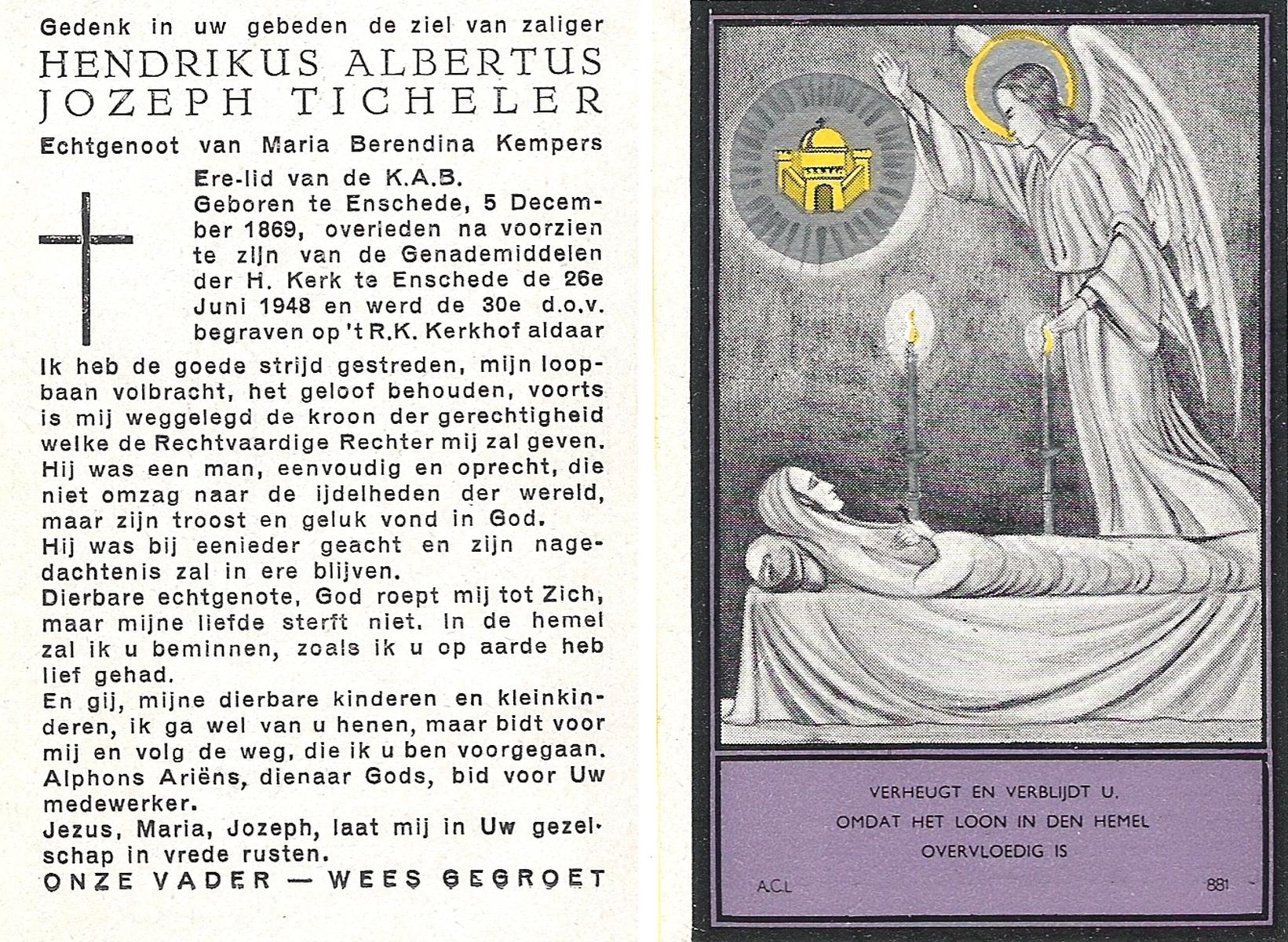 TICHELER, Hendrikus Albertus Jozeph, geboren op 05-12-1869 te Enschede, overleden op 26-6-1948 te Enschede op 78-jarige leeftijd, begraven op 30-6-1948 te Enschede.