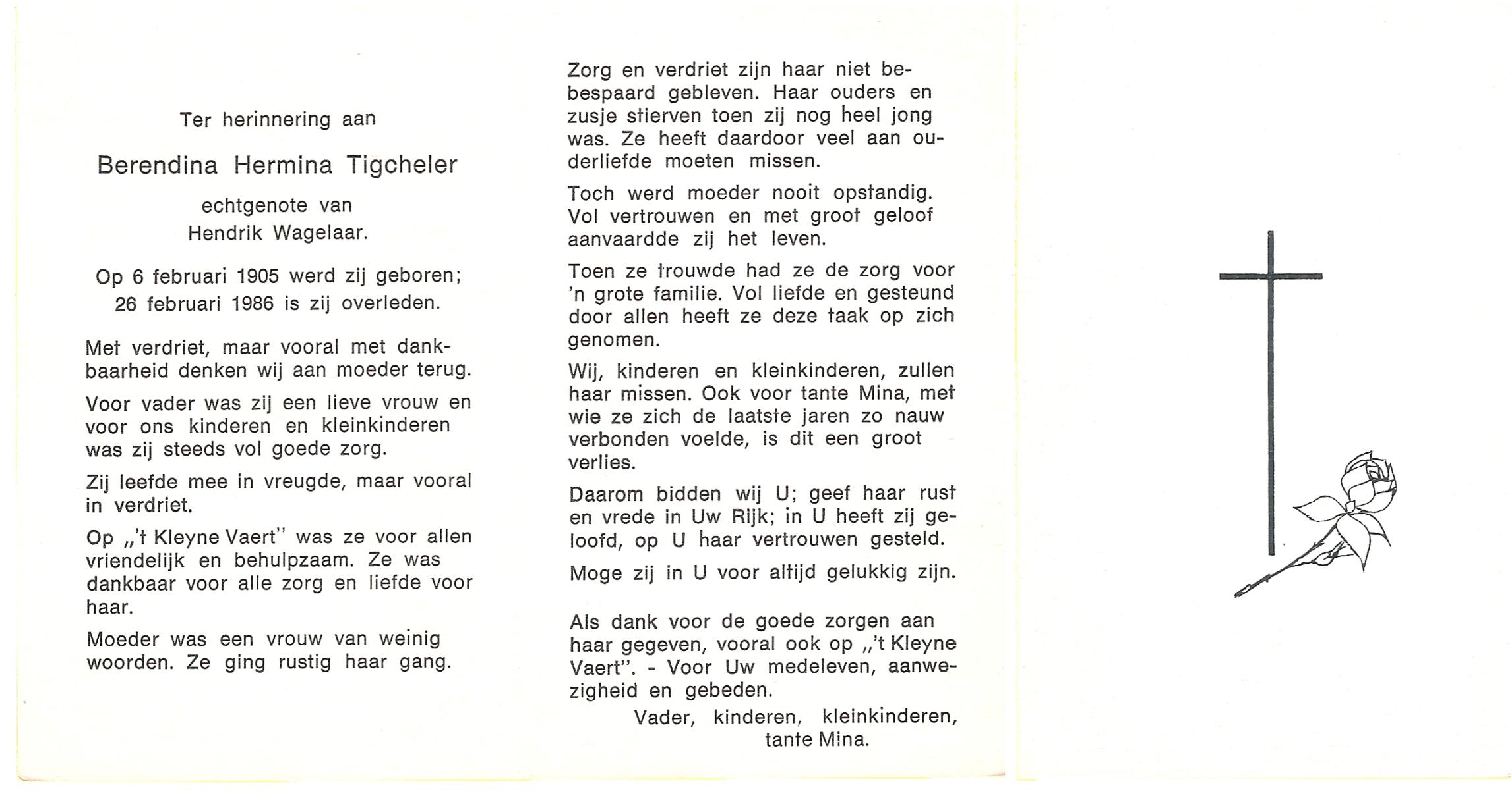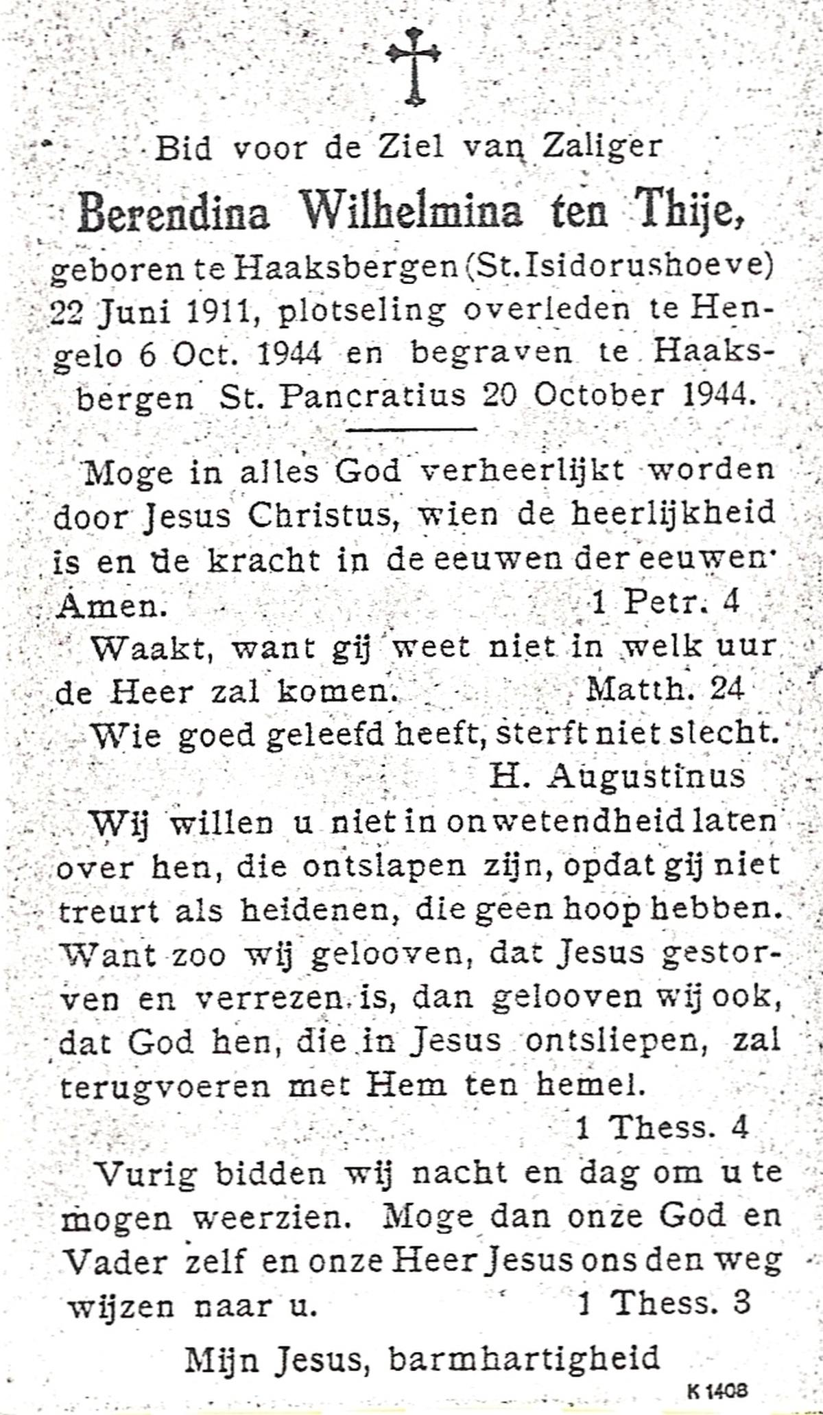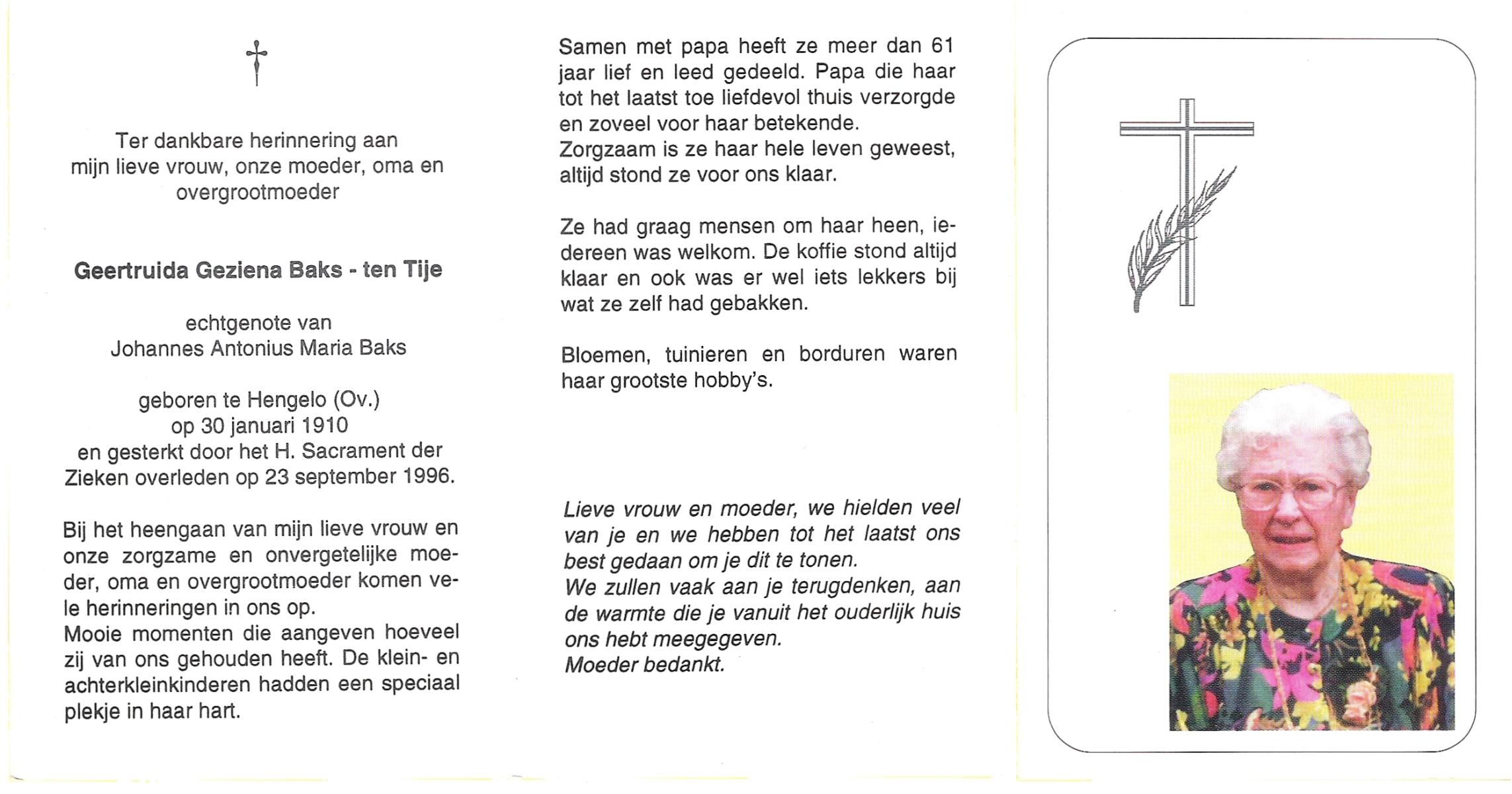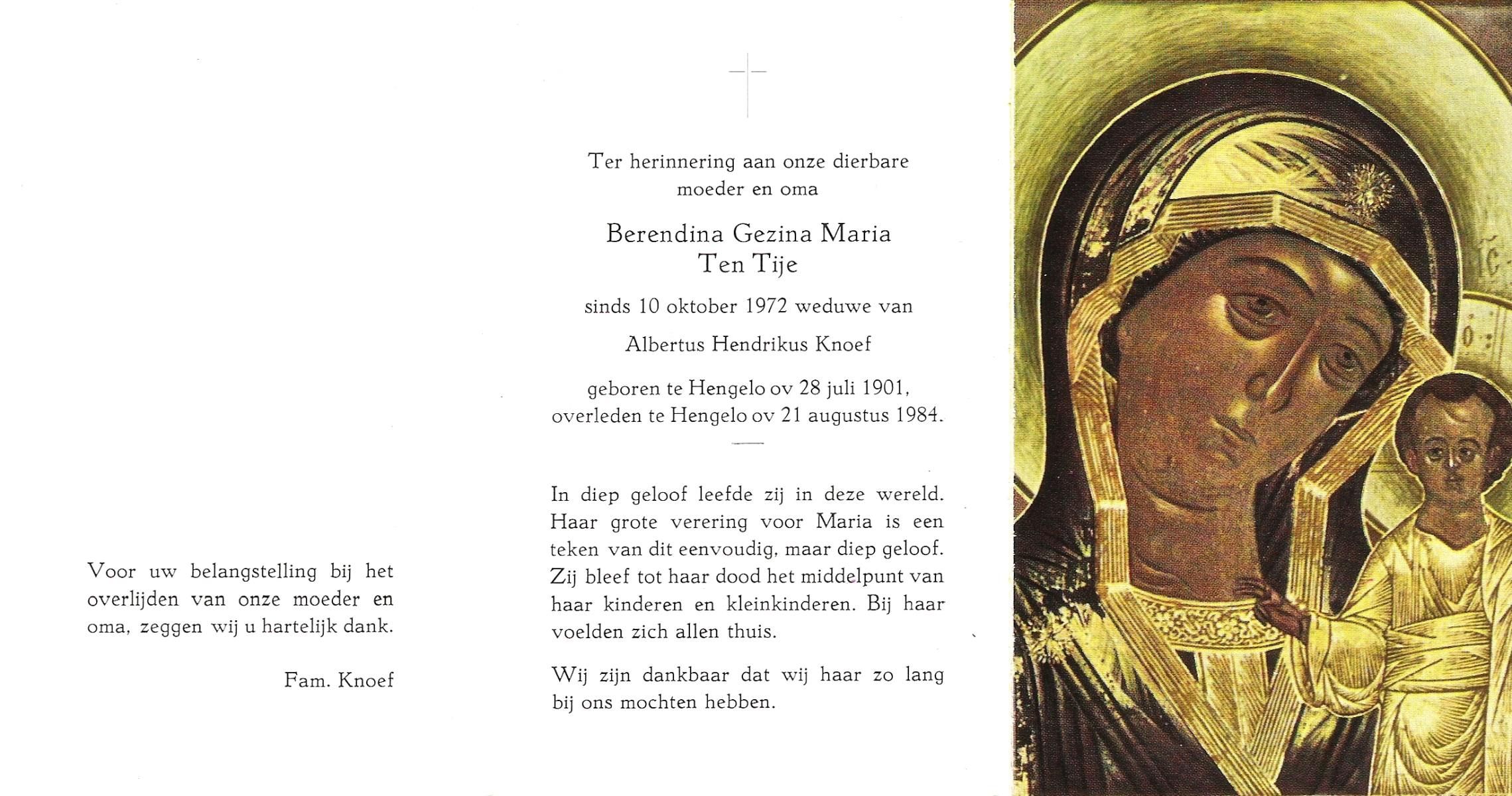 TIJE, ten, Berendina Gezina Maria, geboren op 28-7-1901 te Hengelo (O), overleden op 21-8-1984 te Hengelo (Ov.) op 83-jarige leeftijd.