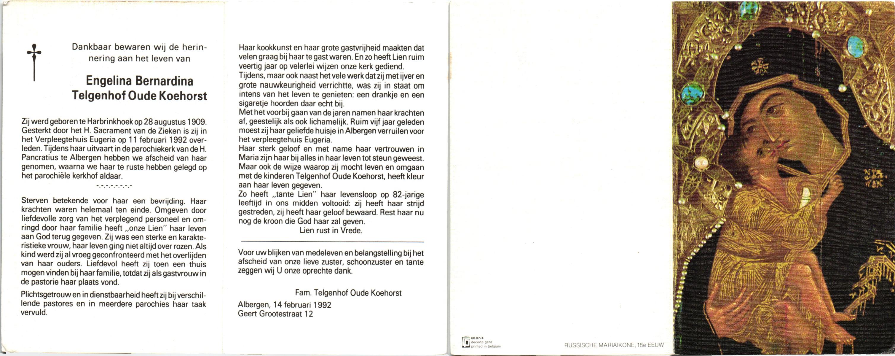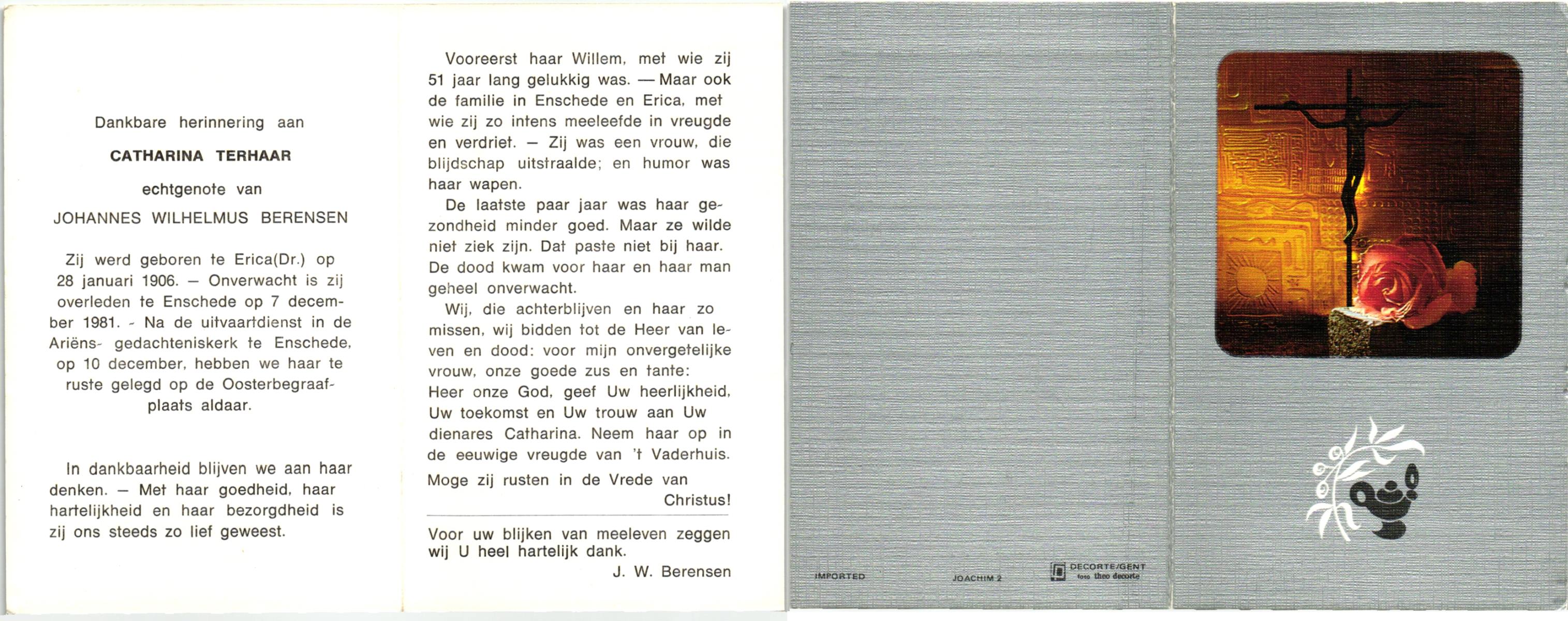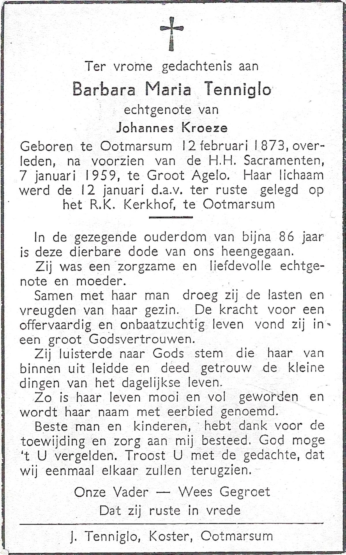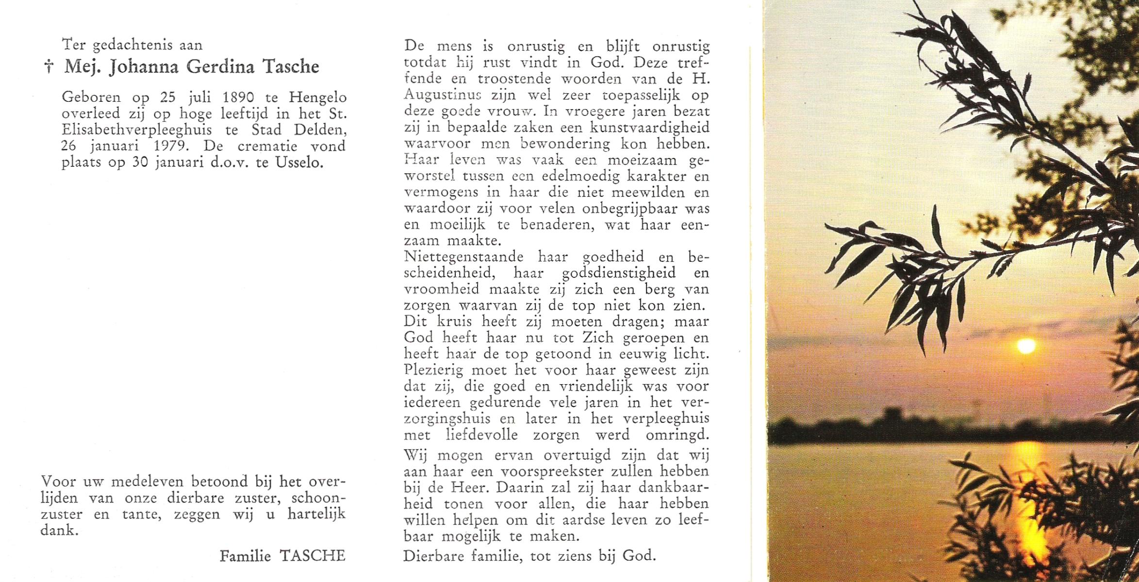TIJE, ten, Berendina Gezina Maria, geboren op 28-7-1901 te Hengelo (O), overleden op 21-8-1984 te Hengelo (Ov.) op 83-jarige leeftijd.