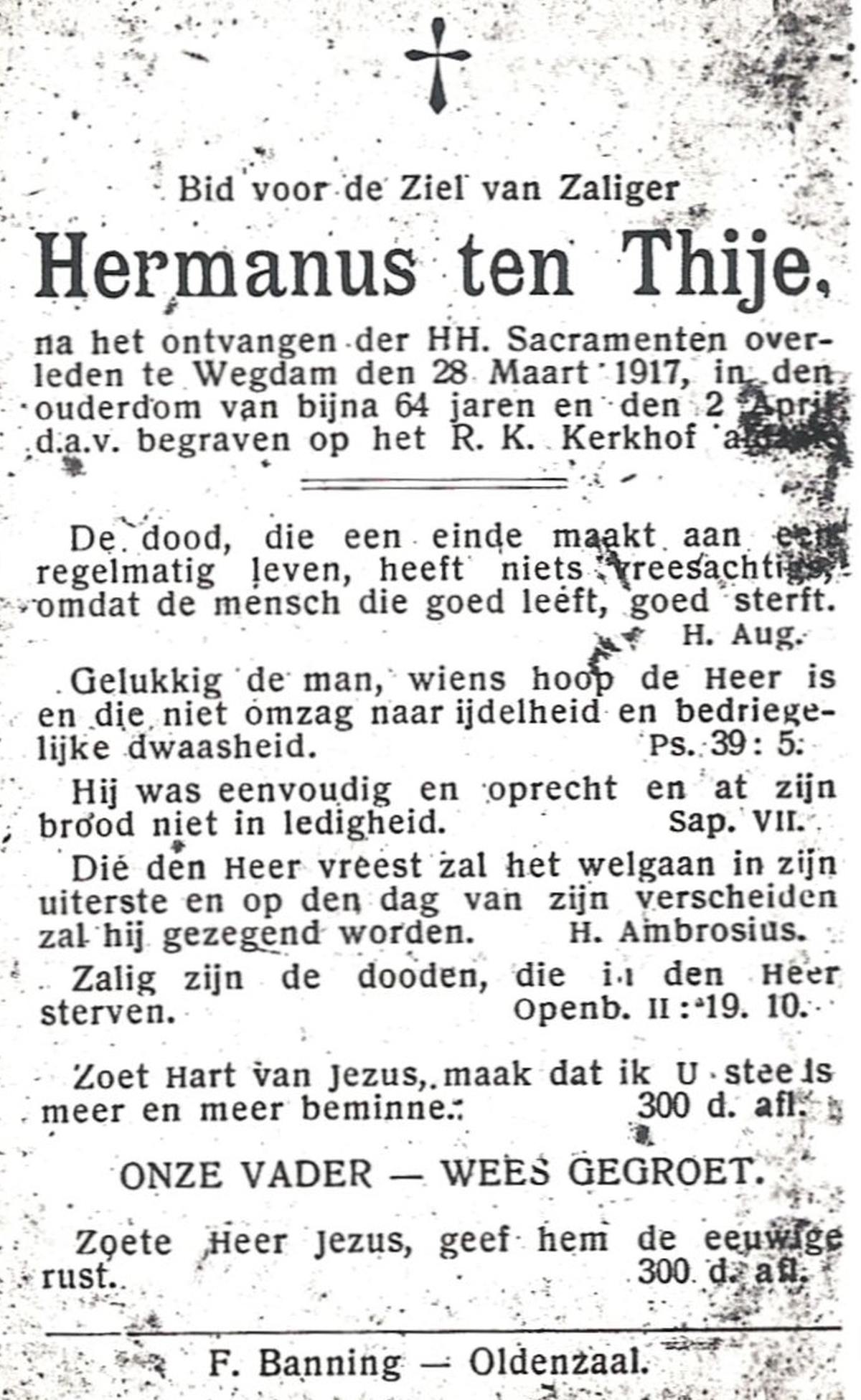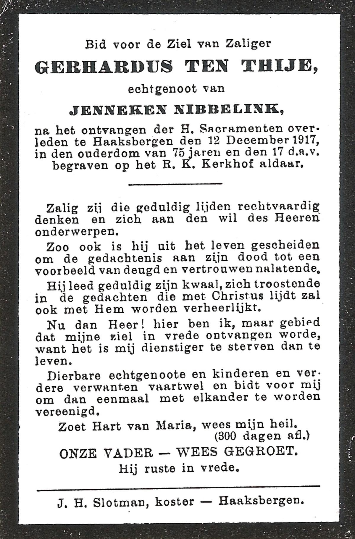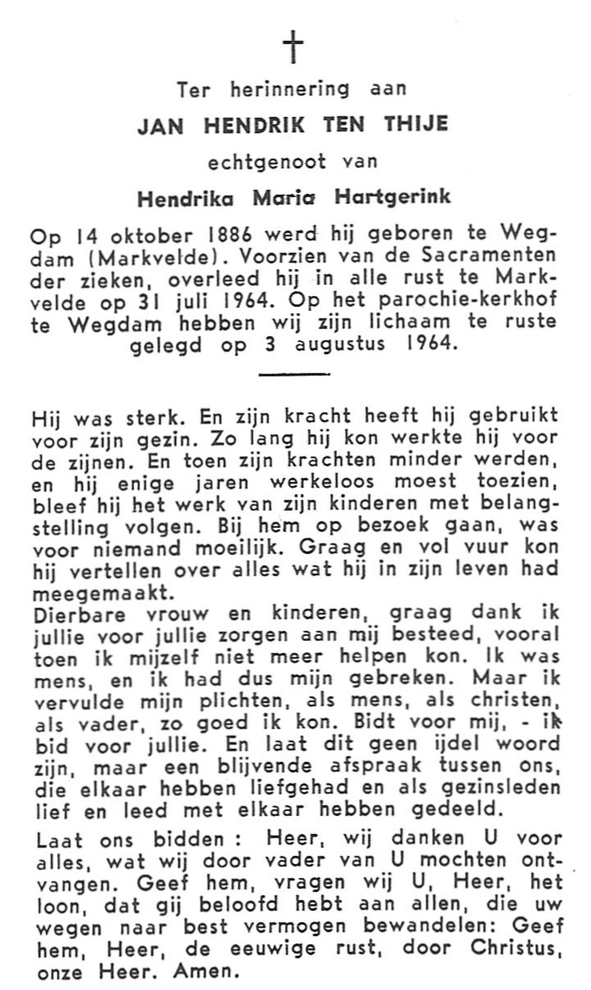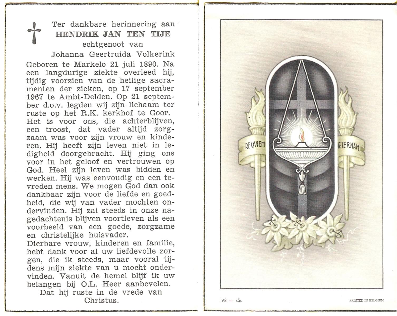TIJE, ten, Hendrik Jan, geboren op 21-07-1890 te Markelo, overleden op 17-9-1967 te Delden, Ambt op 77-jarige leeftijd, begraven op 21-9-1967 te Goor.