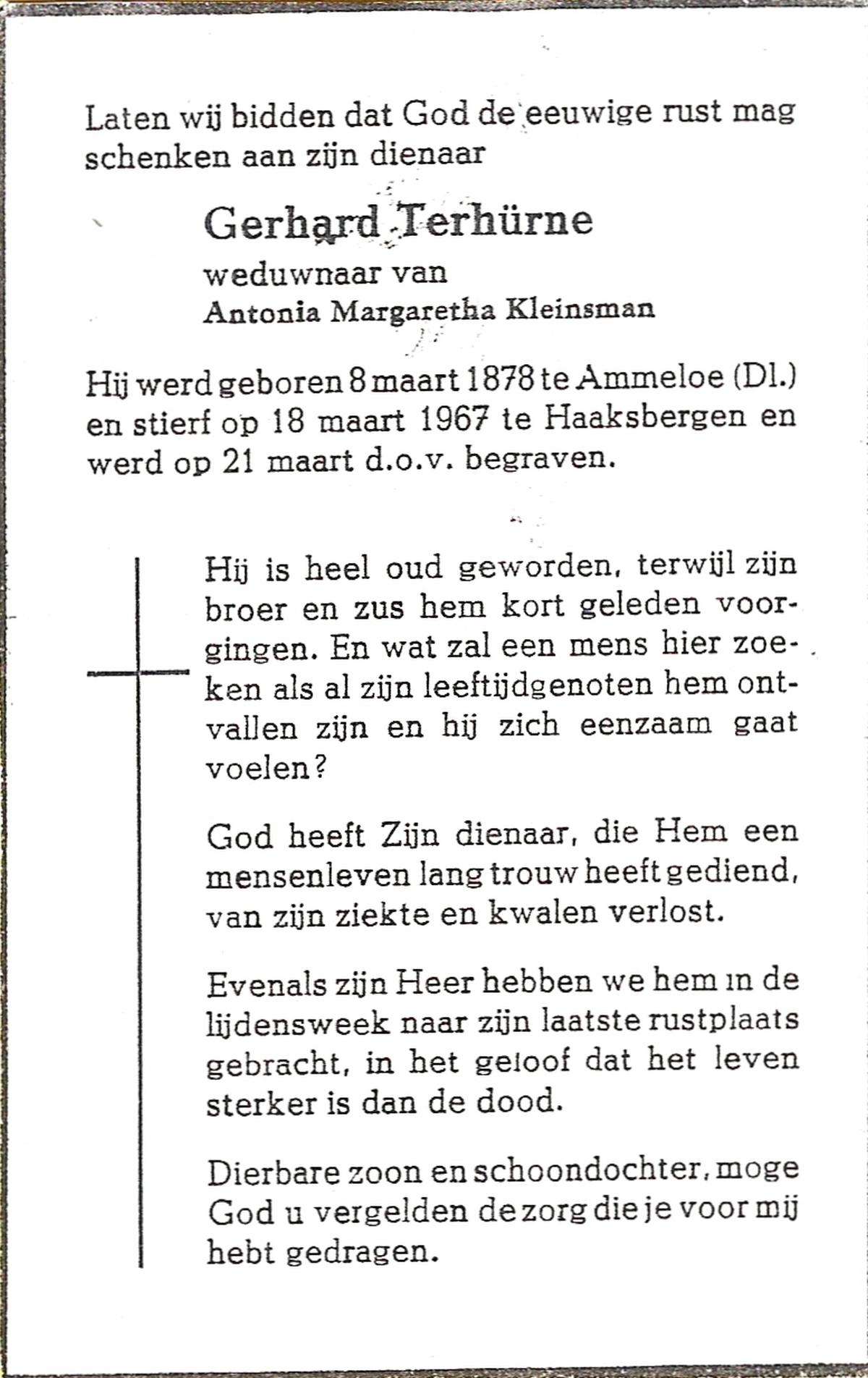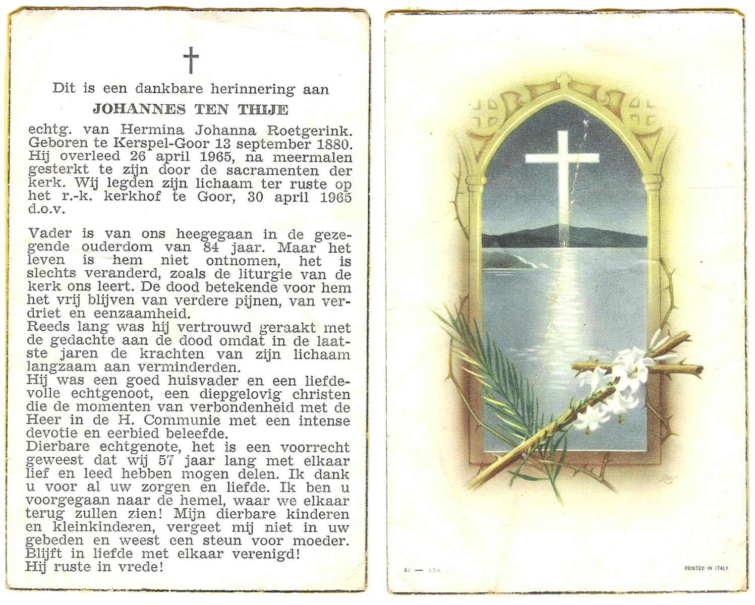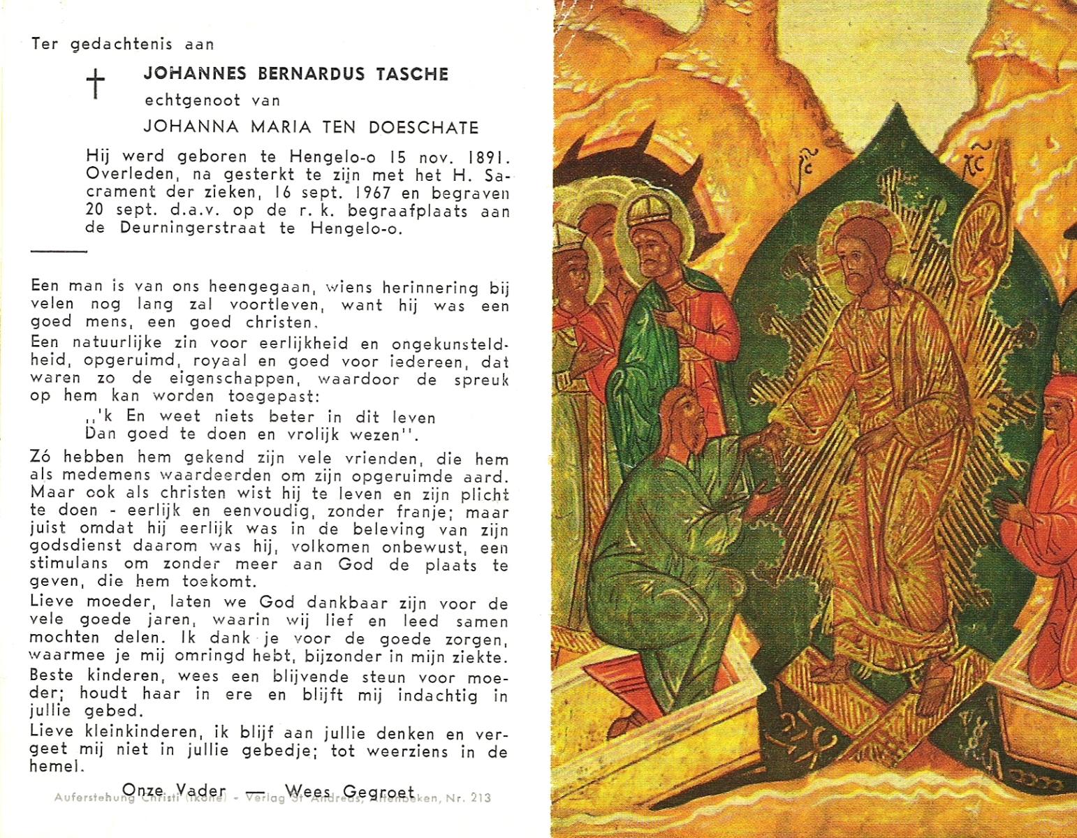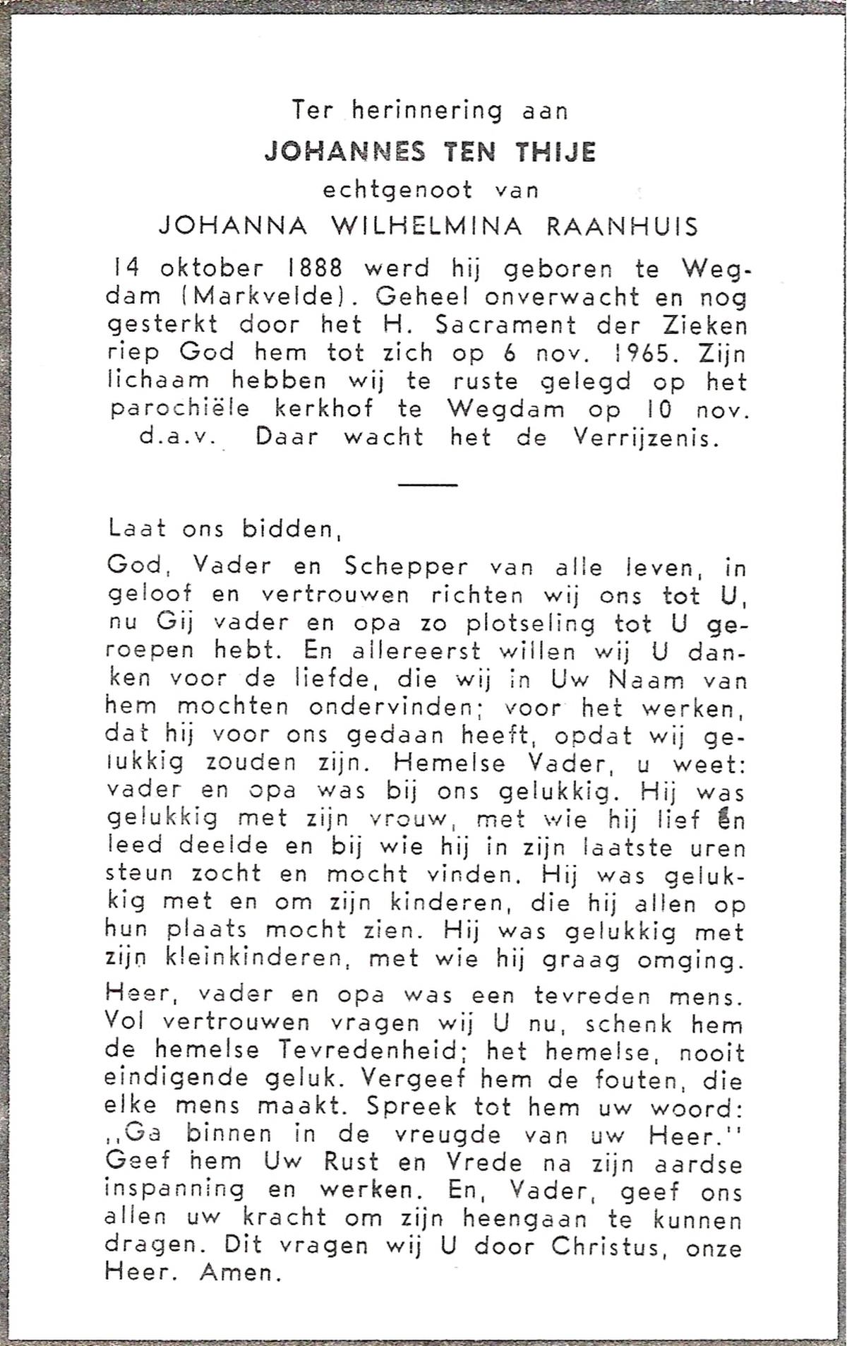 TIJE, ten, Hendrik Jan, geboren op 21-07-1890 te Markelo, overleden op 17-9-1967 te Delden, Ambt op 77-jarige leeftijd, begraven op 21-9-1967 te Goor.