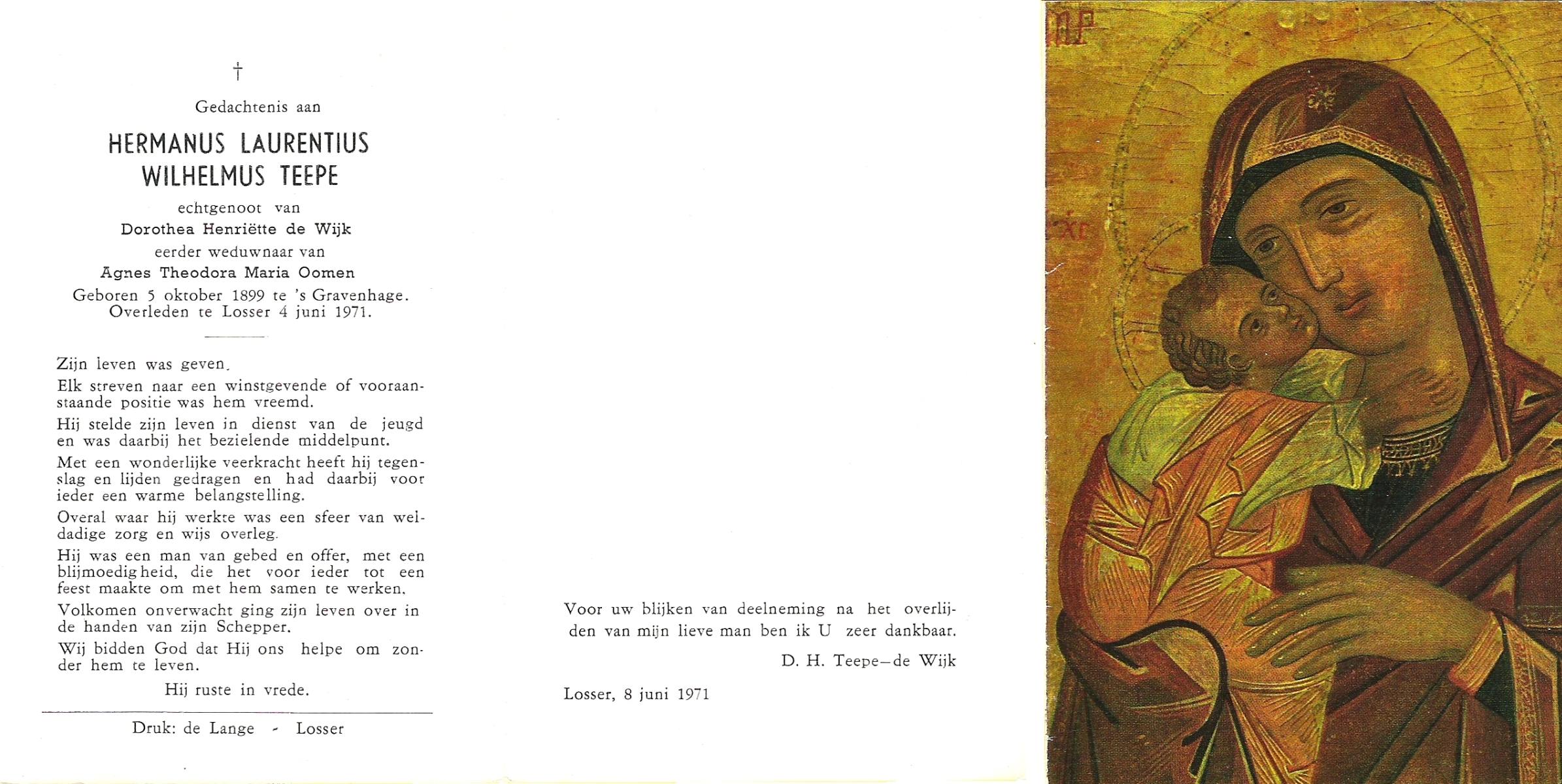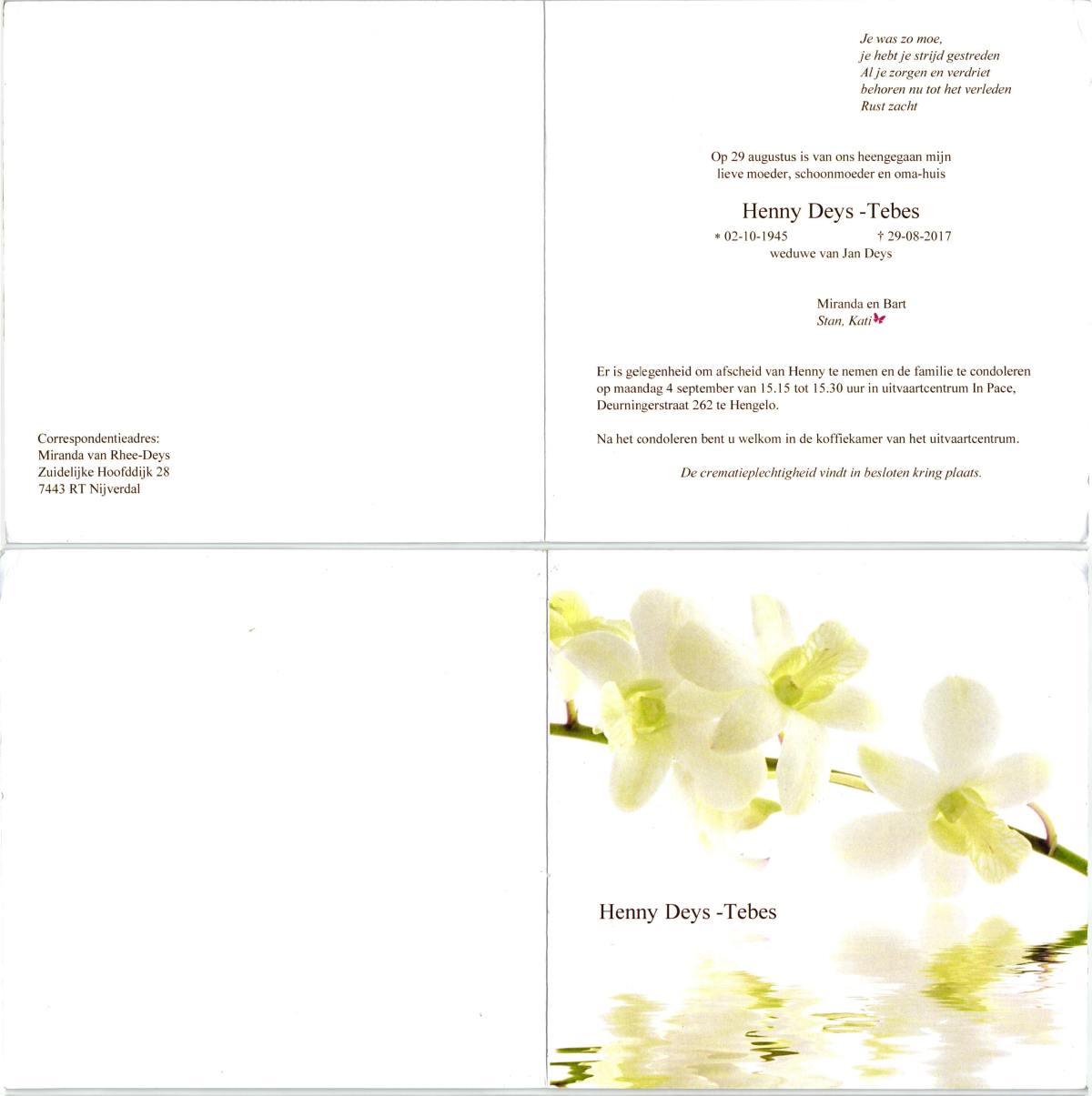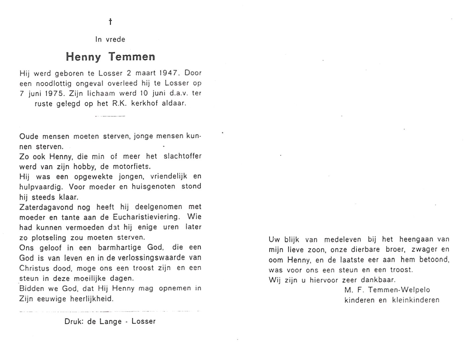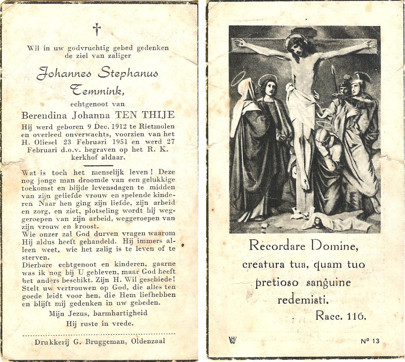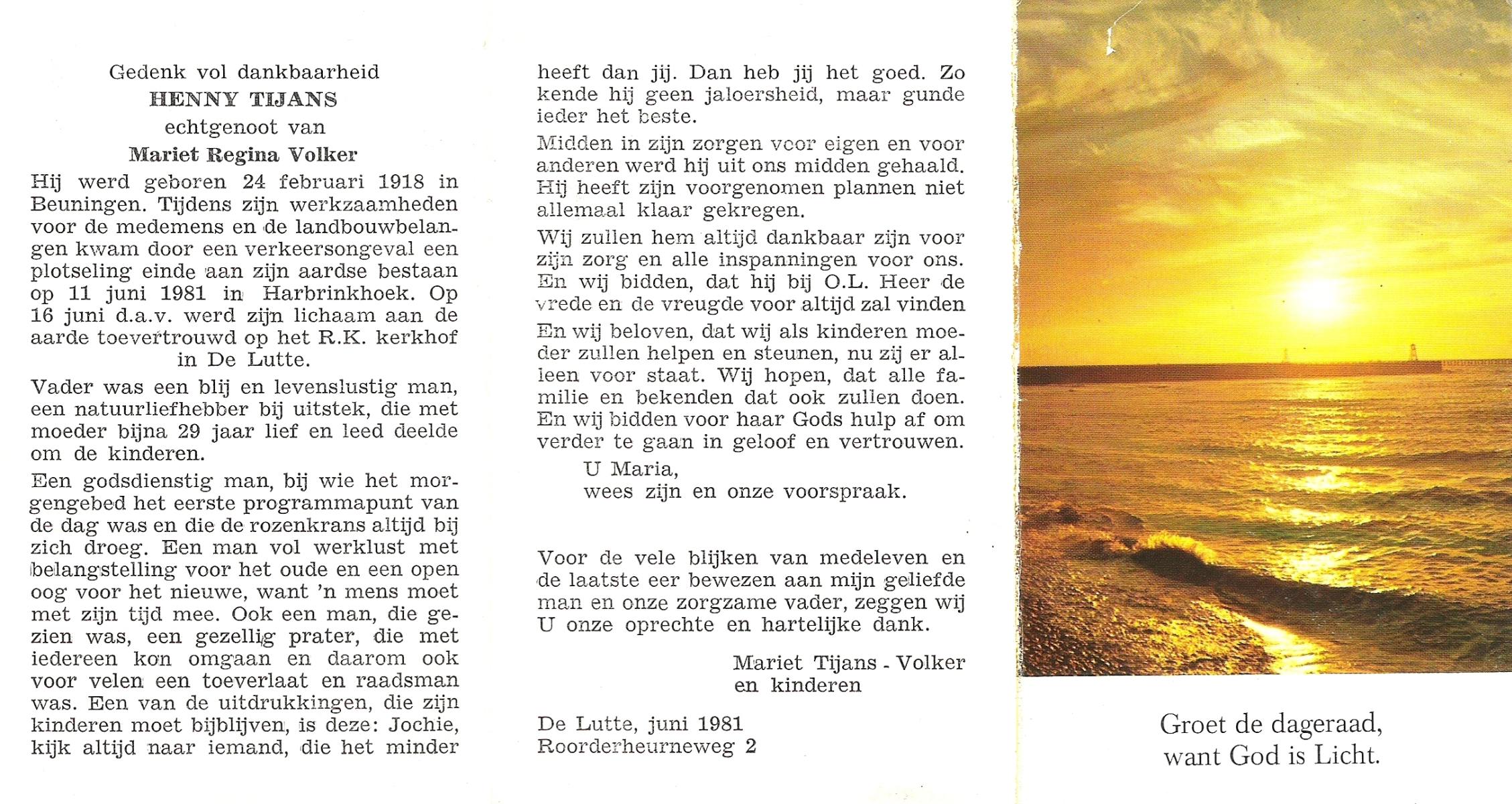 TIJANS, Henny, geboren op 24-2-1918 te Beuningen (Ov.), overleden op 11-6-1981 te Harbrinkhoek, Almelo op 63-jarige leeftijd, begraven op 16-6-1981 te De Lutte.