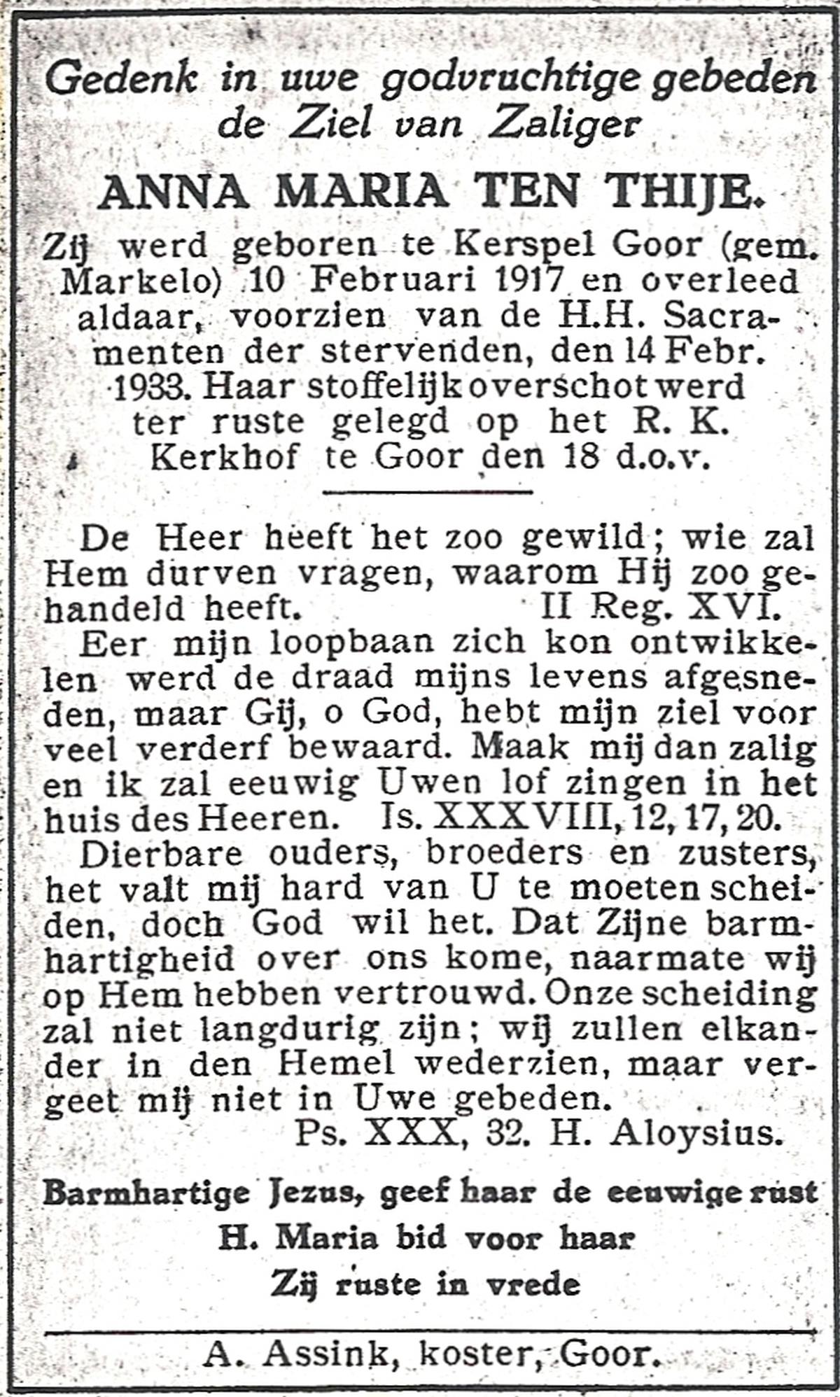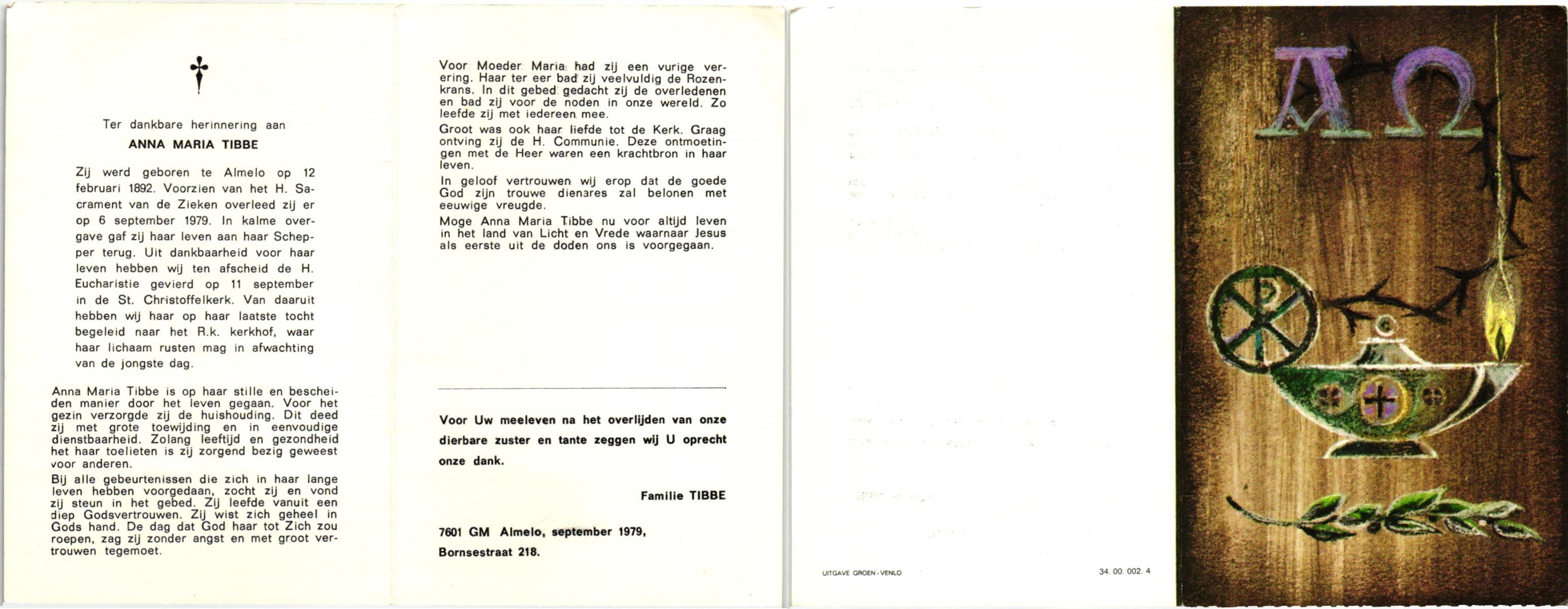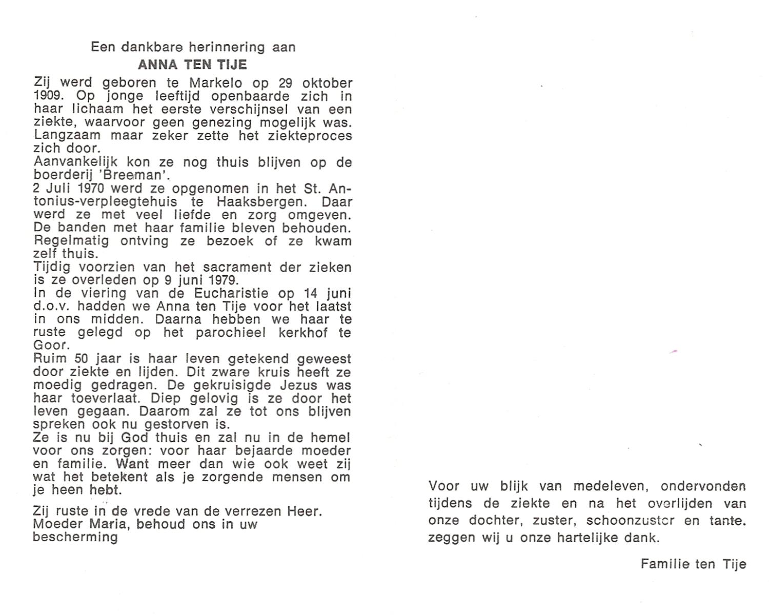 TIJE, ten, Anna, geboren op 29-10-1909 te Markelo, overleden op 9-6-1979 te Haaksbergen op 69-jarige leeftijd, begraven op 14-6-1979 te Goor.
