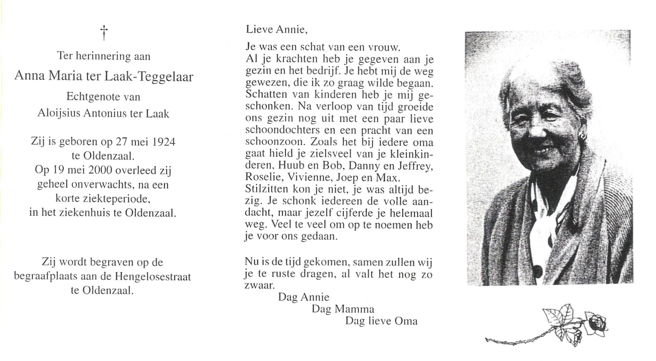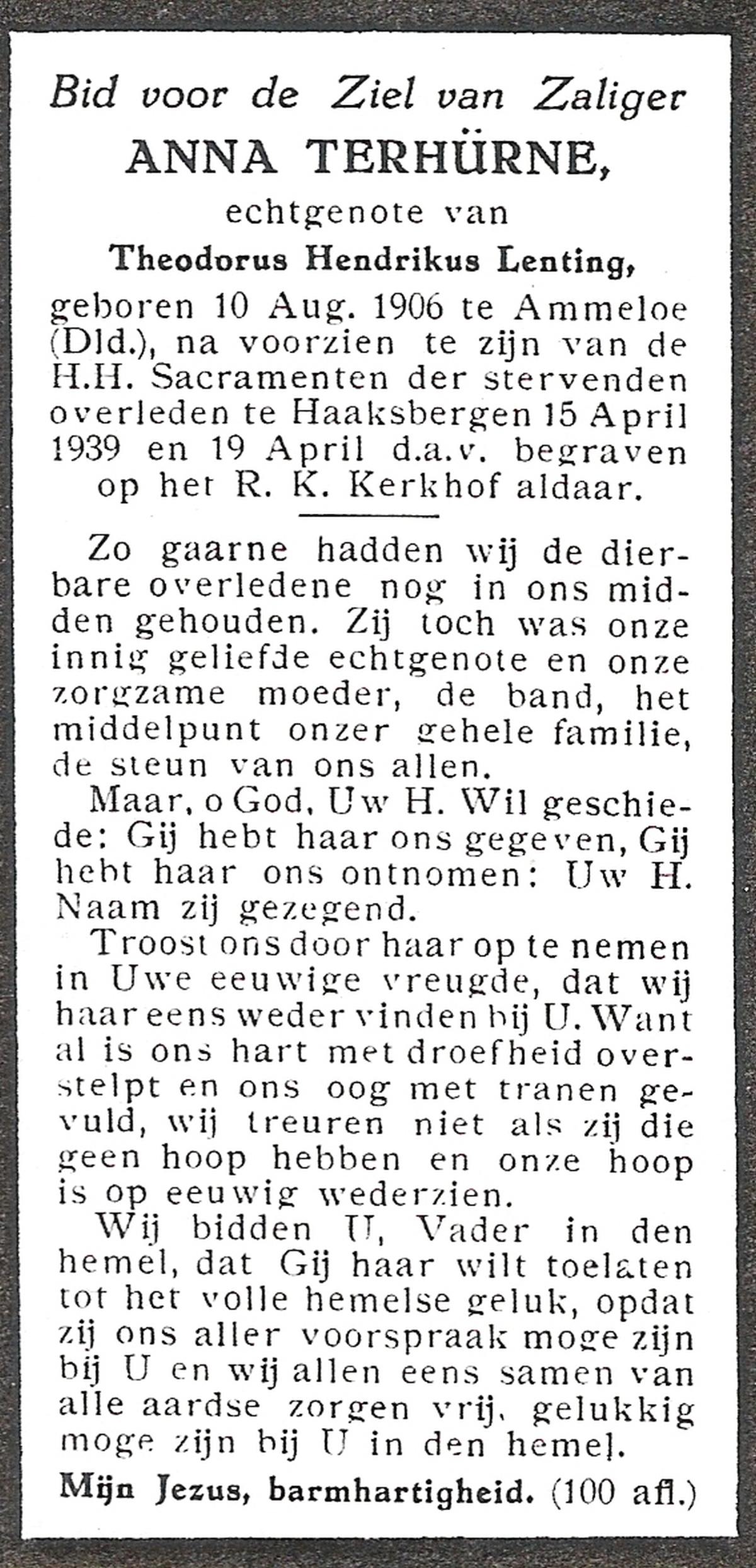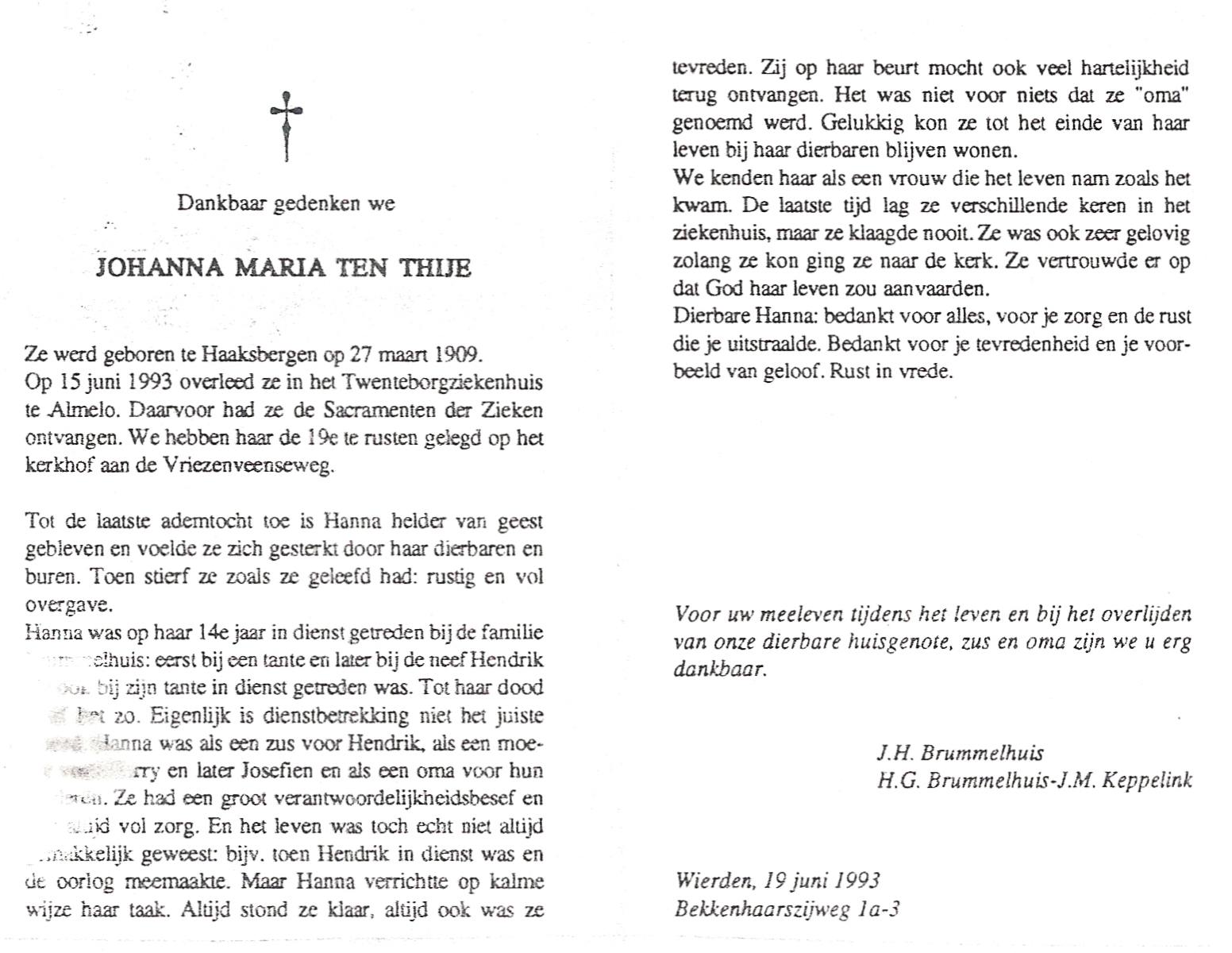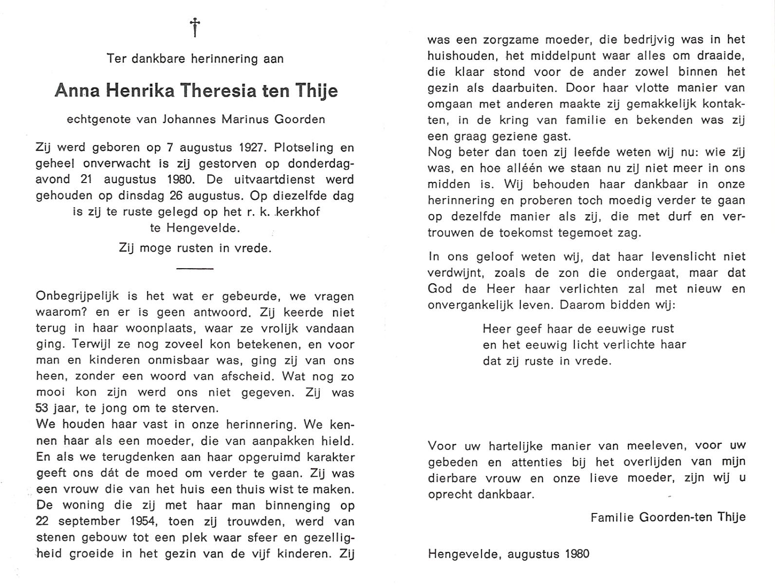 TIJE, ten, Anna, geboren op 29-10-1909 te Markelo, overleden op 9-6-1979 te Haaksbergen op 69-jarige leeftijd, begraven op 14-6-1979 te Goor.