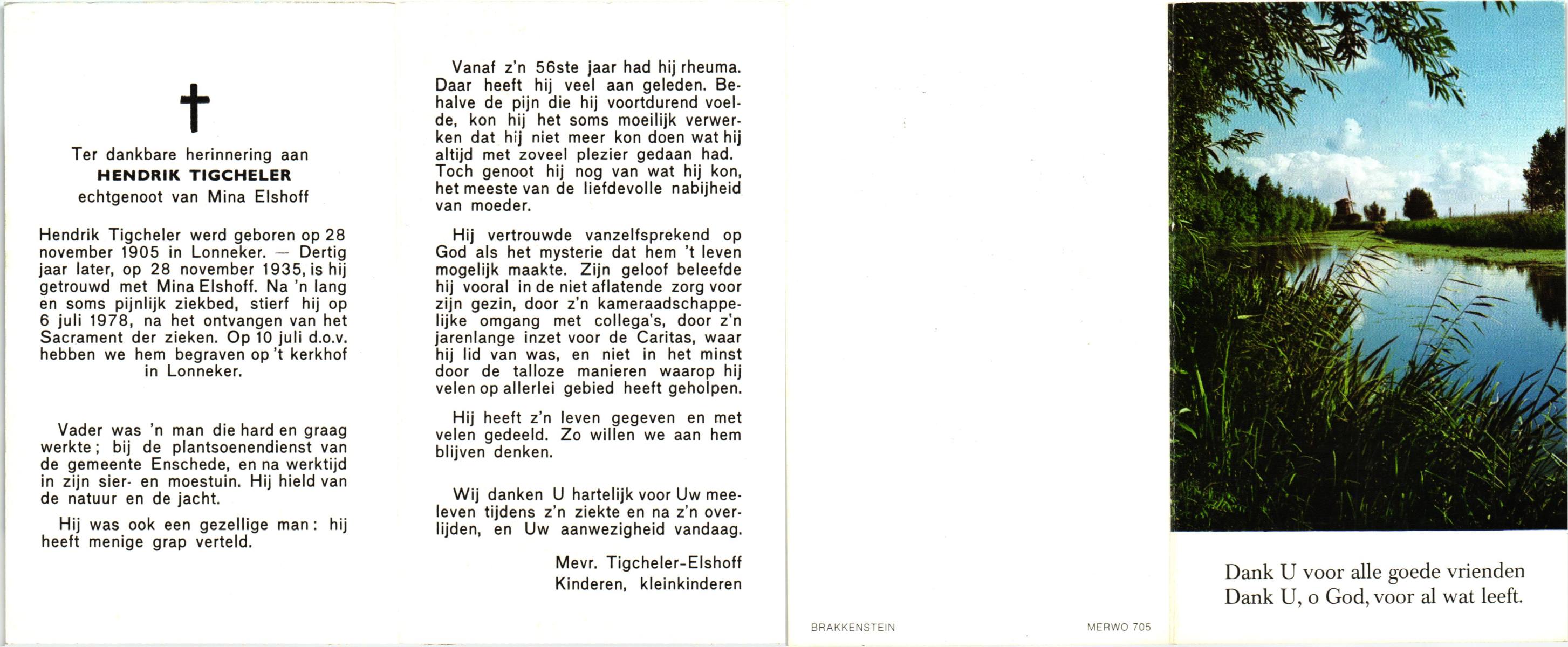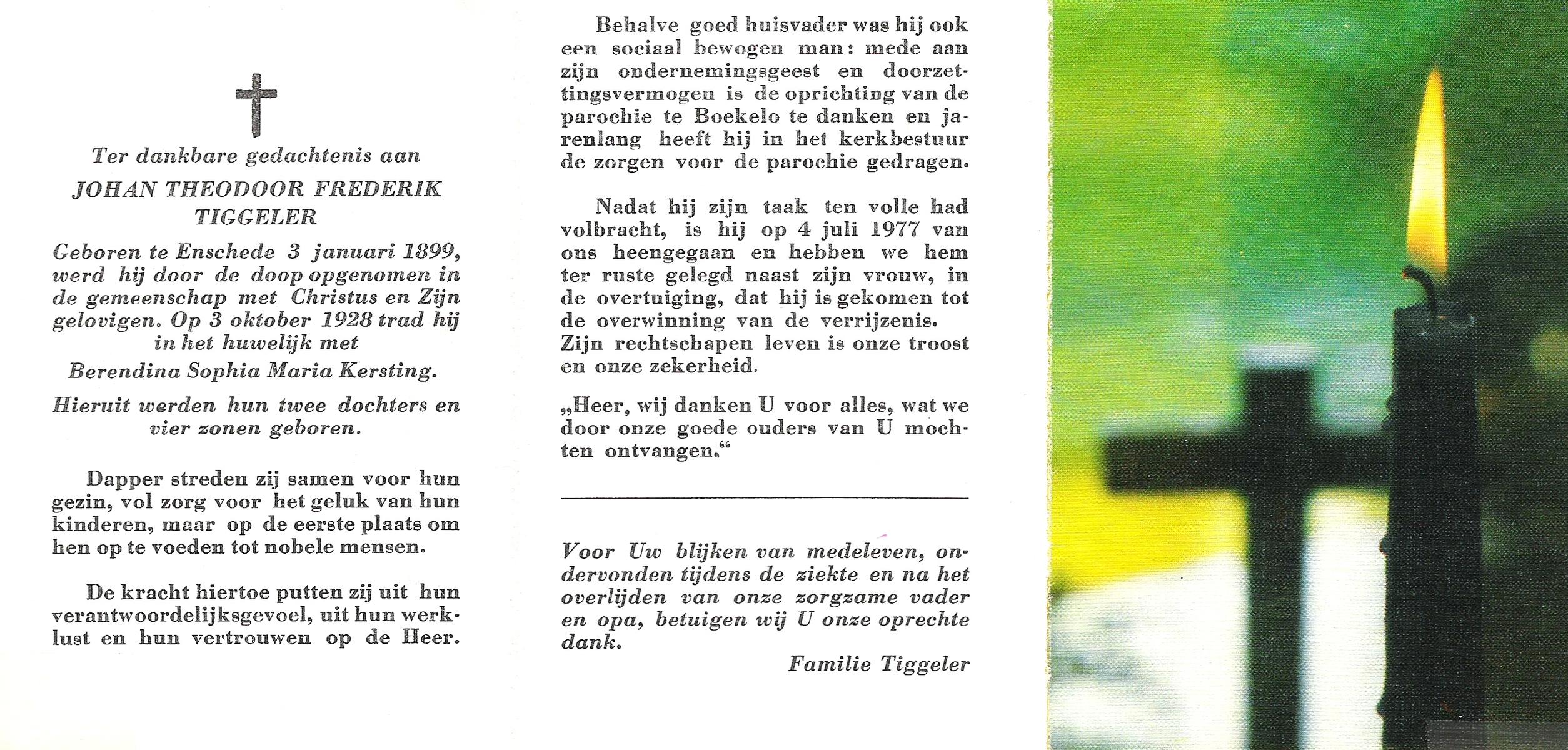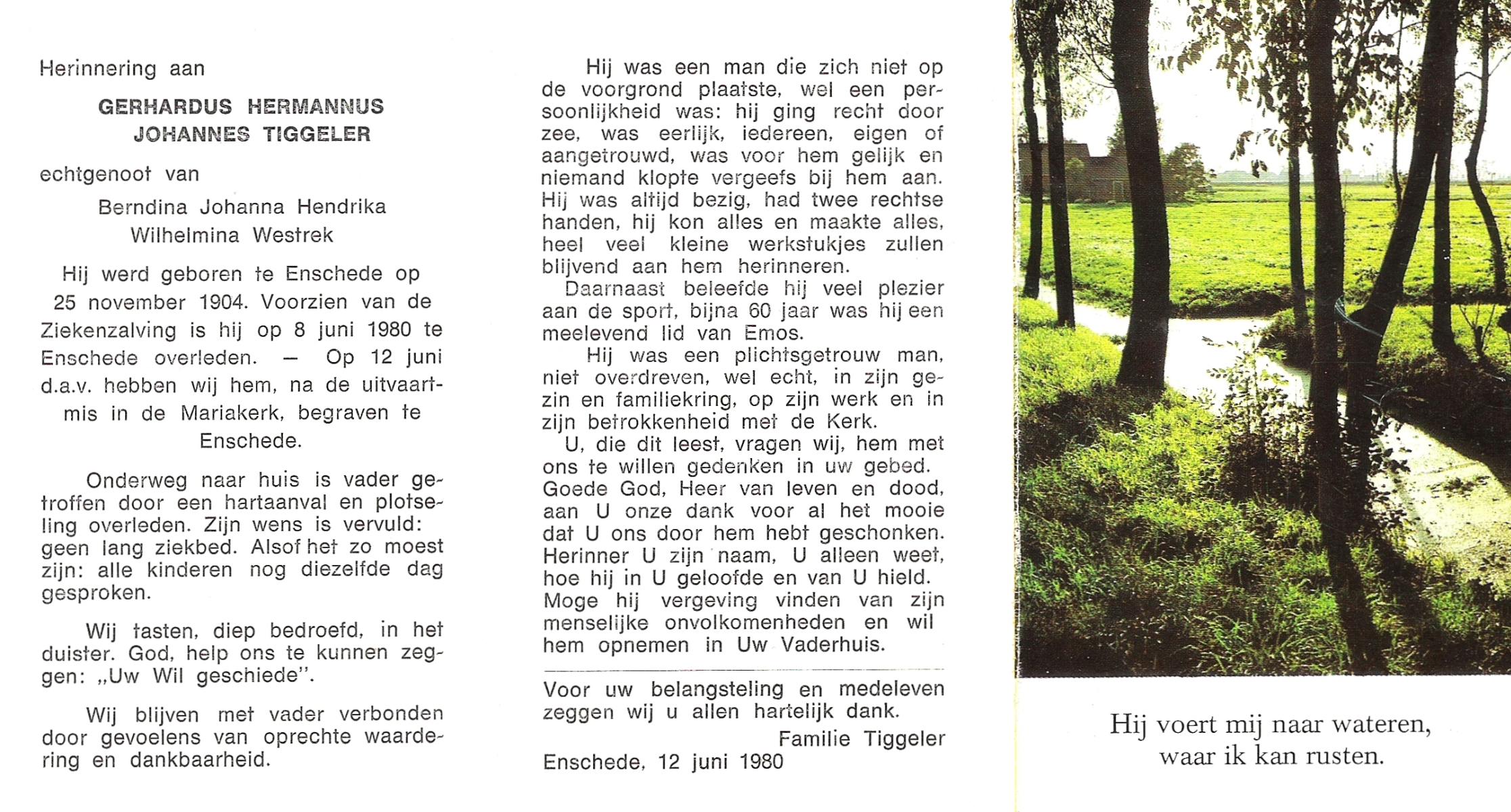 TIGGELER, Gerhardus Hermannus Johannes, geboren op 25-11-1904 te Enschede, overleden op 8-6-1980 te Enschede op 75-jarige leeftijd, begraven op 12-6-1980 te Enschede.