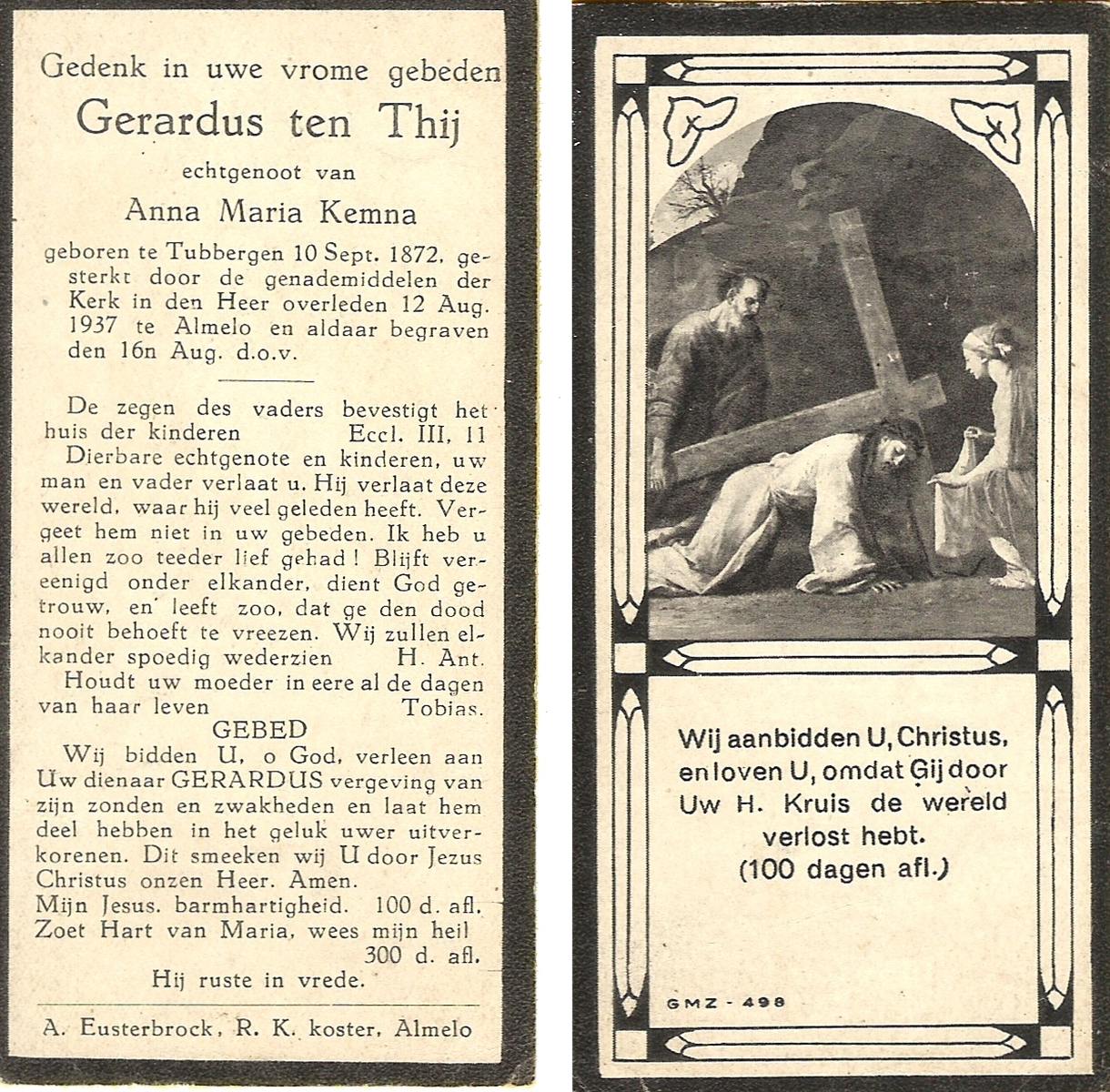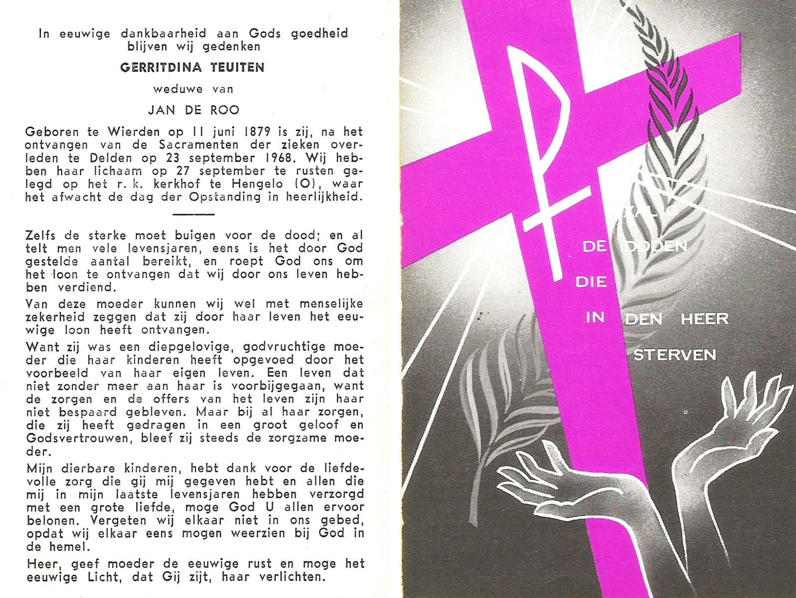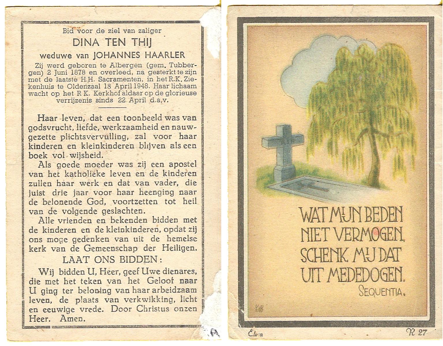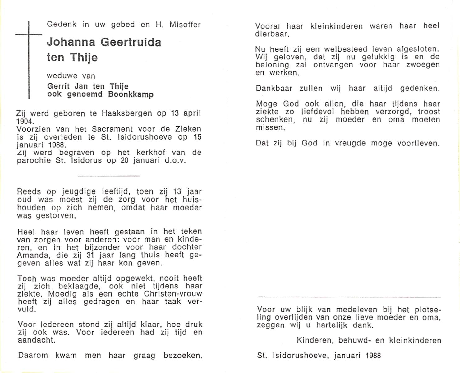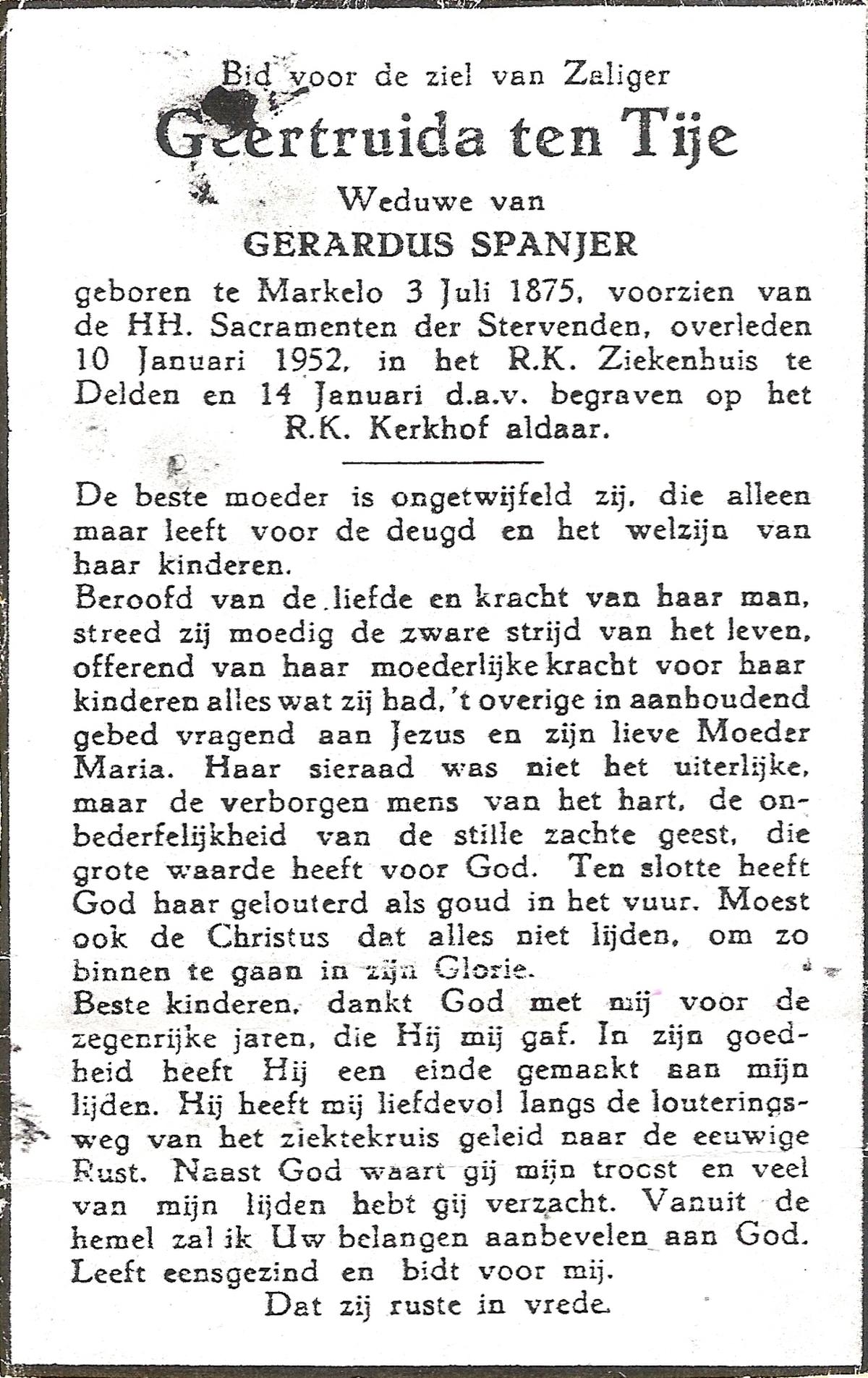 TIJE, ten, Geertruida, geboren op 03-07-1875 te Markelo, overleden op 10-1-1952 te Delden op 76-jarige leeftijd, begraven op 14-1-1952 te Delden.