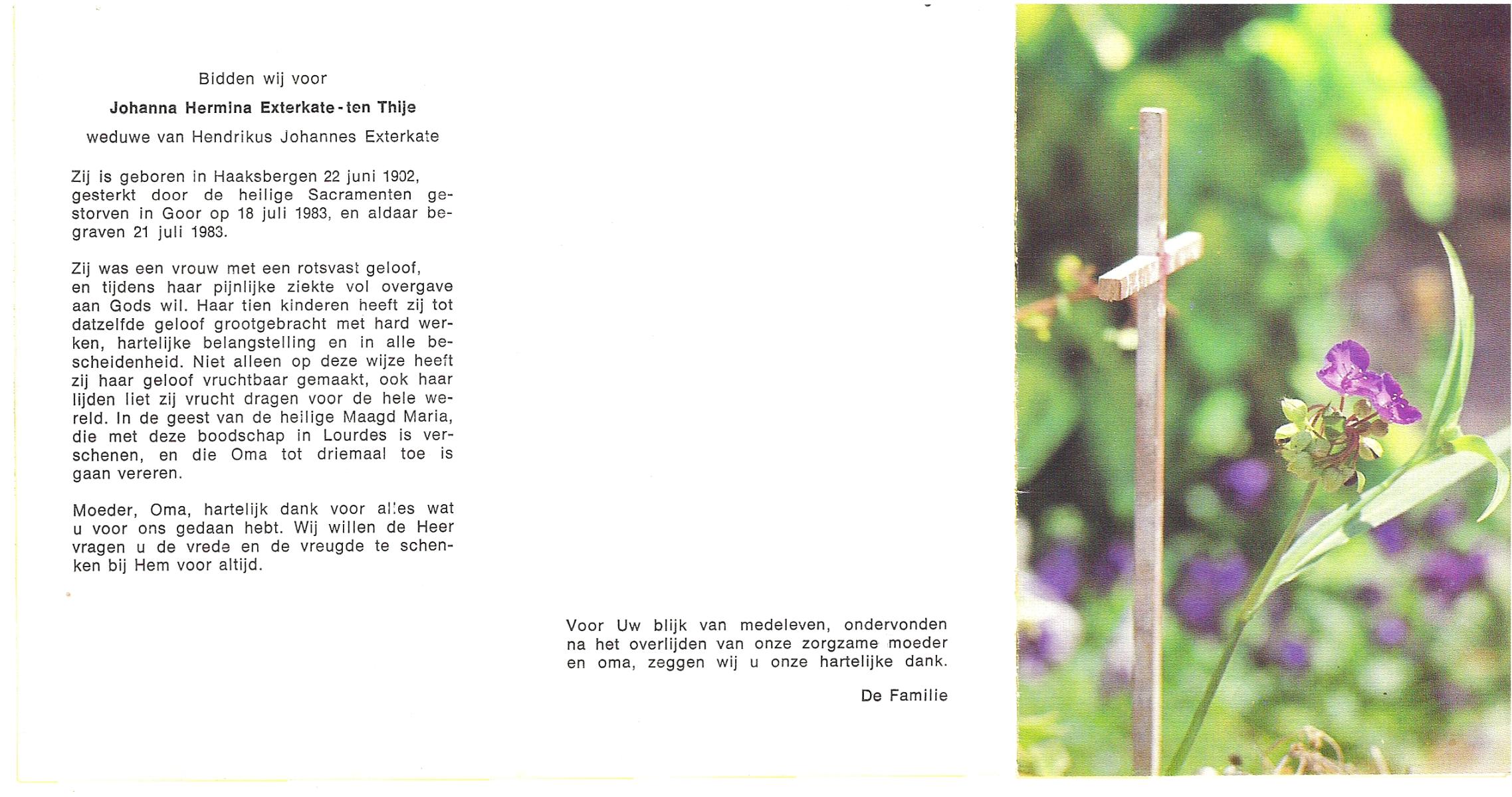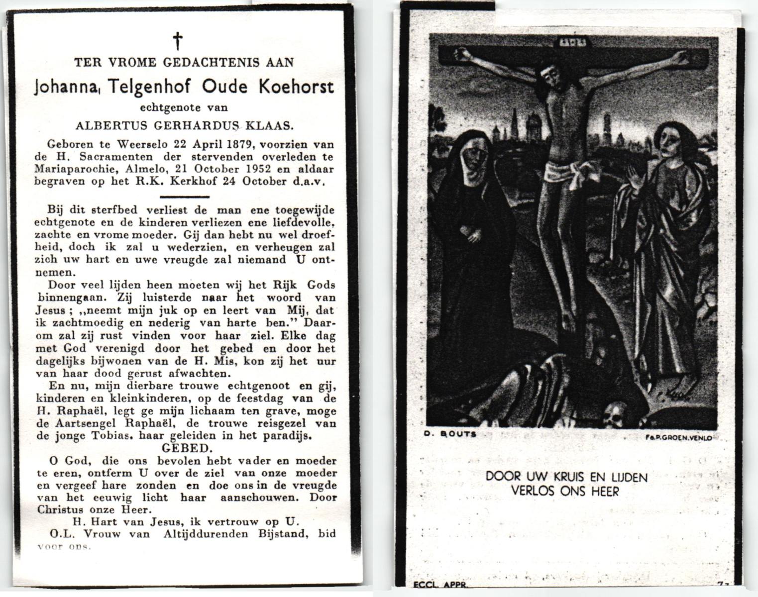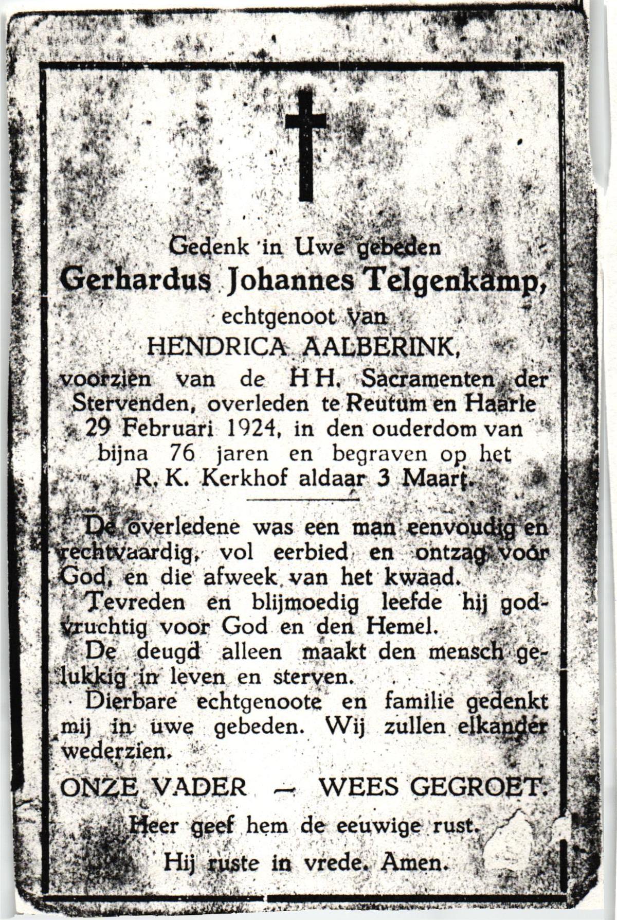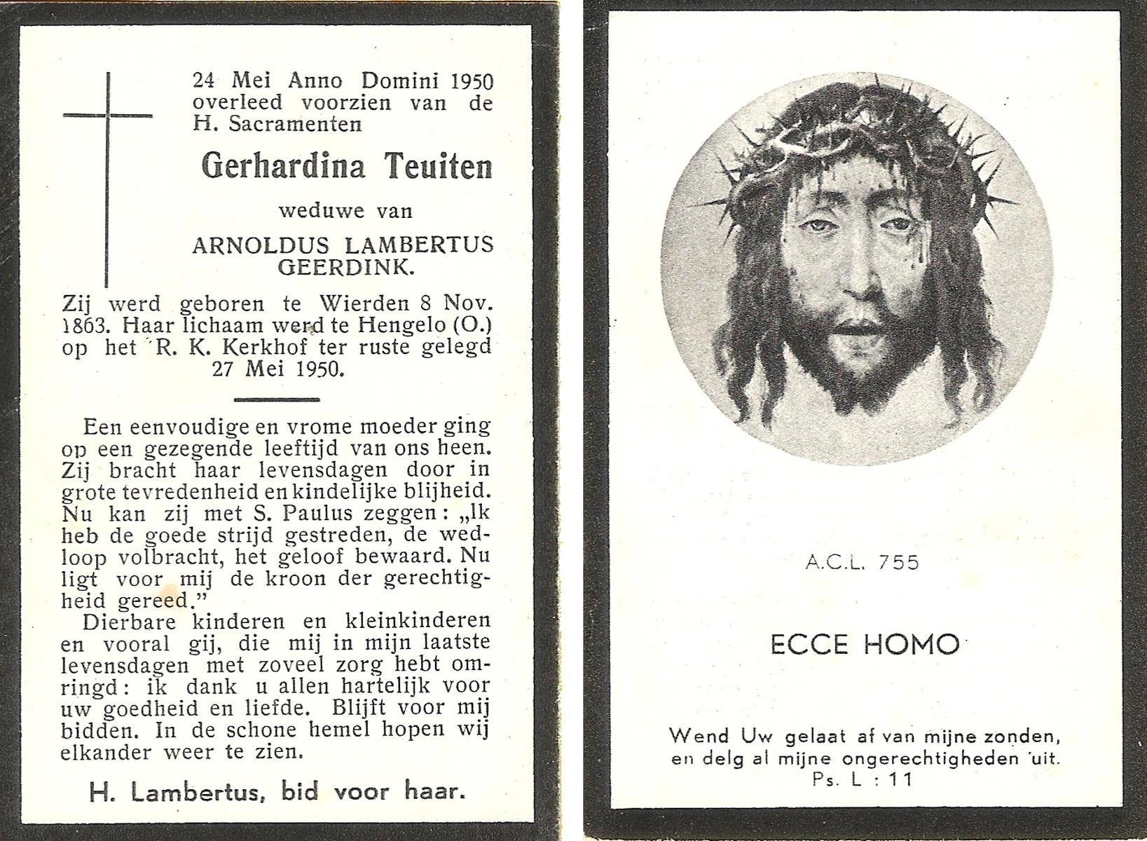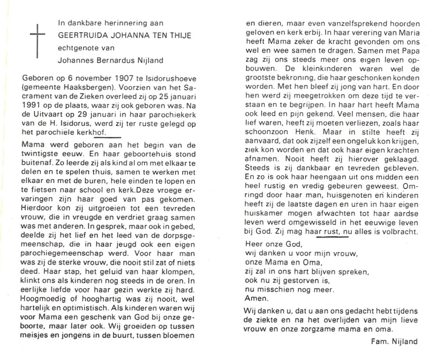 TIJE, ten, Geertruida, geboren op 03-07-1875 te Markelo, overleden op 10-1-1952 te Delden op 76-jarige leeftijd, begraven op 14-1-1952 te Delden.