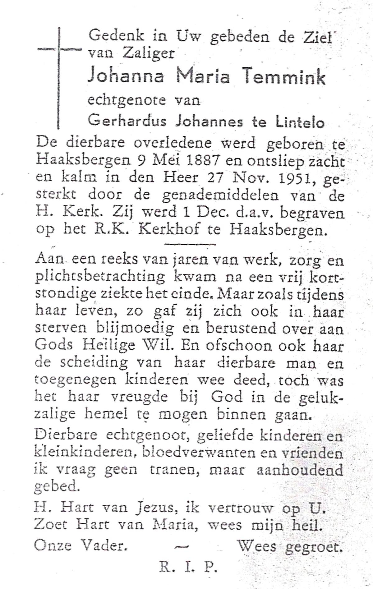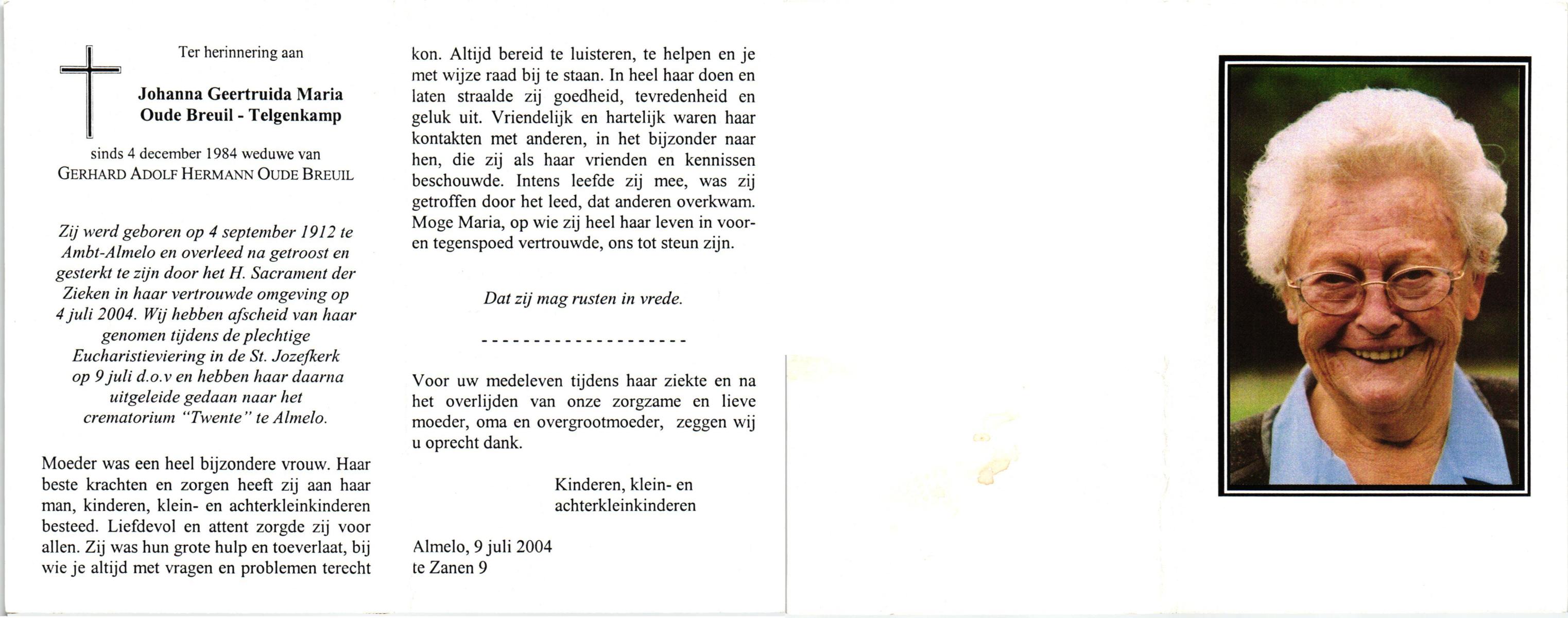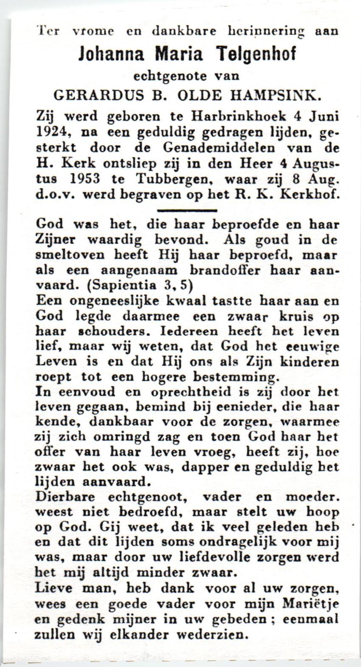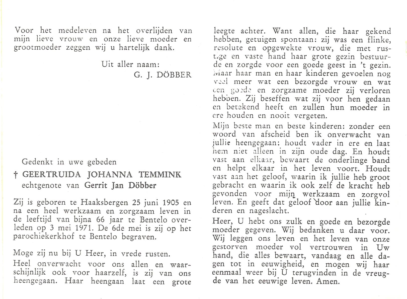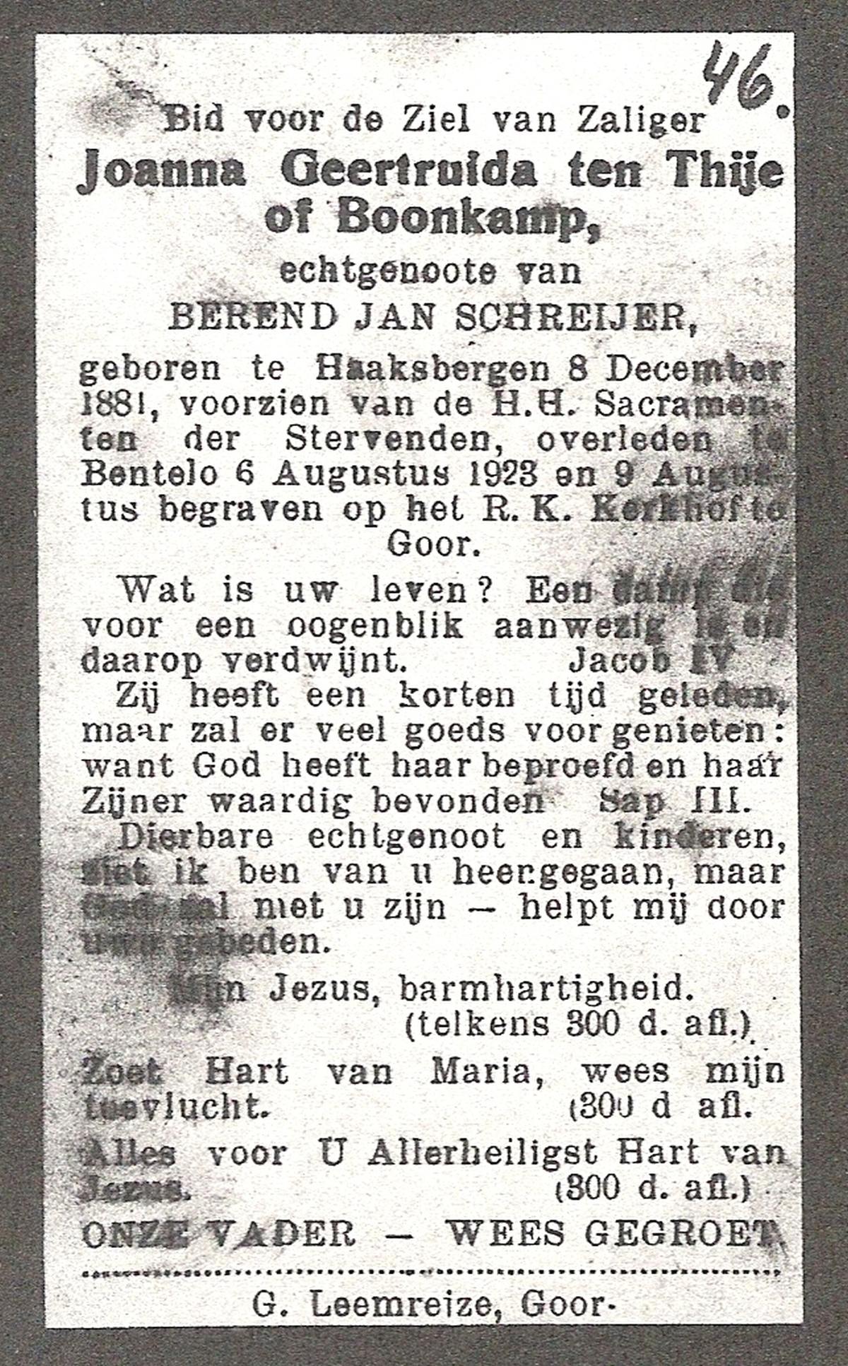 TIJE, ten, Geertruida, geboren op 03-07-1875 te Markelo, overleden op 10-1-1952 te Delden op 76-jarige leeftijd, begraven op 14-1-1952 te Delden.