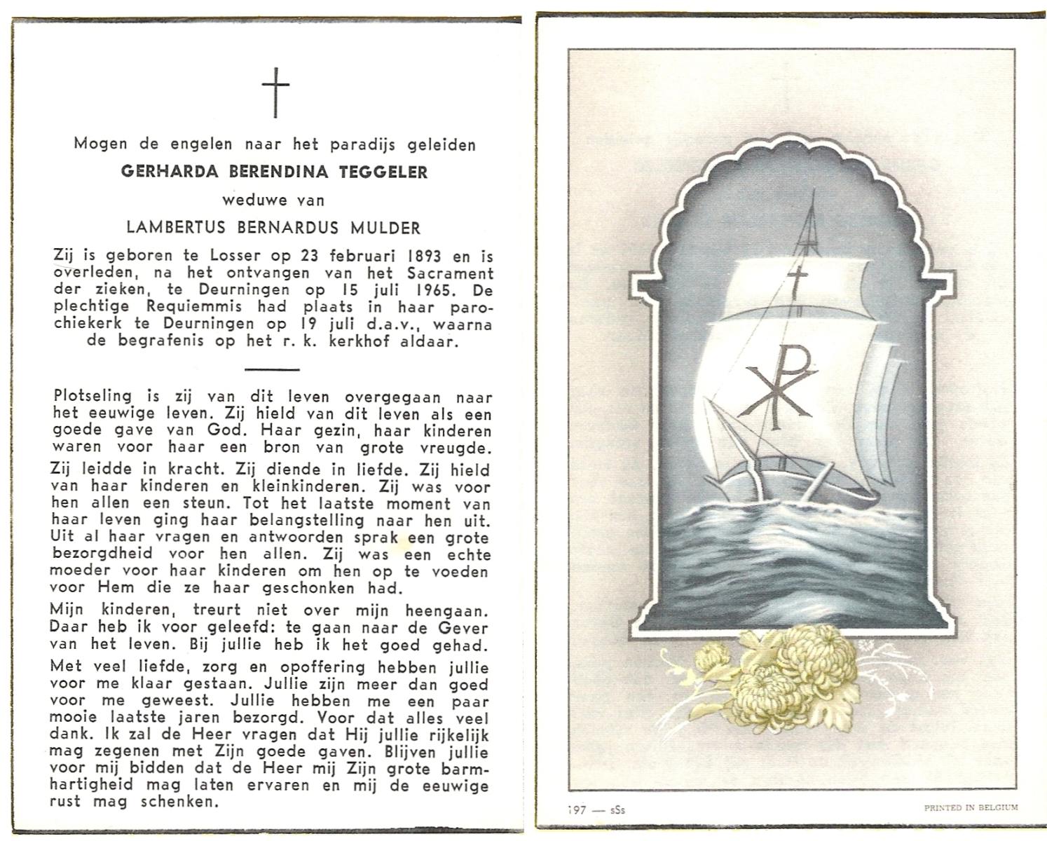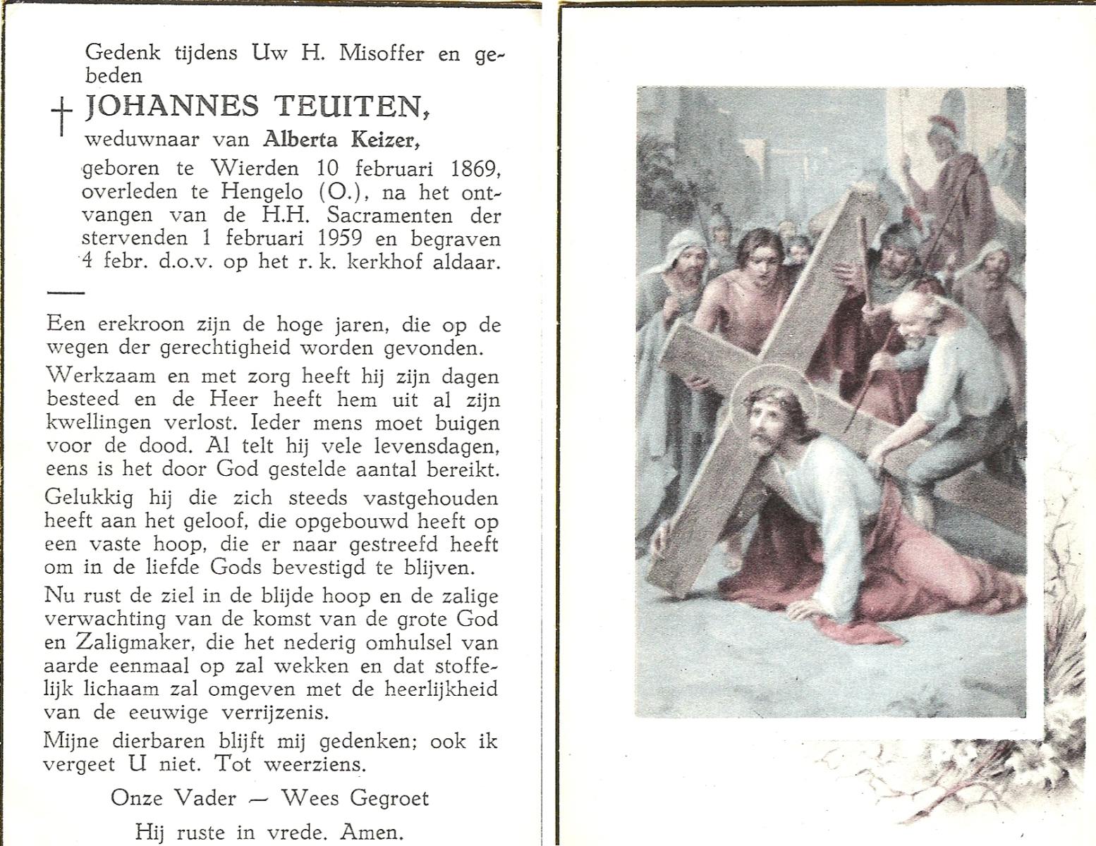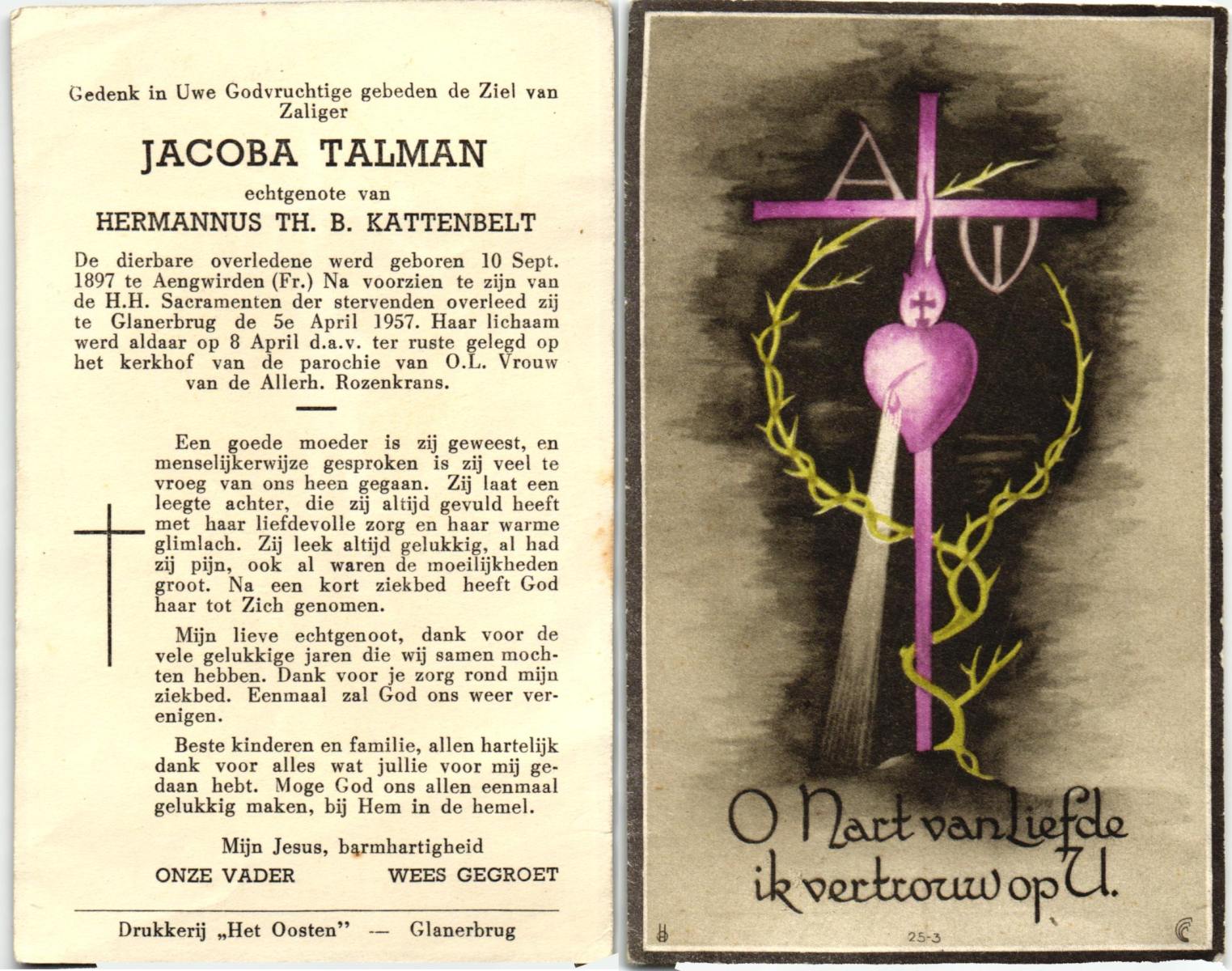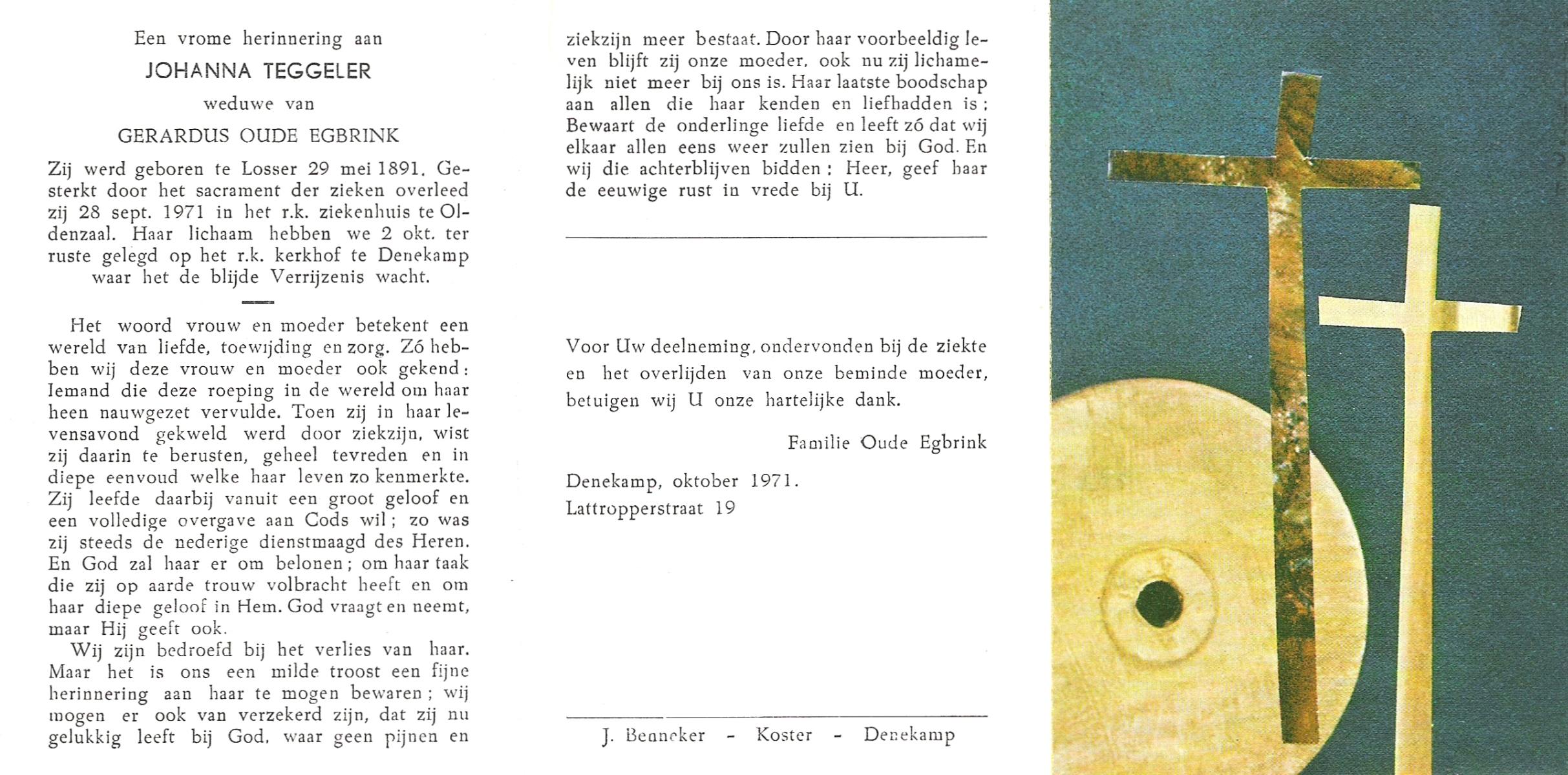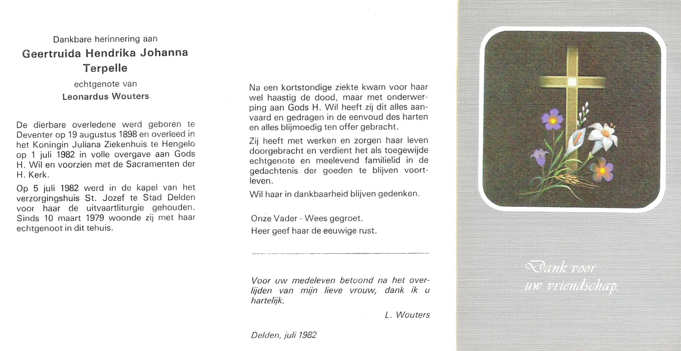 TIJE, ten, Geertruida, geboren op 03-07-1875 te Markelo, overleden op 10-1-1952 te Delden op 76-jarige leeftijd, begraven op 14-1-1952 te Delden.