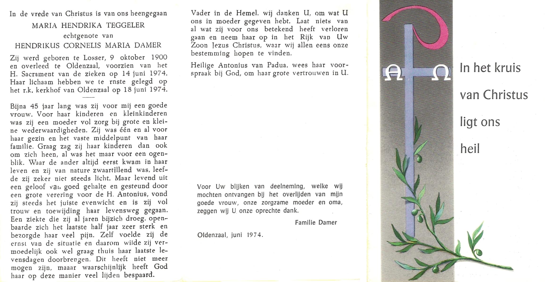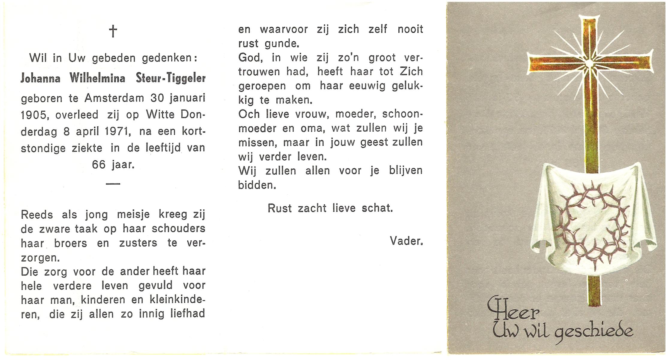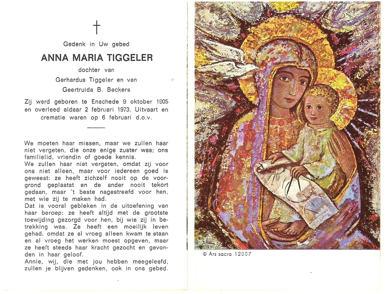TIGGELER, Anna Maria, geboren op 9-10-1905 te Enschede, overleden op 2-2-1973 te Enschede op 67-jarige leeftijd, gecremeerd op 6-2-1973 te Usselo.