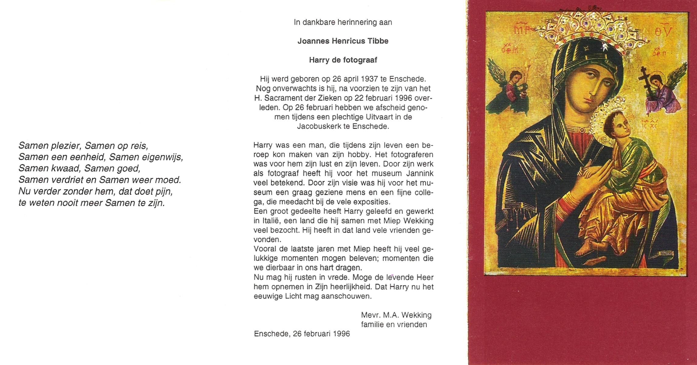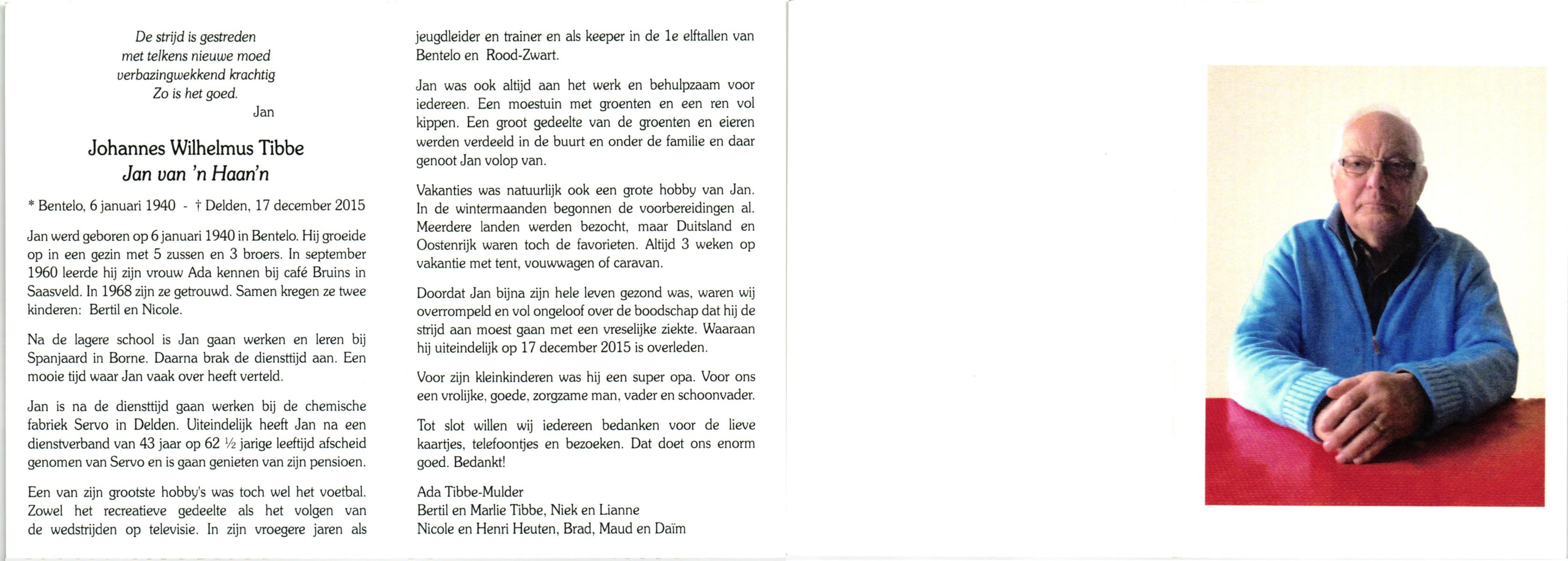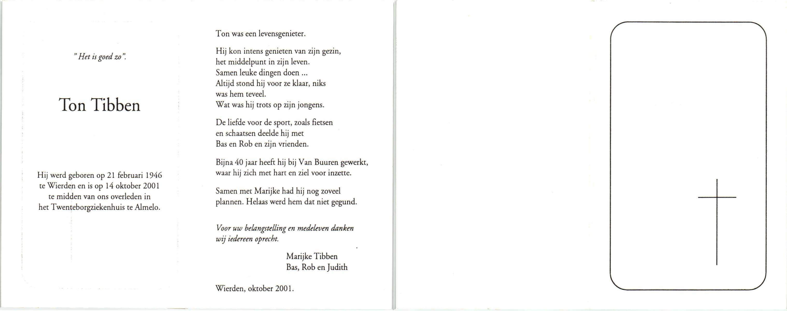 TIBBEN, Ton, geboren op 21-2-1946 te Wierden, overleden op 14-10-2001 te Almelo, ziekenhuis op 55-jarige leeftijd.