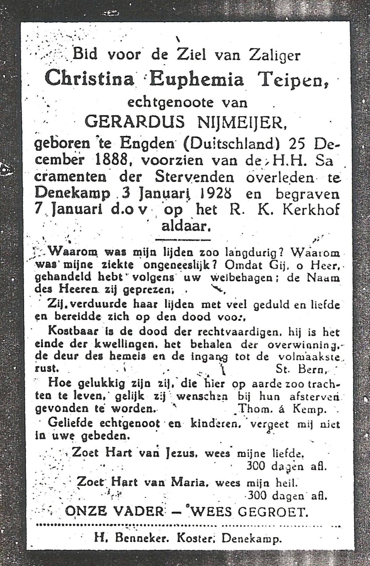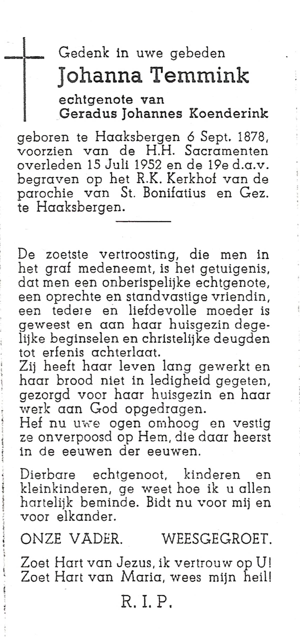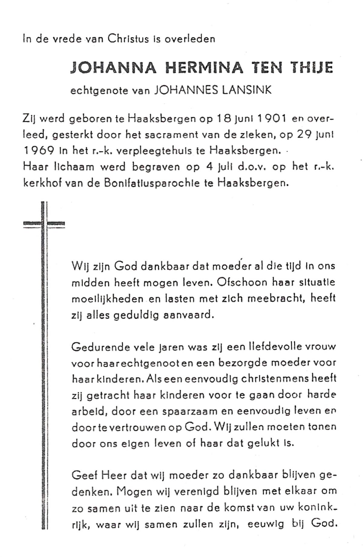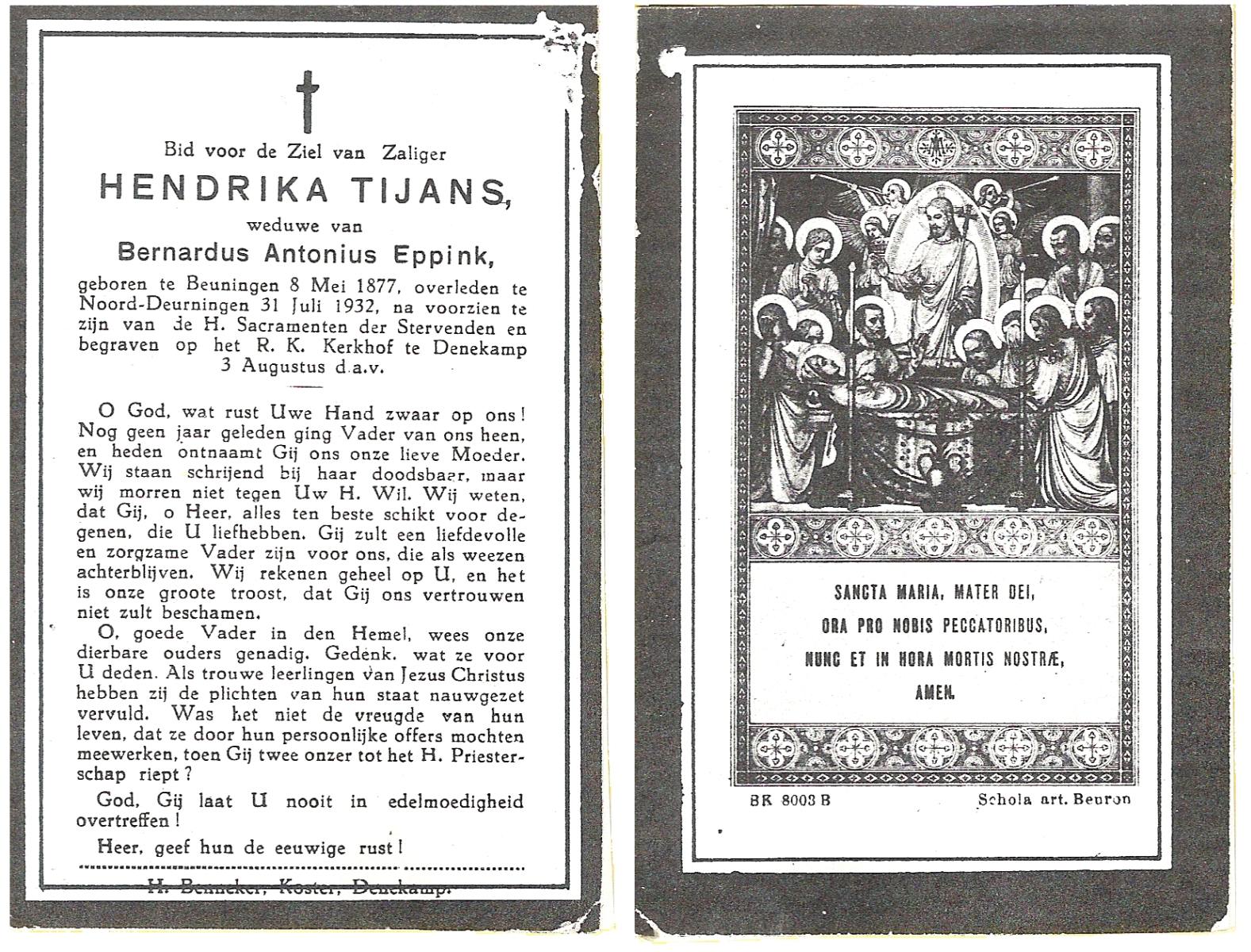 TIJANS, Hendrika, geboren op 08-05-1877 te Beuningen (Ov.), overleden op 31-7-1932 te Noord Deurningen op 55-jarige leeftijd, begraven op 3-8-1932 te Denekamp R.K.kerkhof.