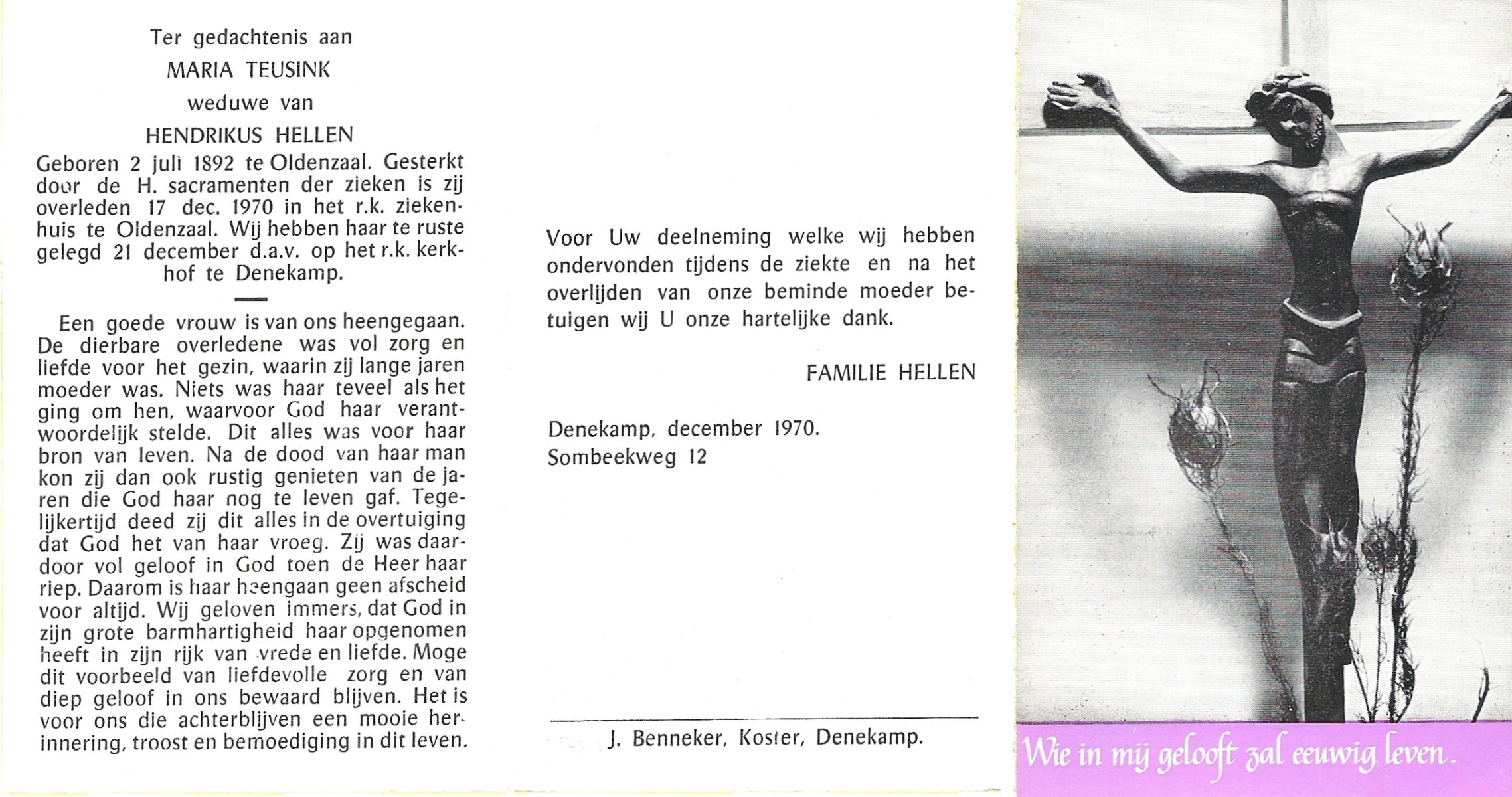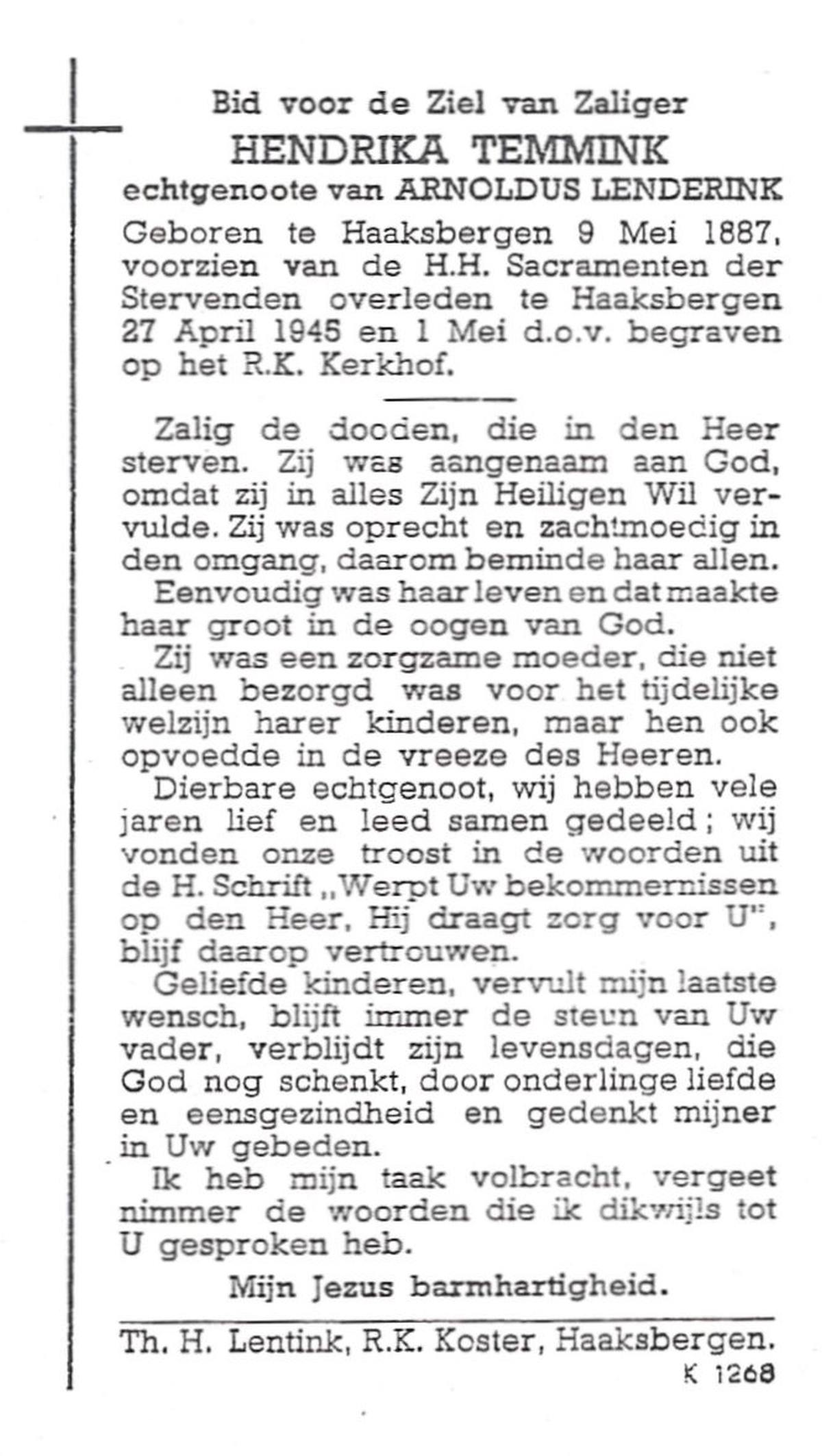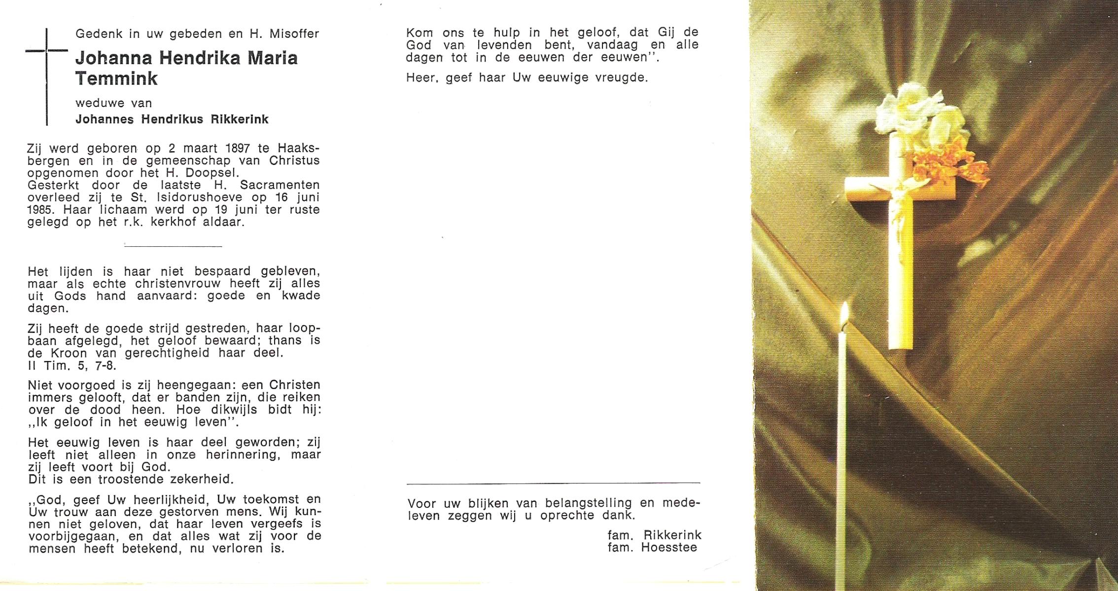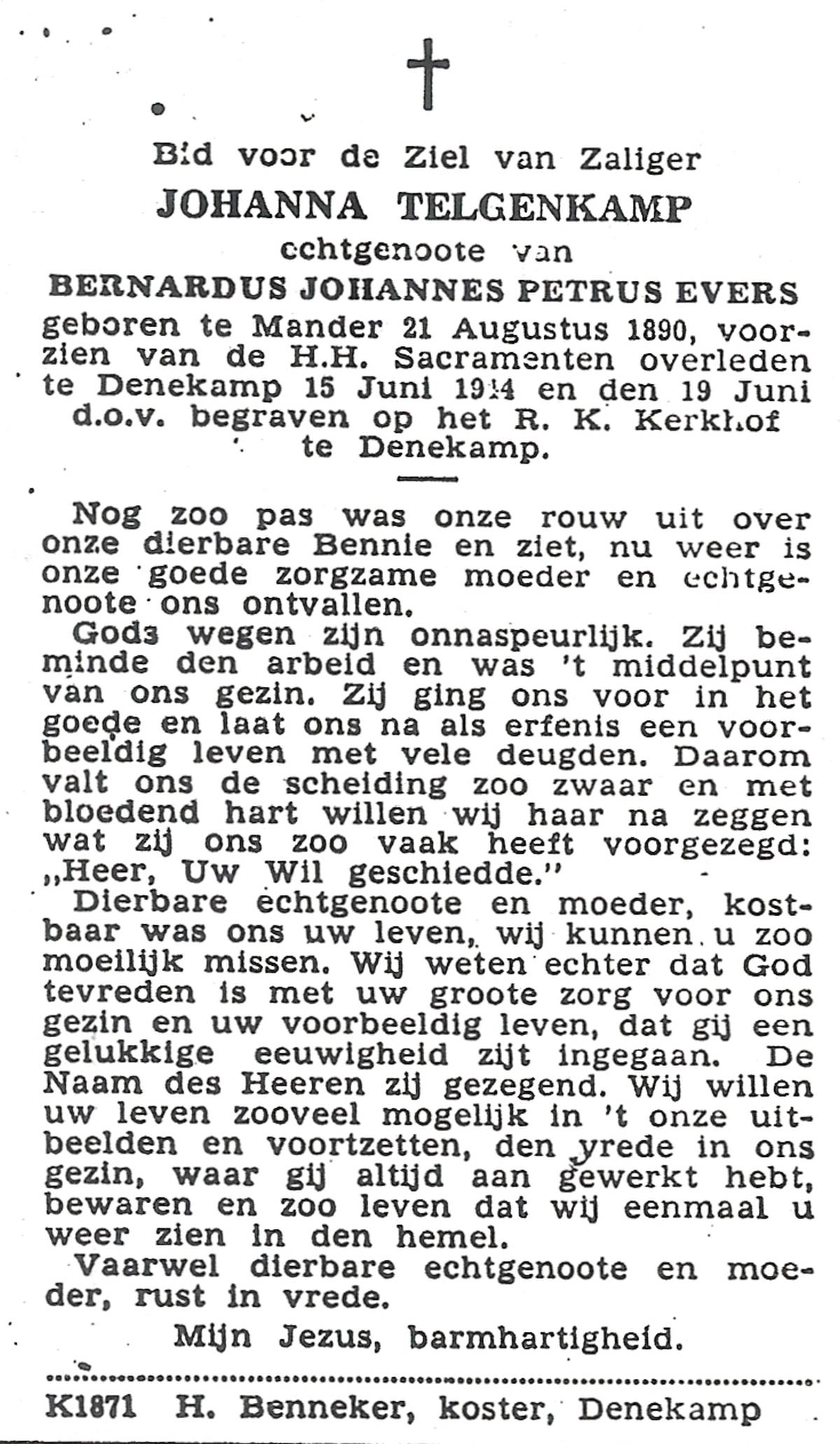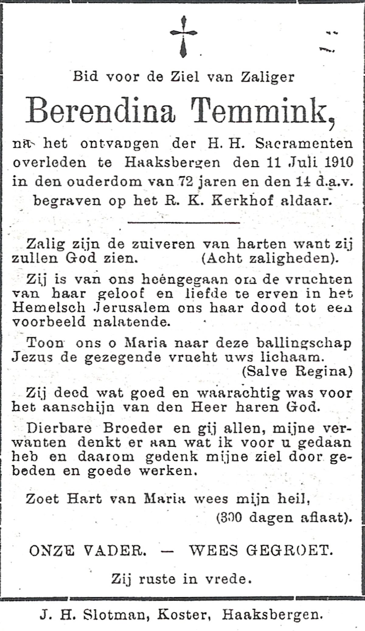 TIJANS, Hendrika, geboren op 08-05-1877 te Beuningen (Ov.), overleden op 31-7-1932 te Noord Deurningen op 55-jarige leeftijd, begraven op 3-8-1932 te Denekamp R.K.kerkhof.