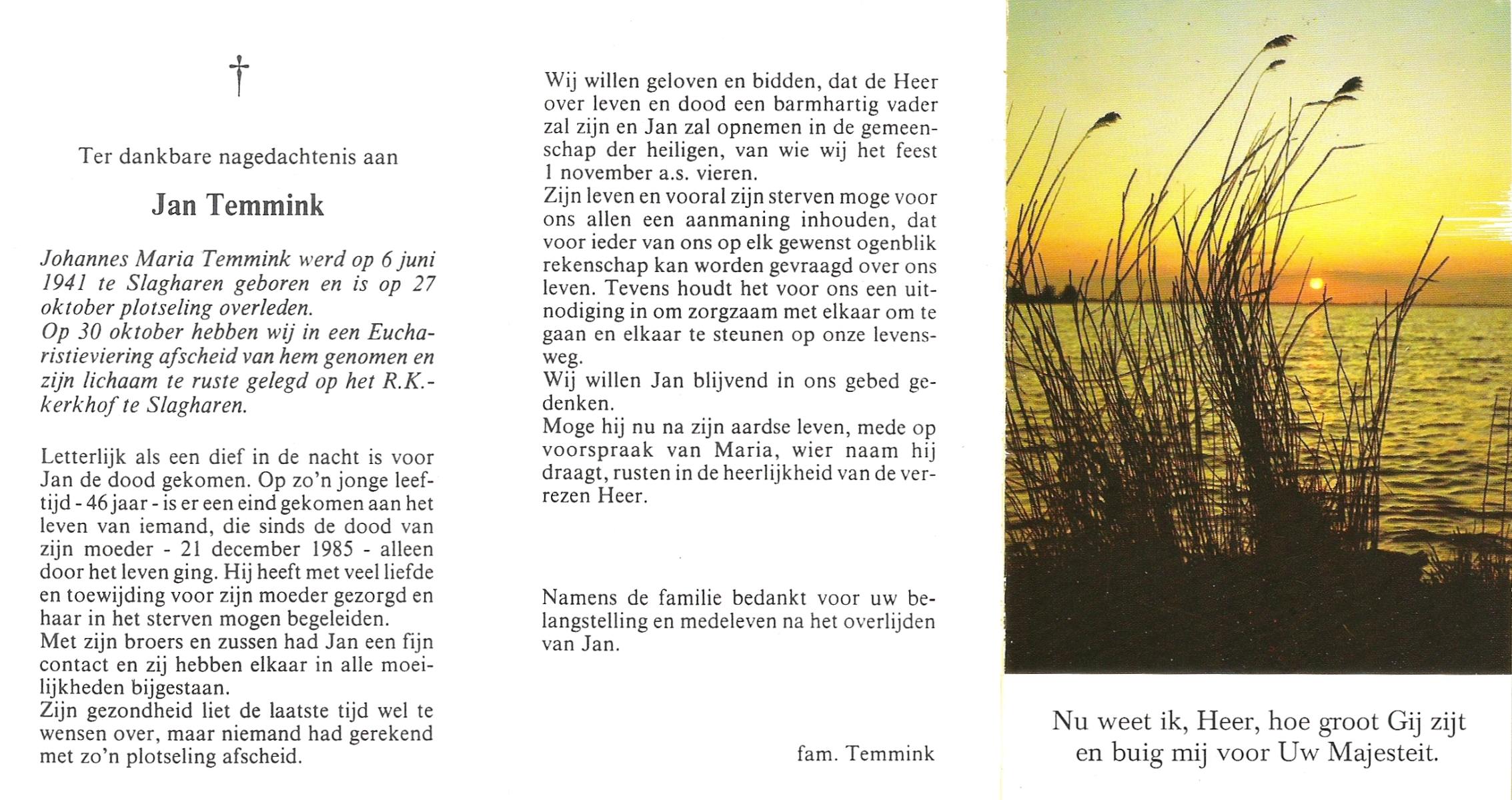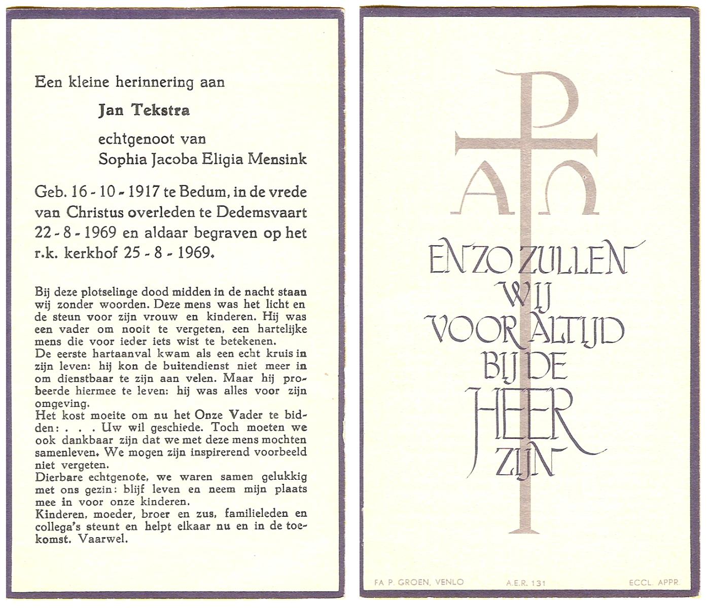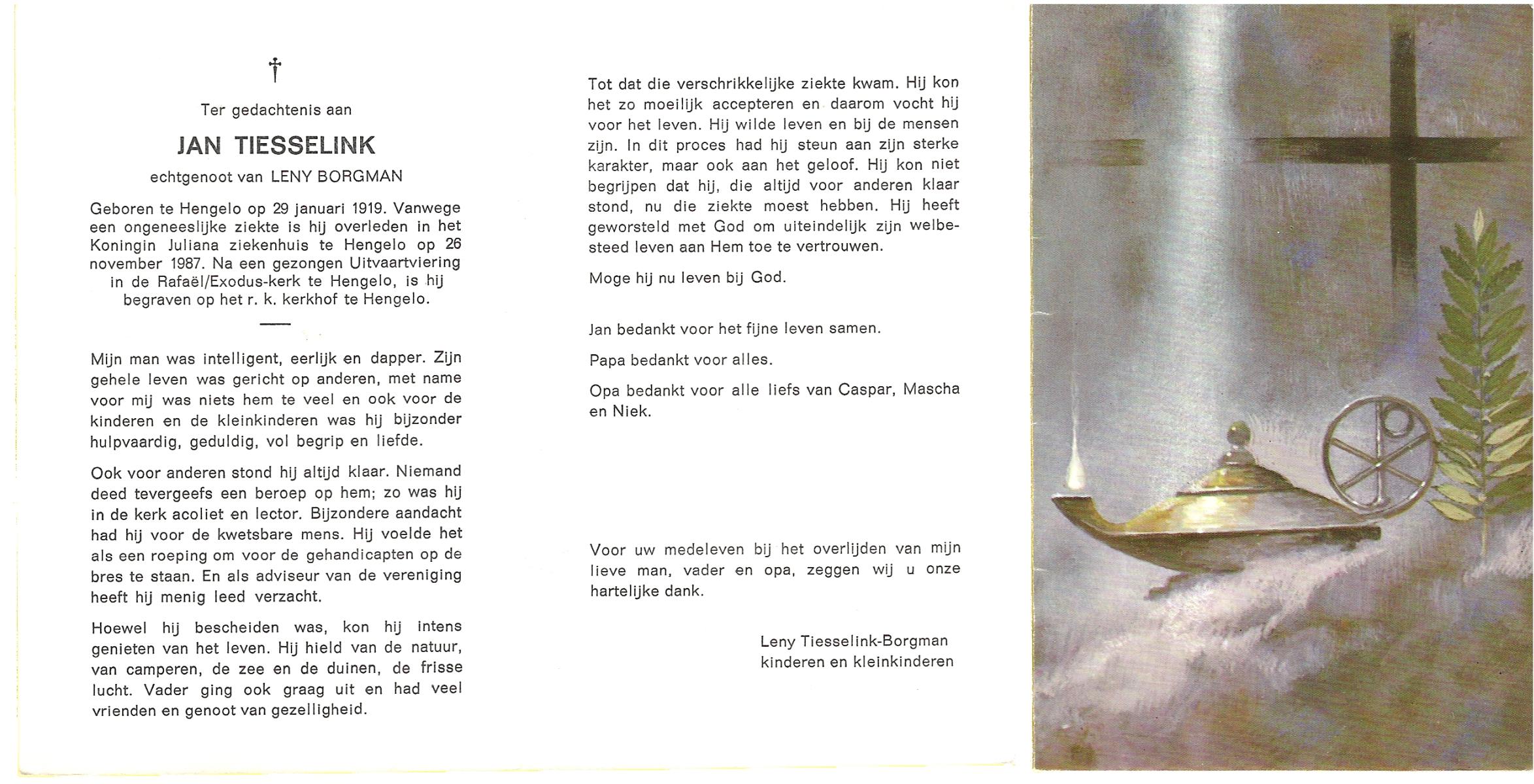 TIESSELINK, Jan, geboren op 29-1-1919 te Hengelo (O), overleden op 26-11-1987 te Hengelo (Ov.) op 68-jarige leeftijd, begraven te Hengelo (Ov.).