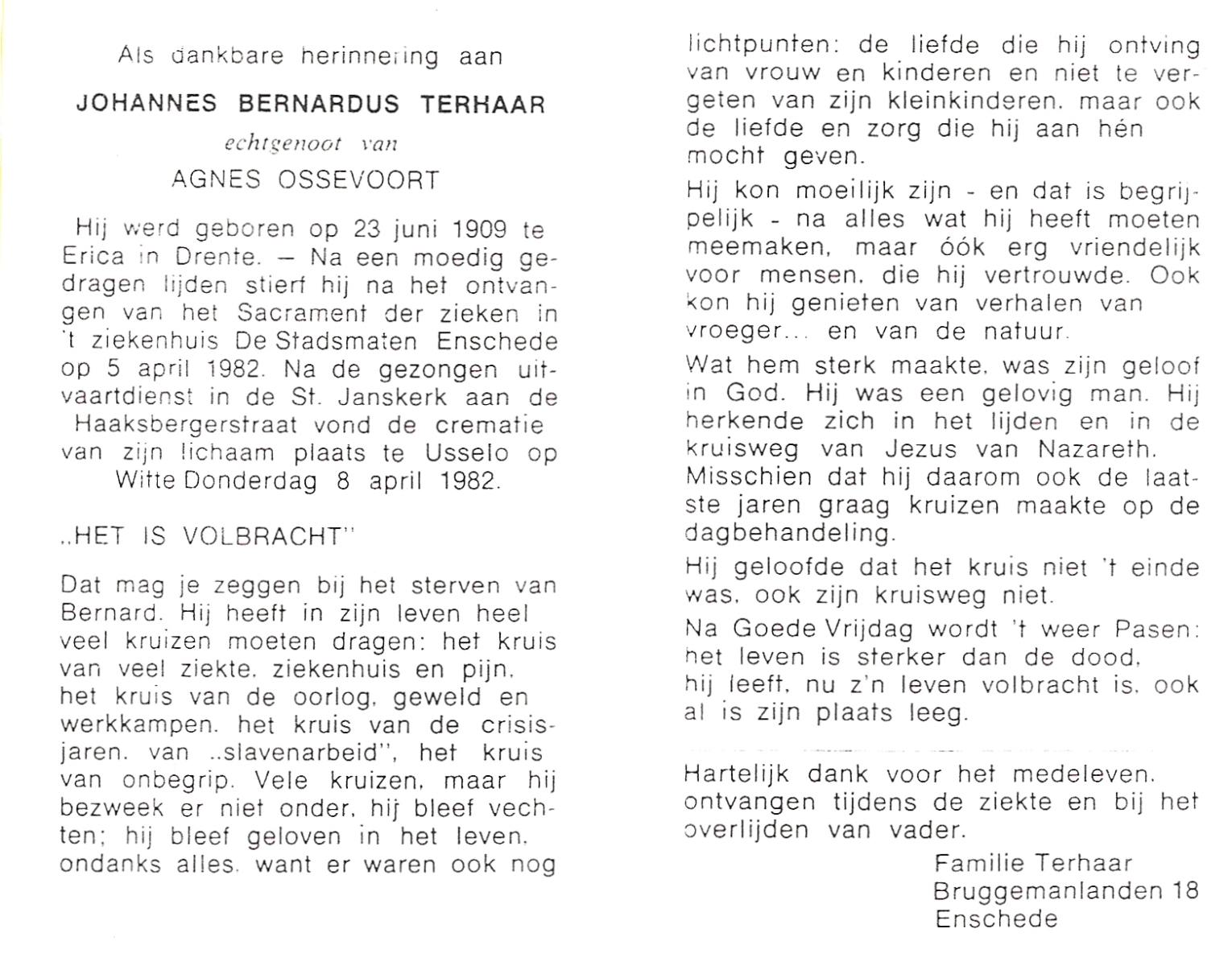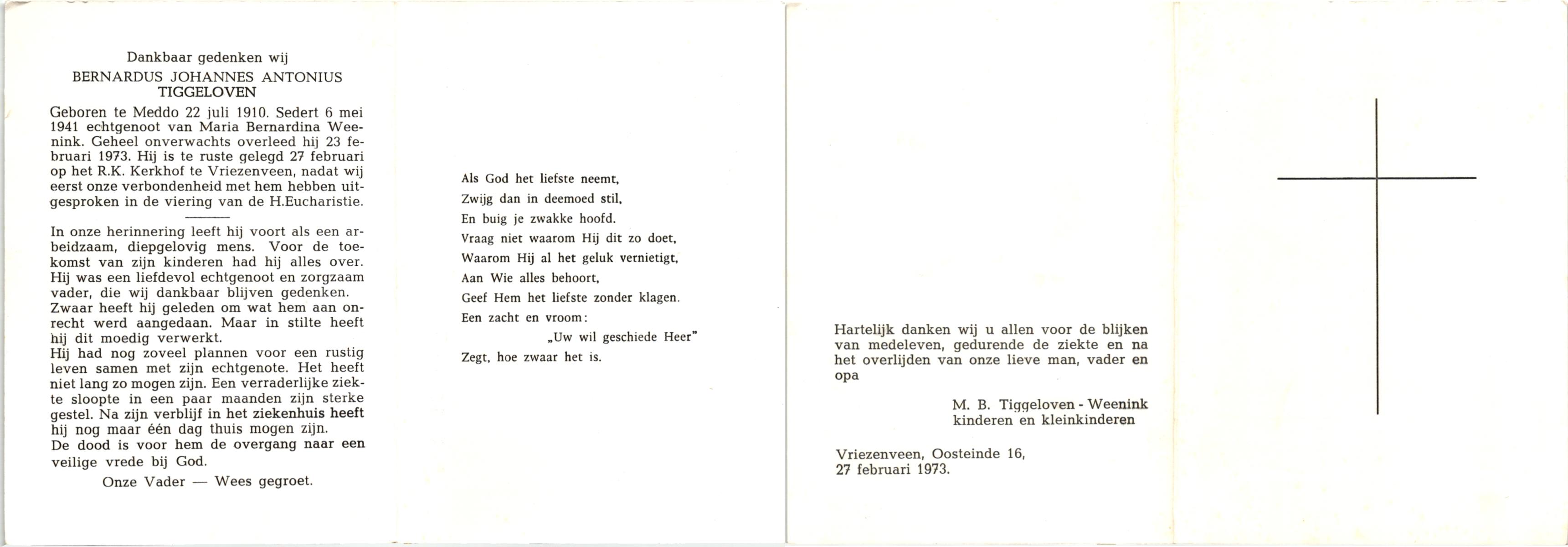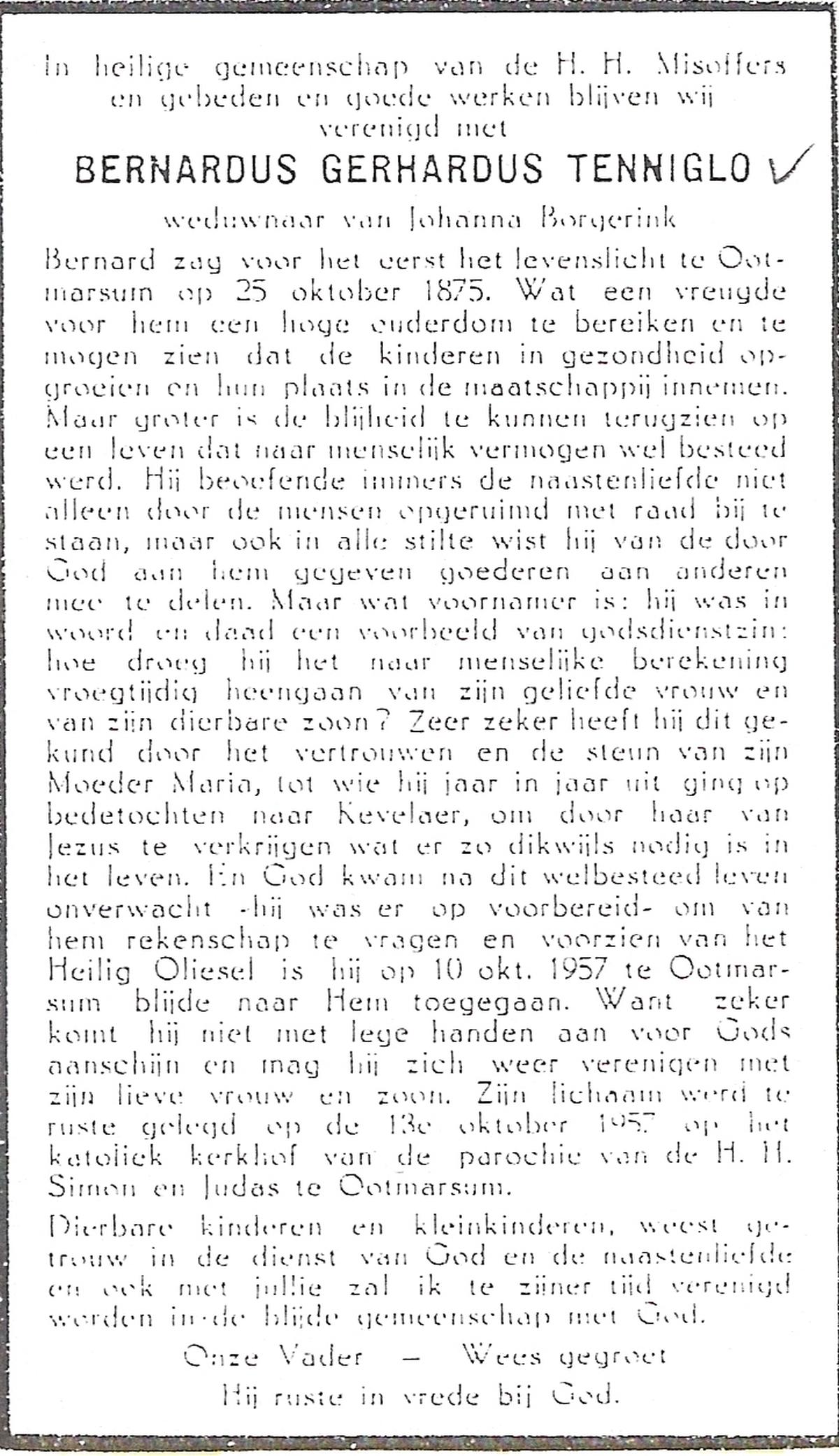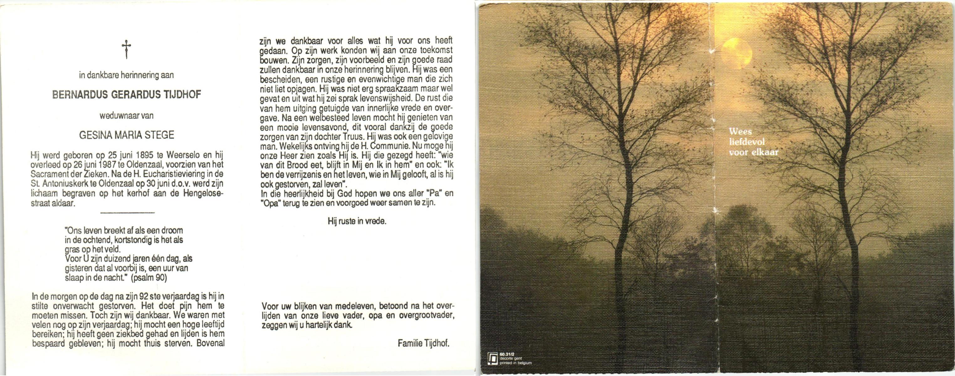 TIJDHOF, Bernardus Gerardus, geboren op 25-06-1895 te Weerselo, overleden op 26-6-1987 te Oldenzaal op 92-jarige leeftijd, begraven op 30-6-1987 te Oldenzaal.