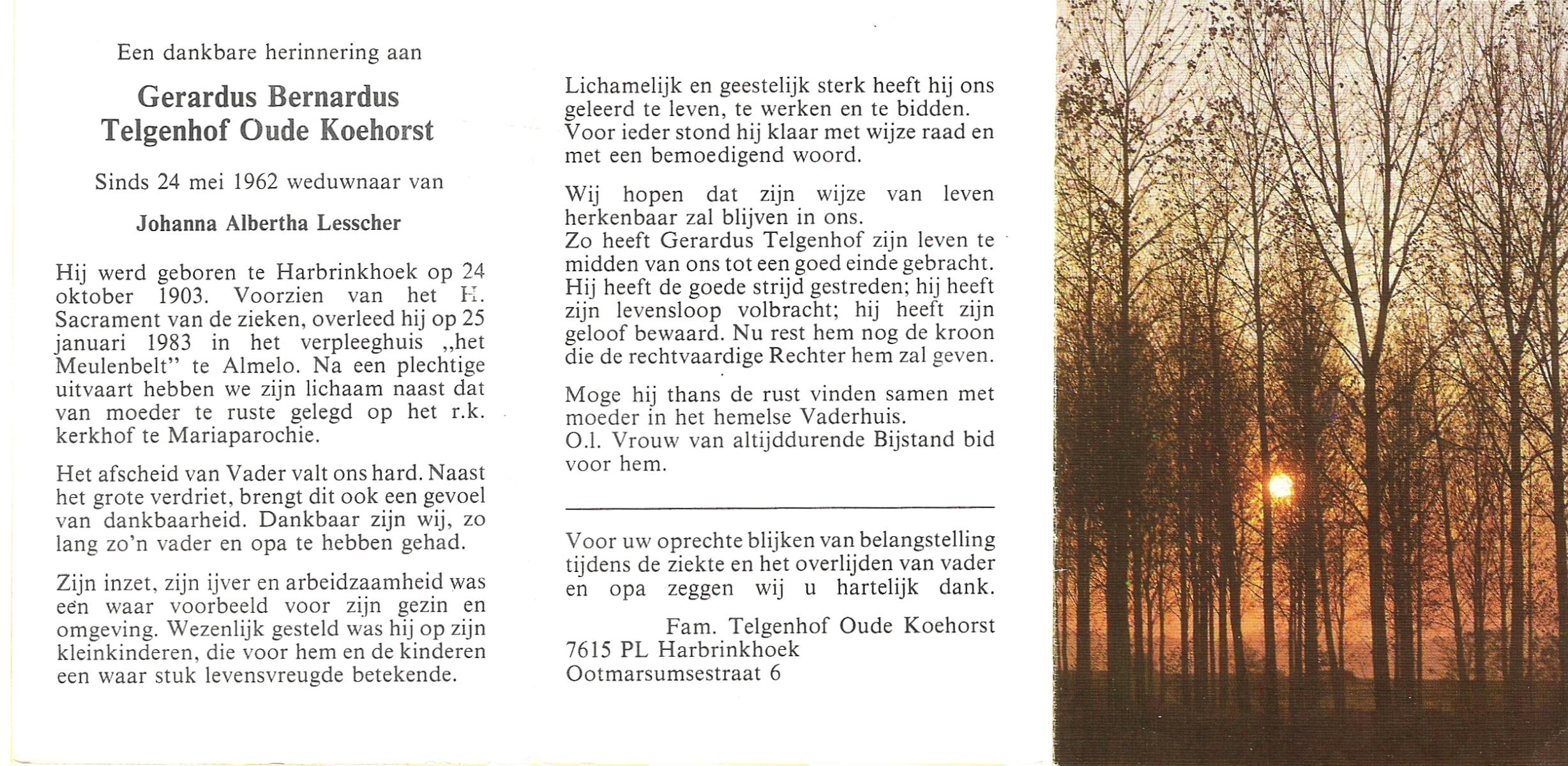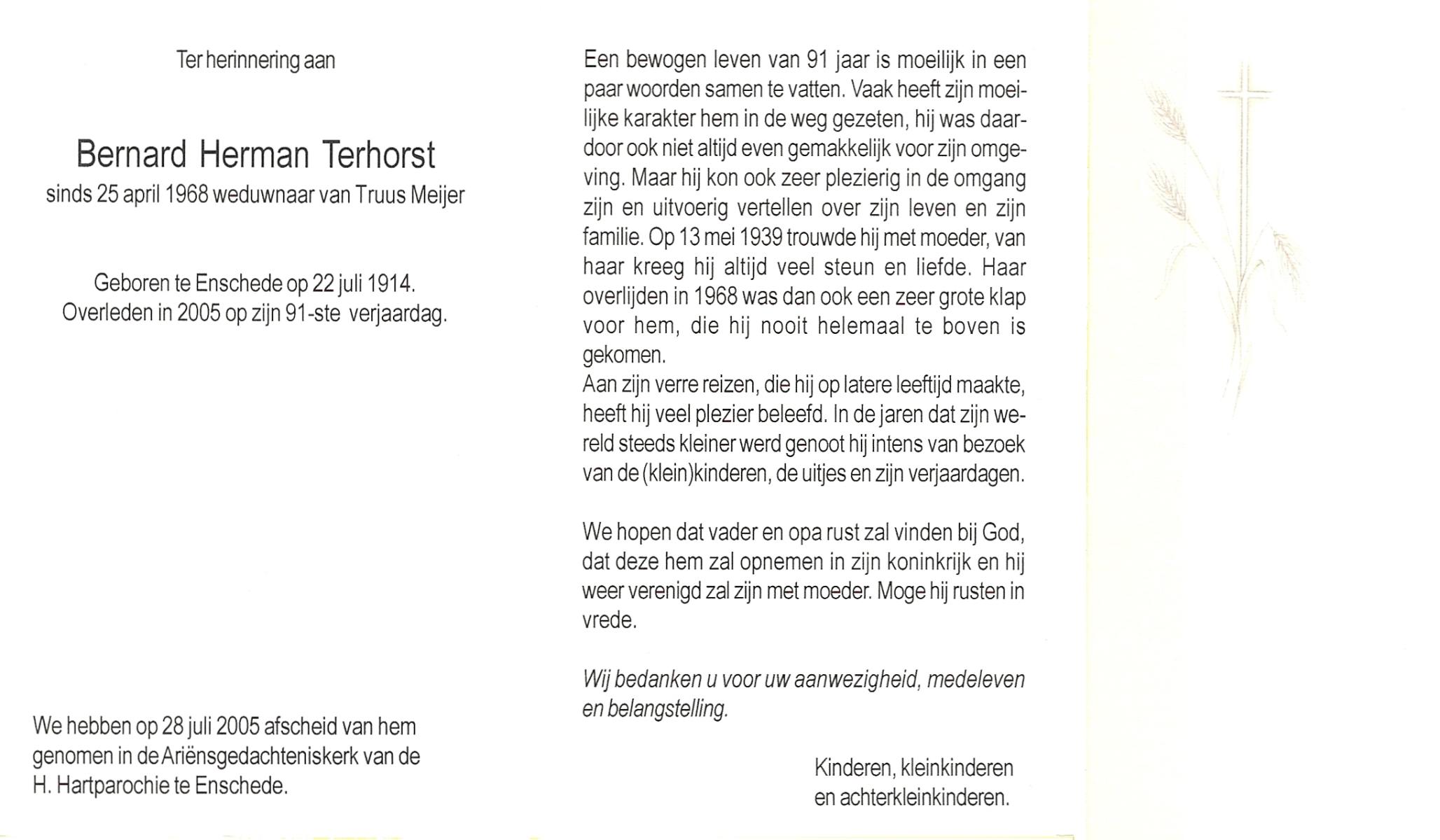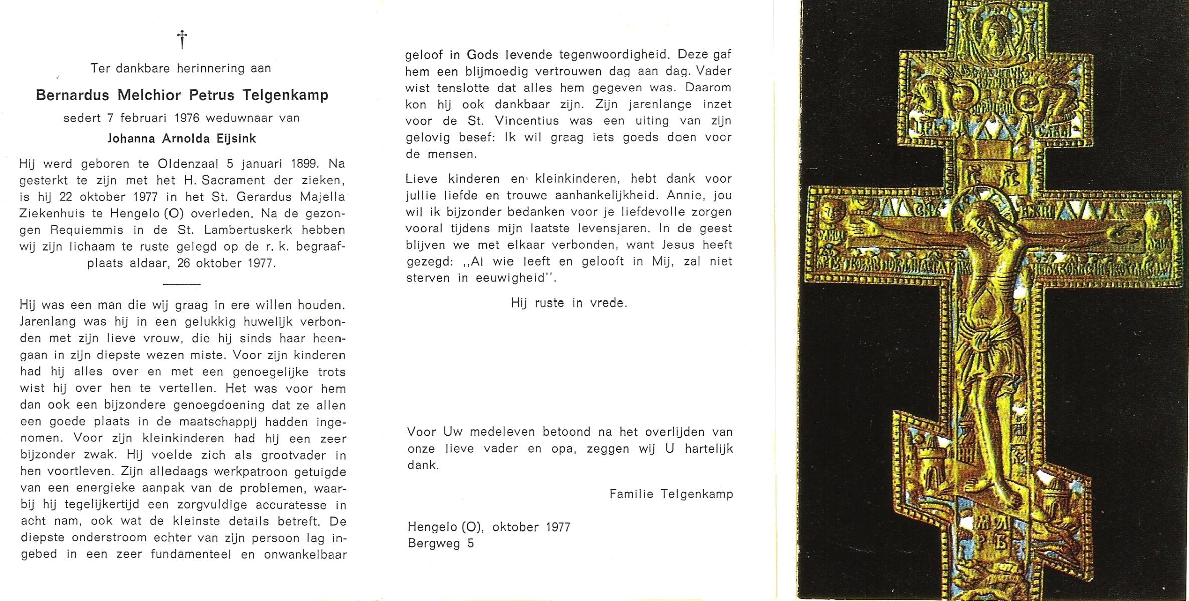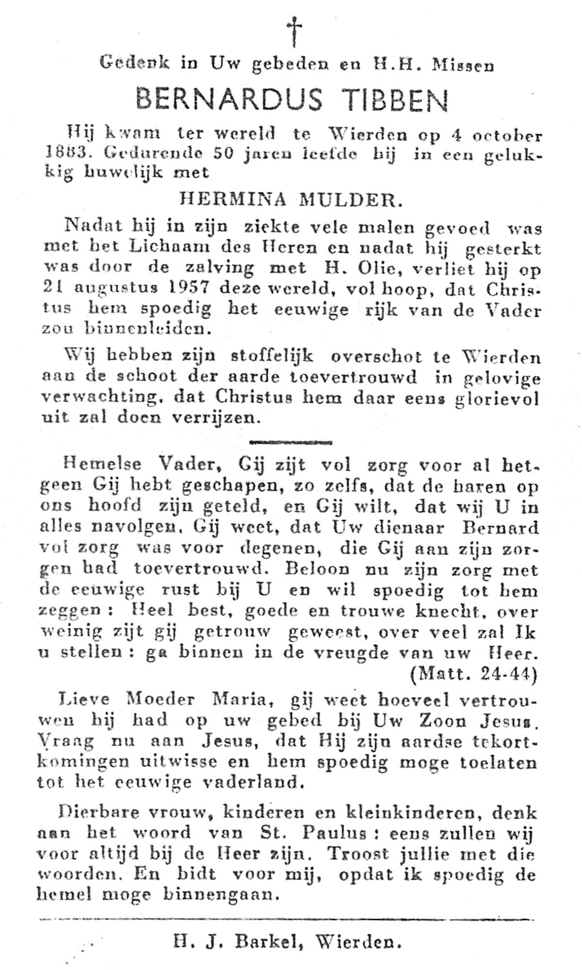 TIJDHOF, Bernardus Gerardus, geboren op 25-06-1895 te Weerselo, overleden op 26-6-1987 te Oldenzaal op 92-jarige leeftijd, begraven op 30-6-1987 te Oldenzaal.