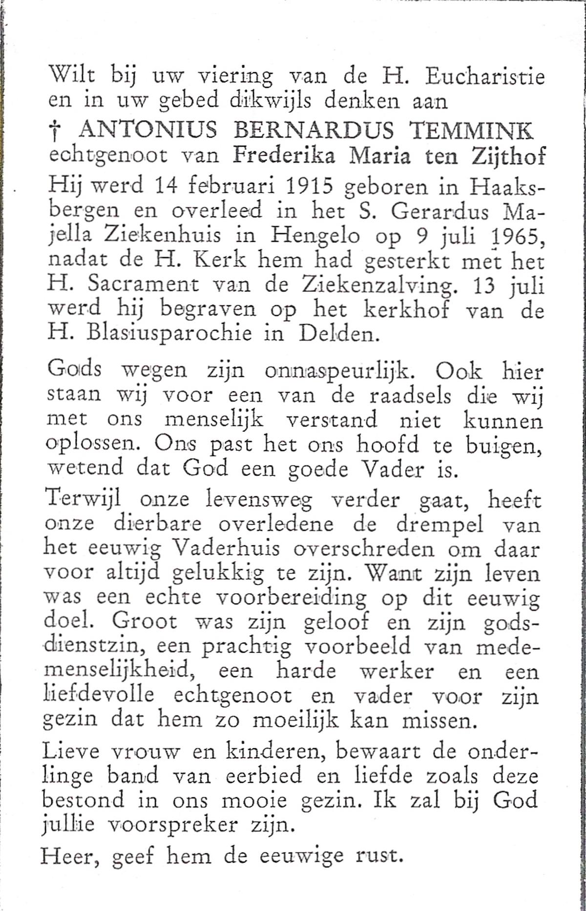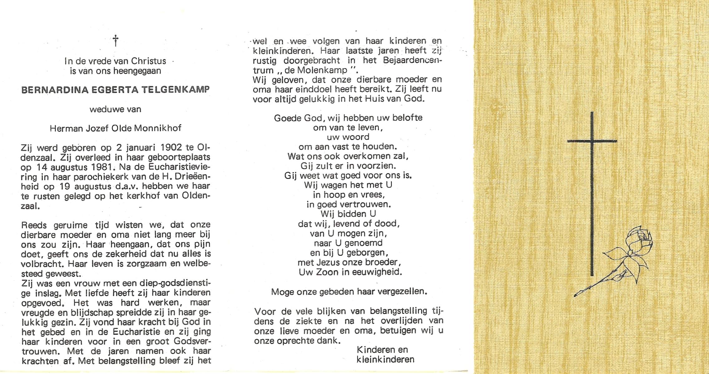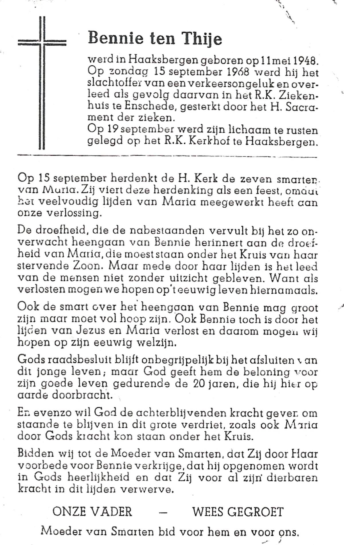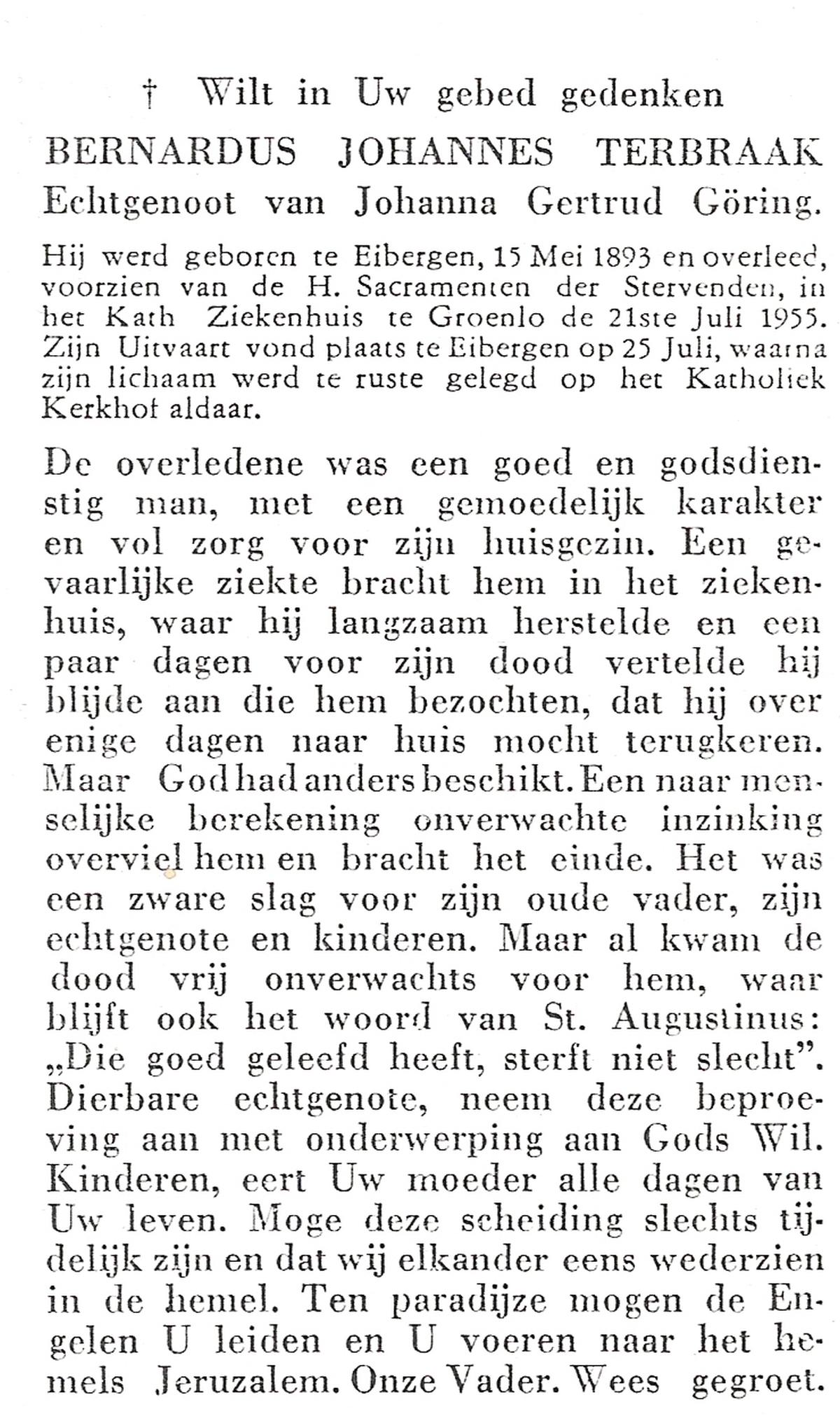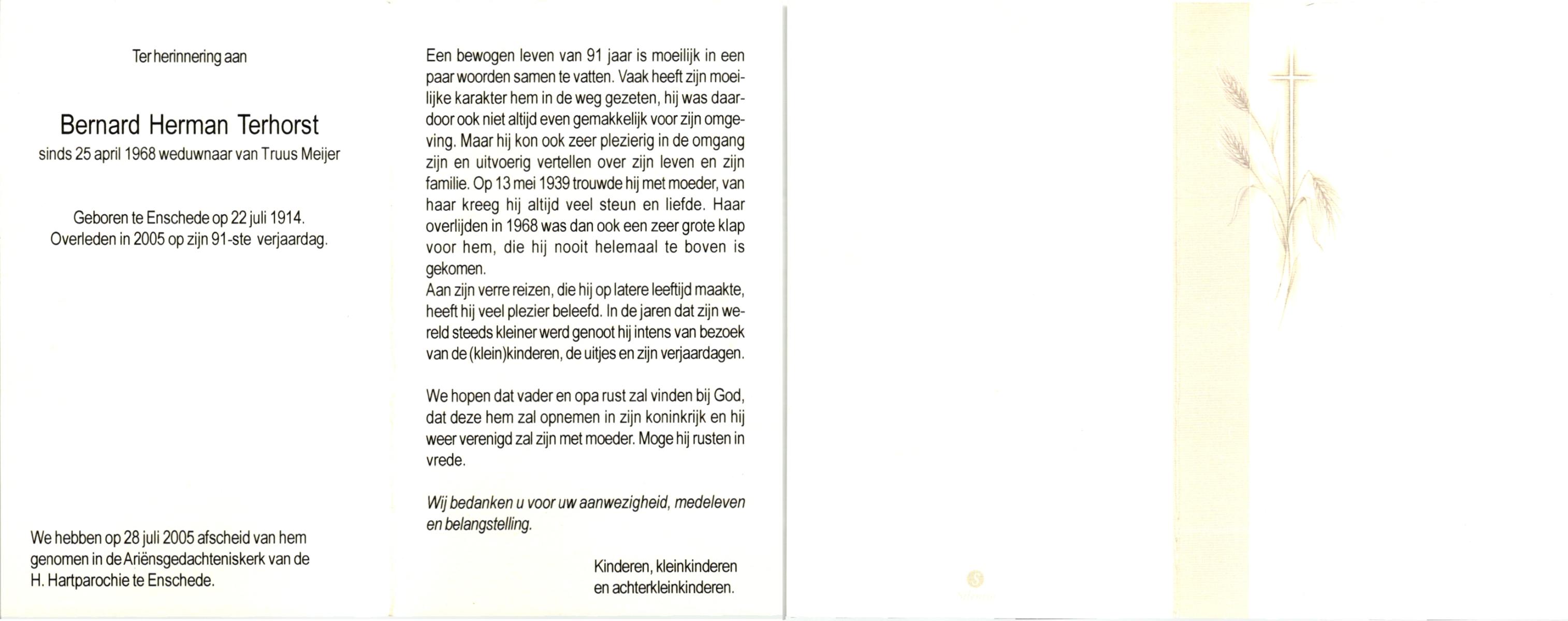 TIJDHOF, Bernardus Gerardus, geboren op 25-06-1895 te Weerselo, overleden op 26-6-1987 te Oldenzaal op 92-jarige leeftijd, begraven op 30-6-1987 te Oldenzaal.