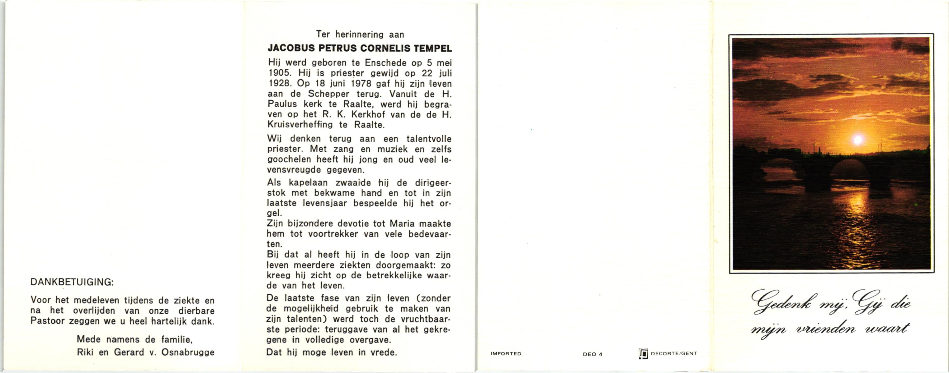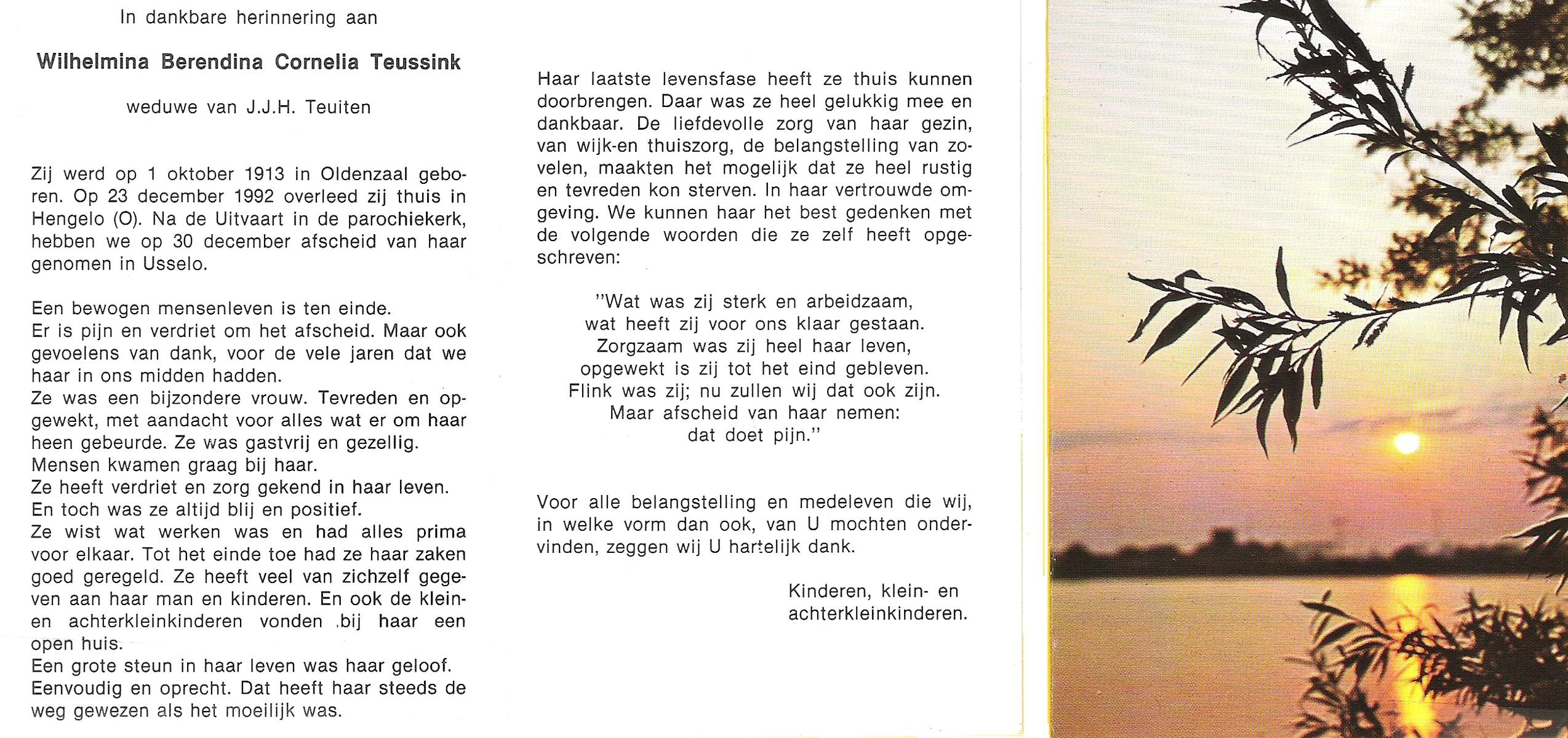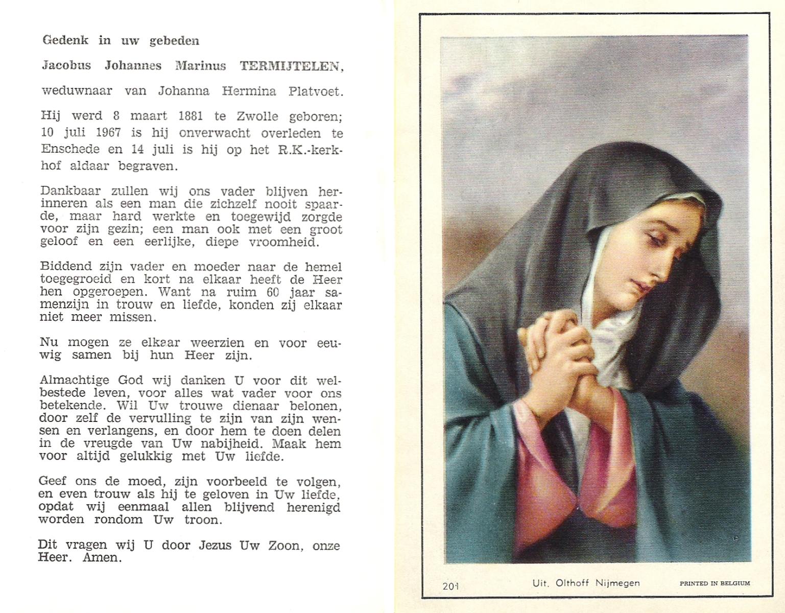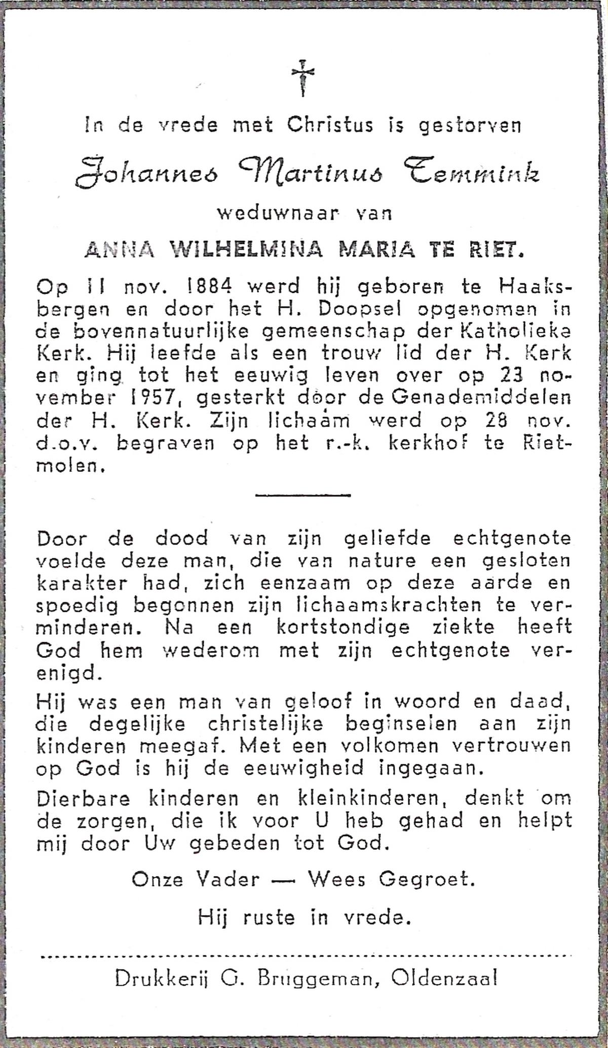 TIJDHOF, Bernardus Gerardus, geboren op 25-06-1895 te Weerselo, overleden op 26-6-1987 te Oldenzaal op 92-jarige leeftijd, begraven op 30-6-1987 te Oldenzaal.