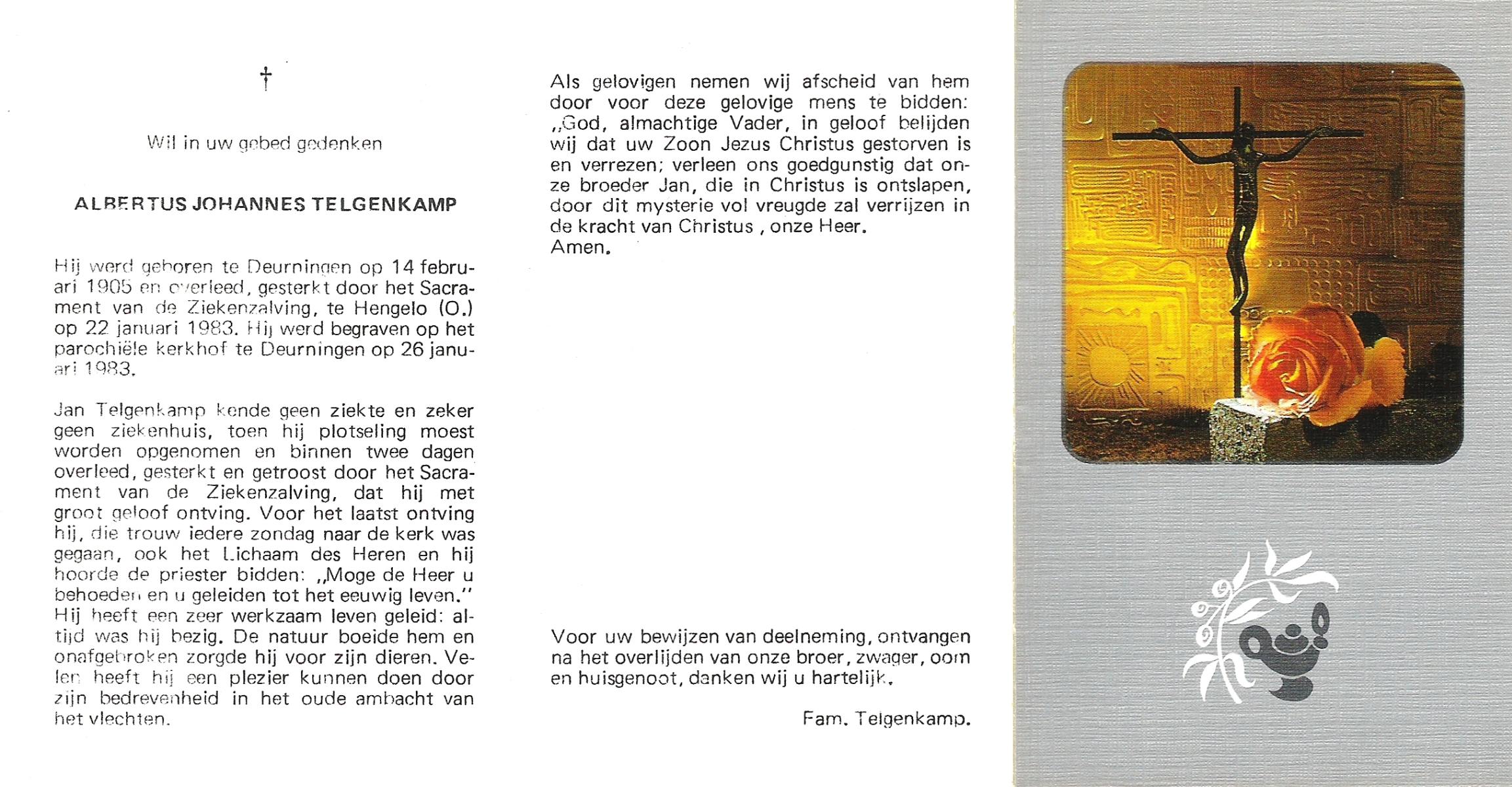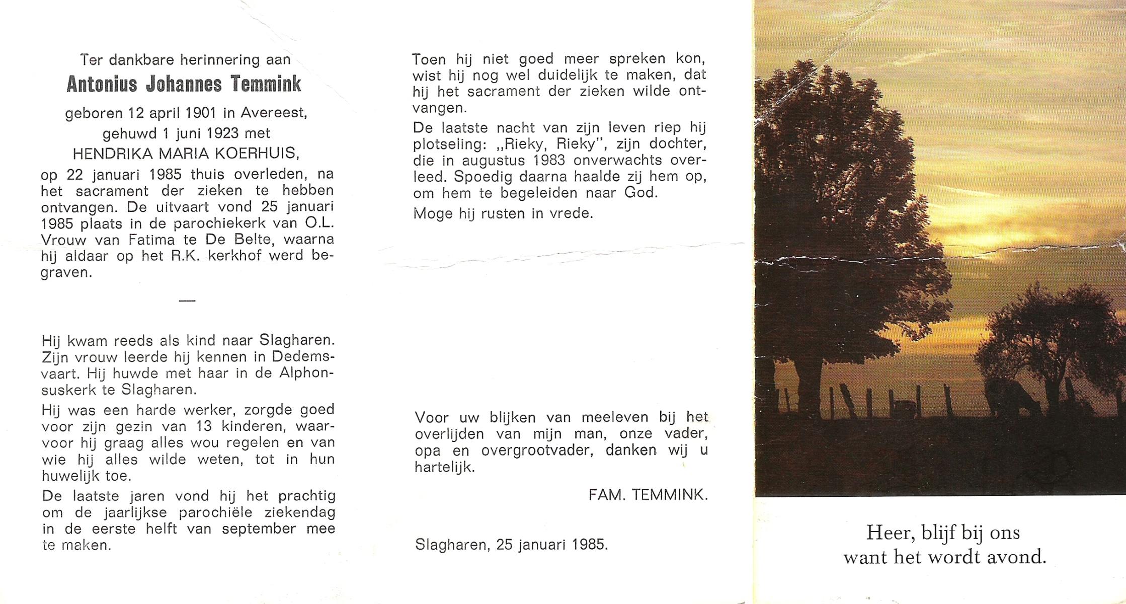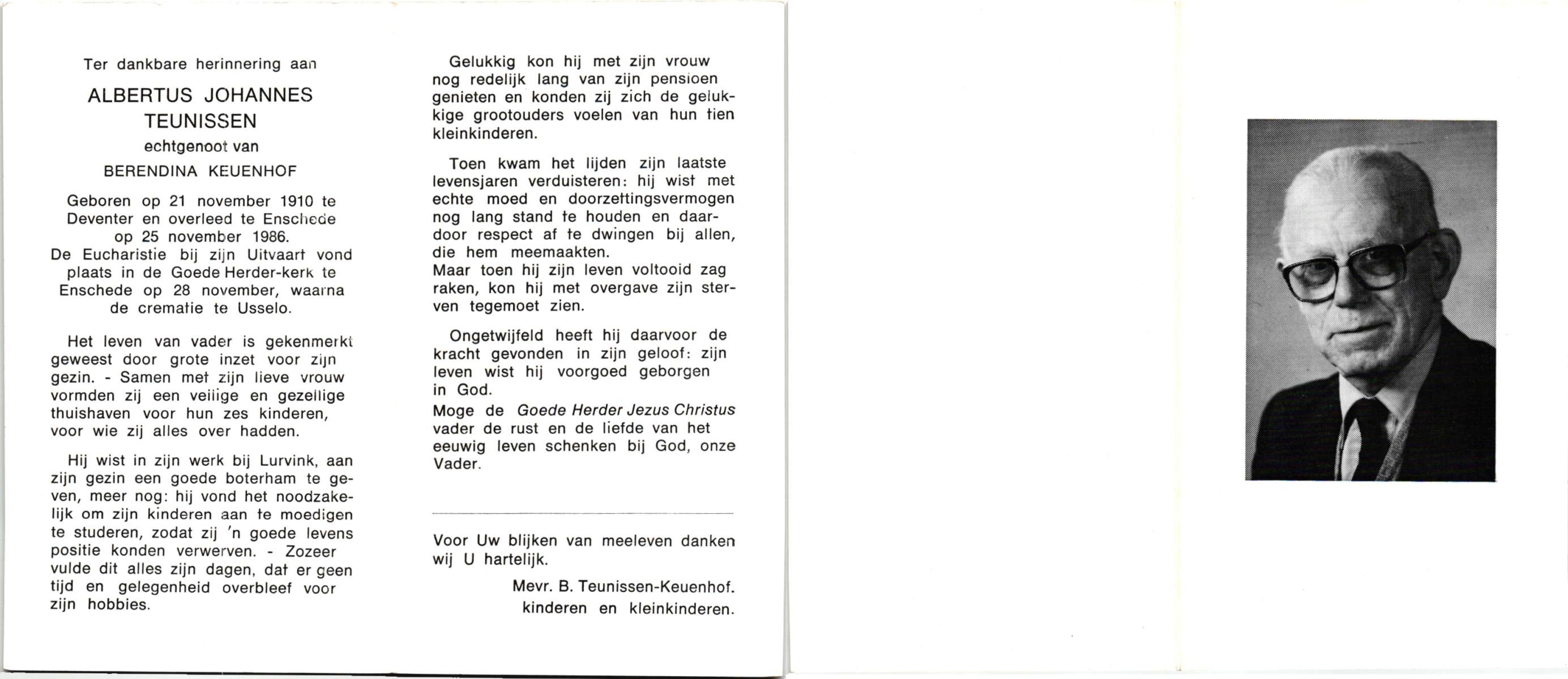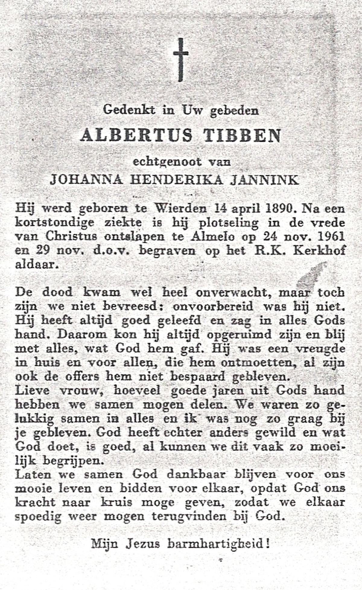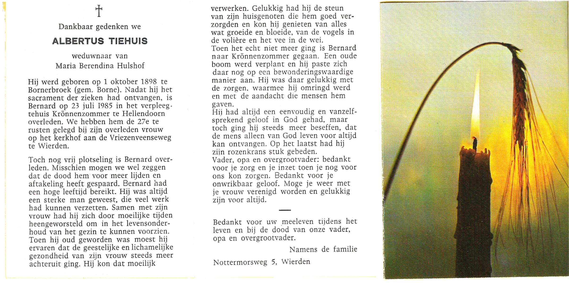 TIEHUIS, Albertus, geboren op 01-10-1898 te Bornerbroek, overleden op 23-7-1985 te Hellendoorn op 86-jarige leeftijd, begraven op 27-7-1985 te Wierden.