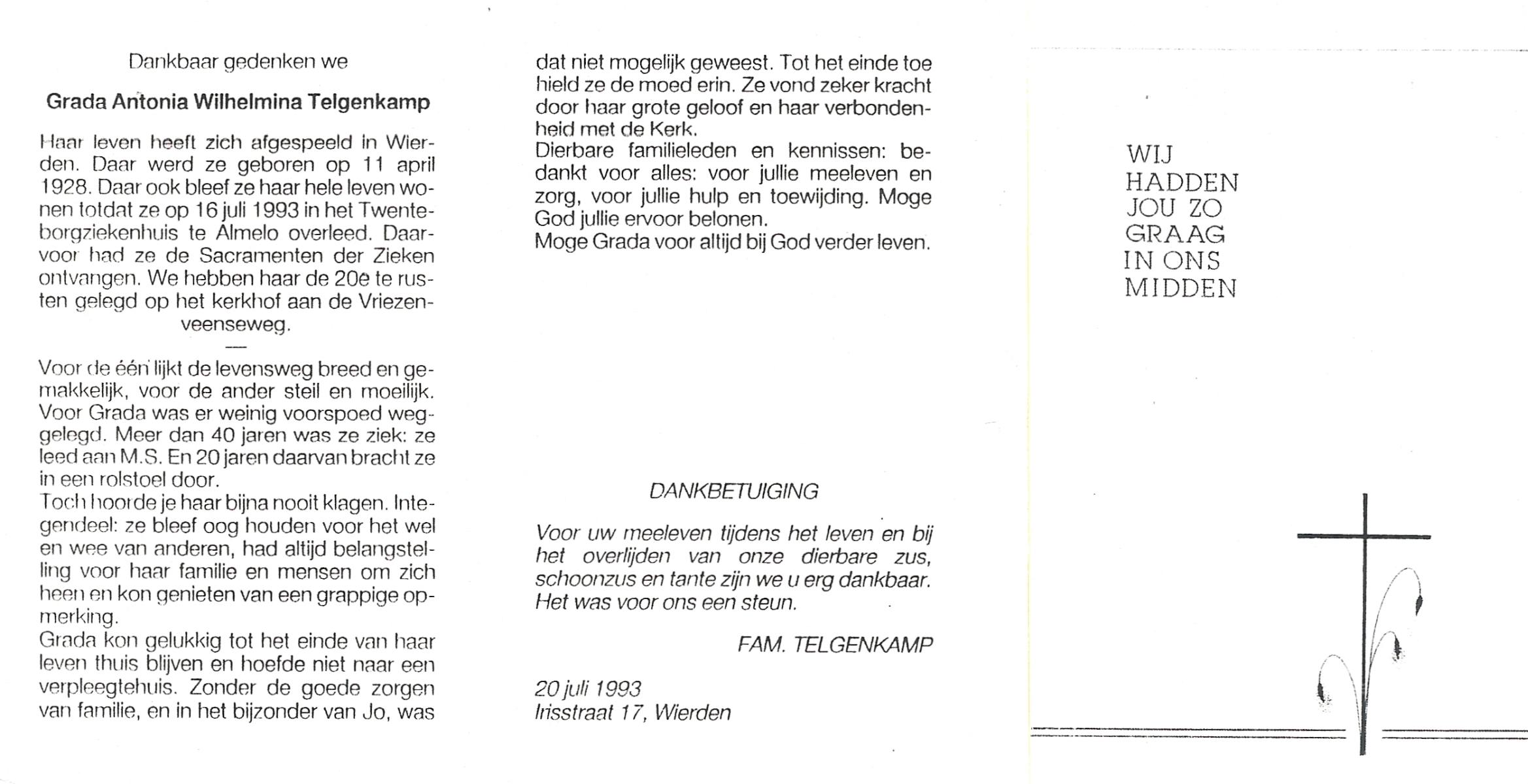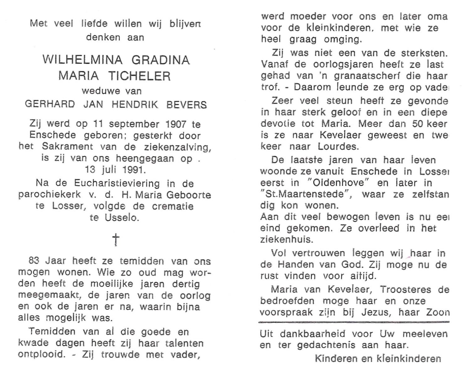 TICHELER, Wilhelmina Gradina Maria, geboren op 11-9-1907 te Enschede, overleden op 13-7-1991 op 83-jarige leeftijd, gecremeerd te Usselo.