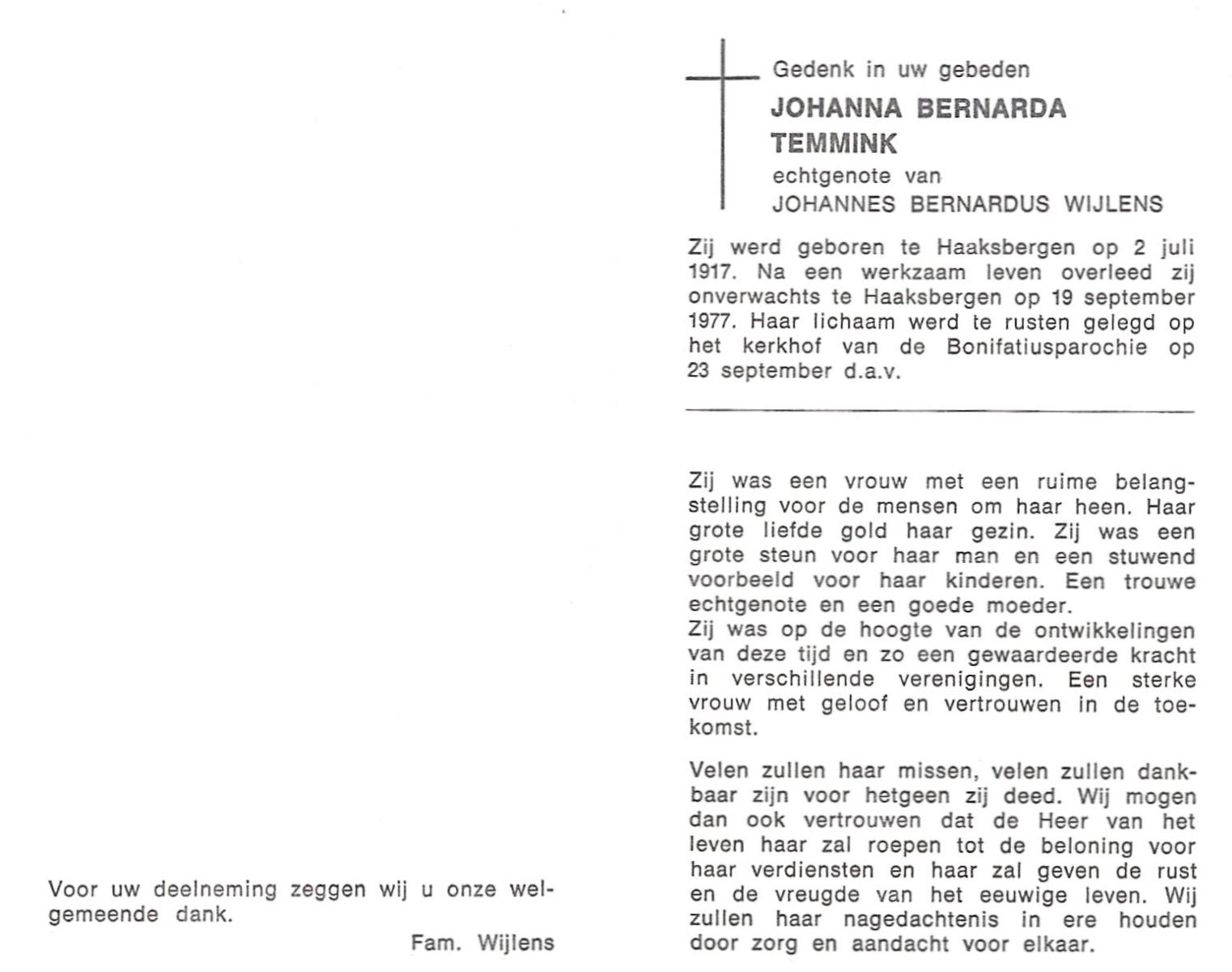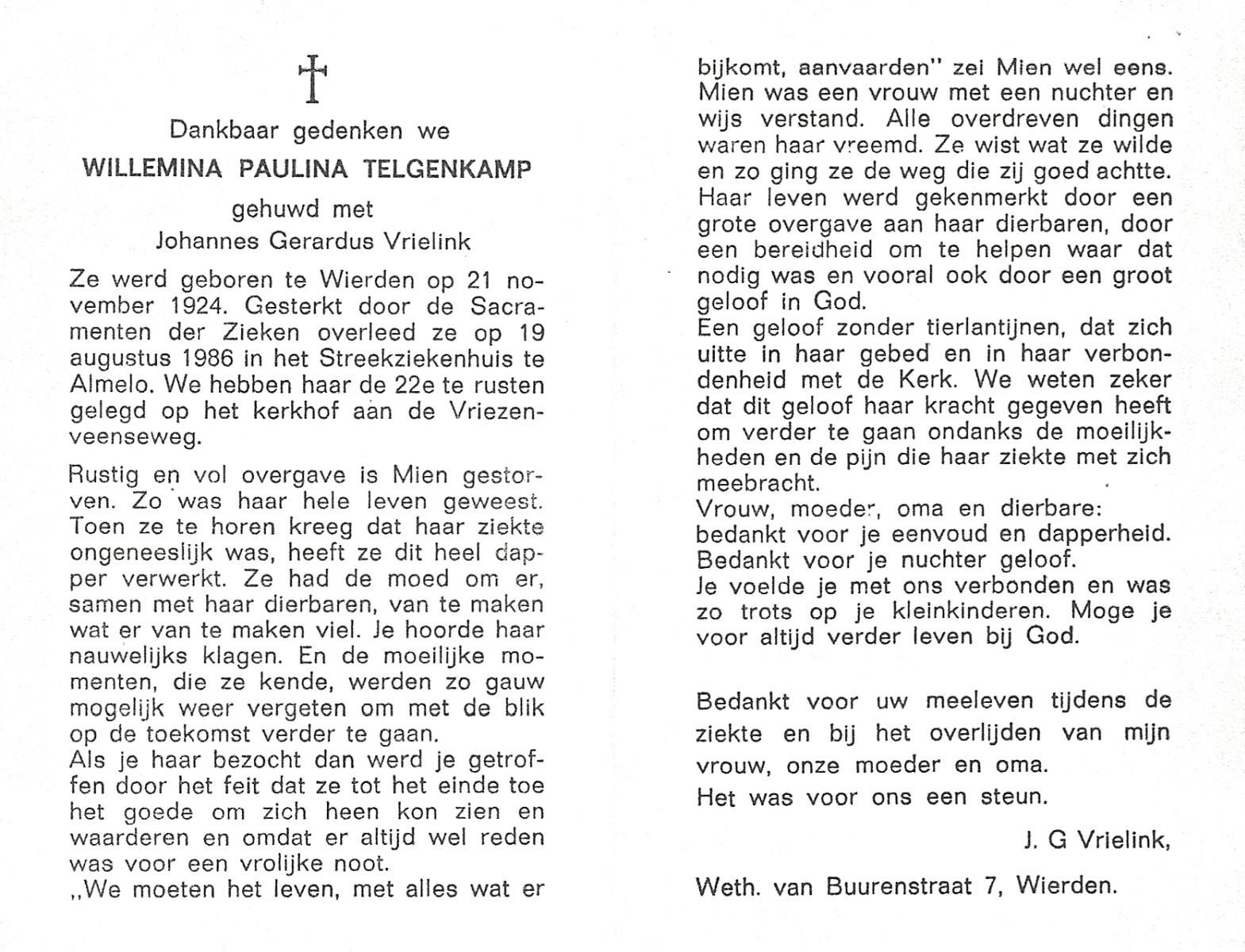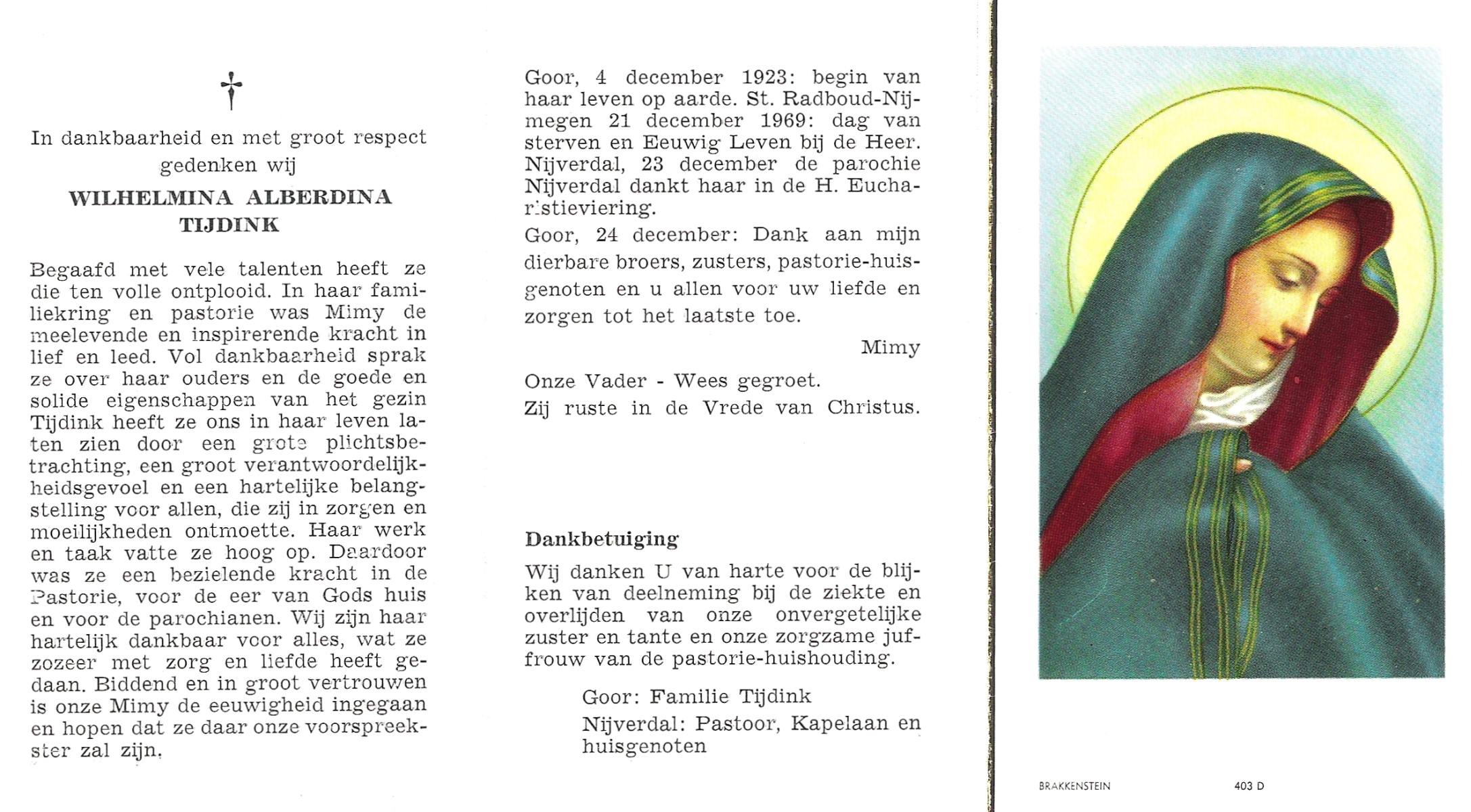 TIJDINK, Wilhelmina Alberdina, geboren op 4-12-1923 te Goor, overleden op 21-12-1969 te Nijmegen op 46-jarige leeftijd, begraven op 24-12-1969 te Goor.