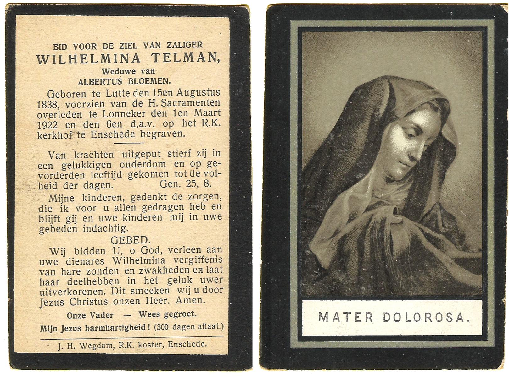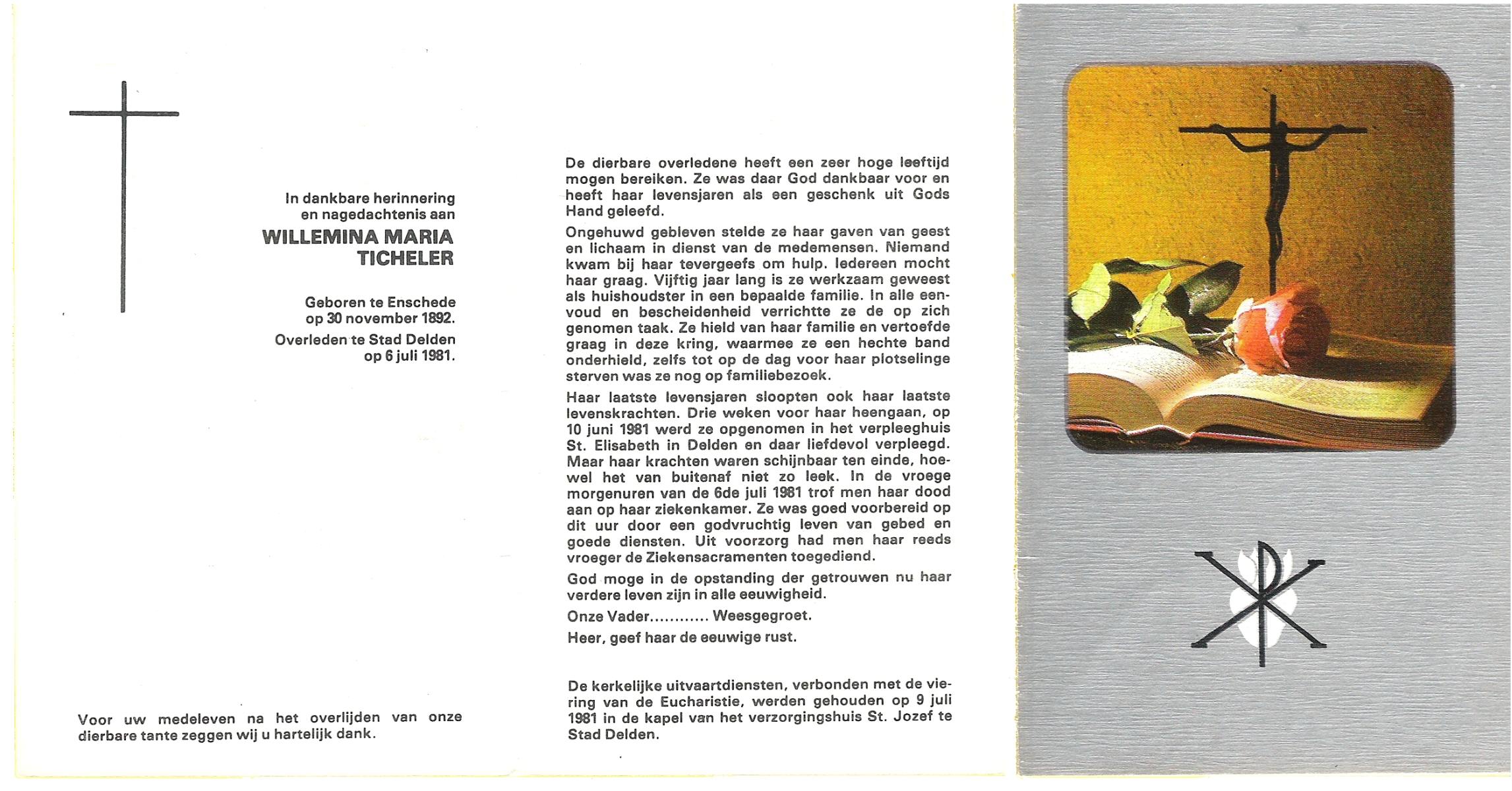 TICHELER, Willemina Maria, geboren op 30-11-1892 te Enschede, overleden op 6-7-1981 te Delden op 88-jarige leeftijd.
