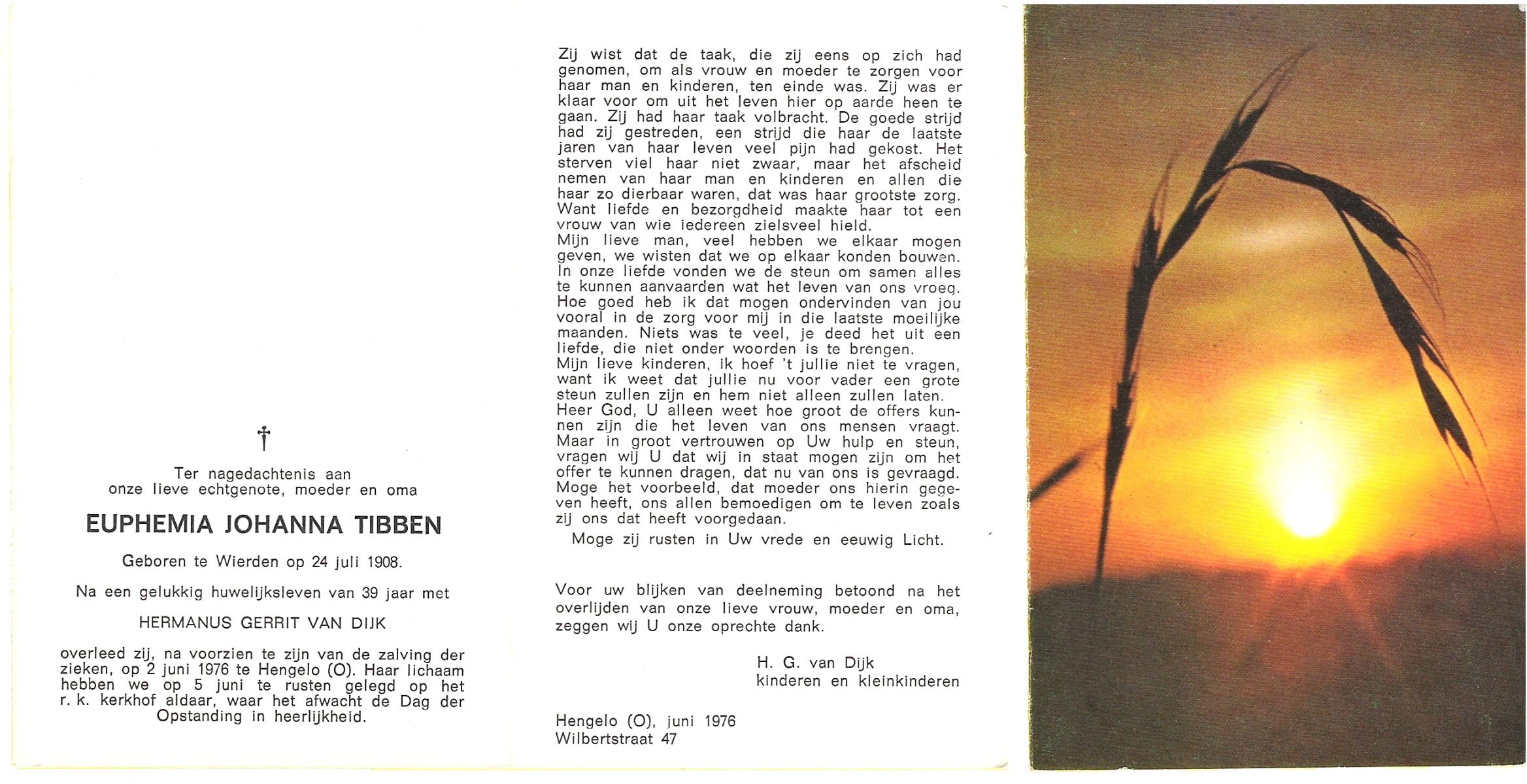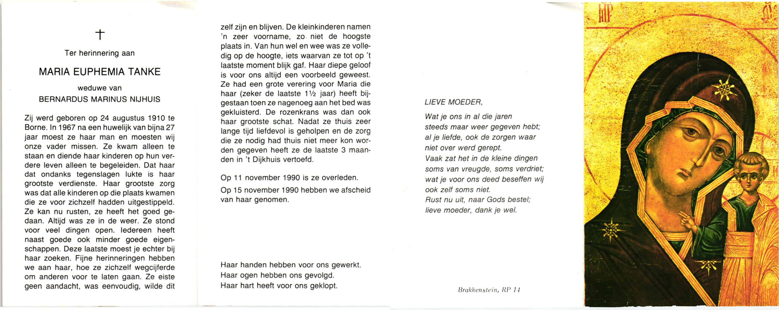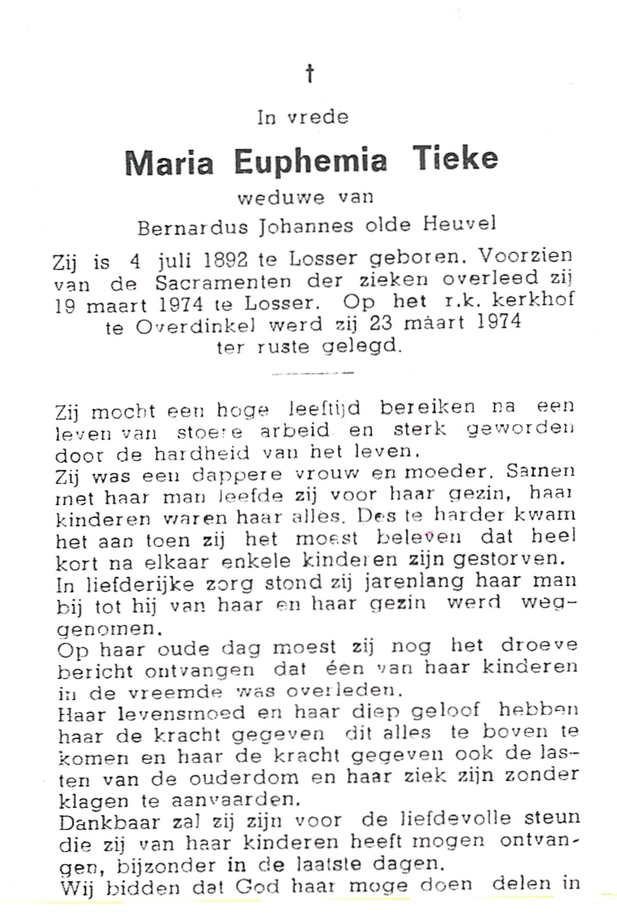 TIEKE, Maria Euphemia, geboren op 04-07-1892 te Losser, overleden op 19-3-1974 te Losser op 81-jarige leeftijd, begraven op 23-3-1974 te Overdinkel.