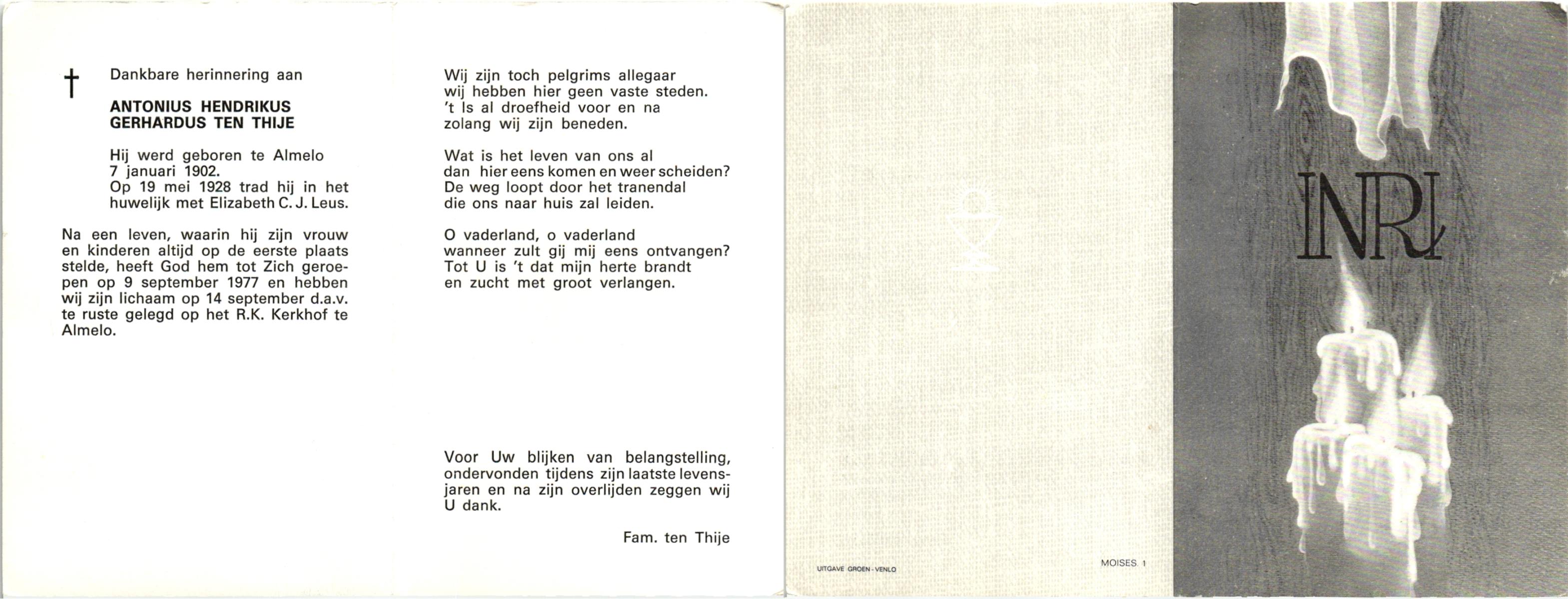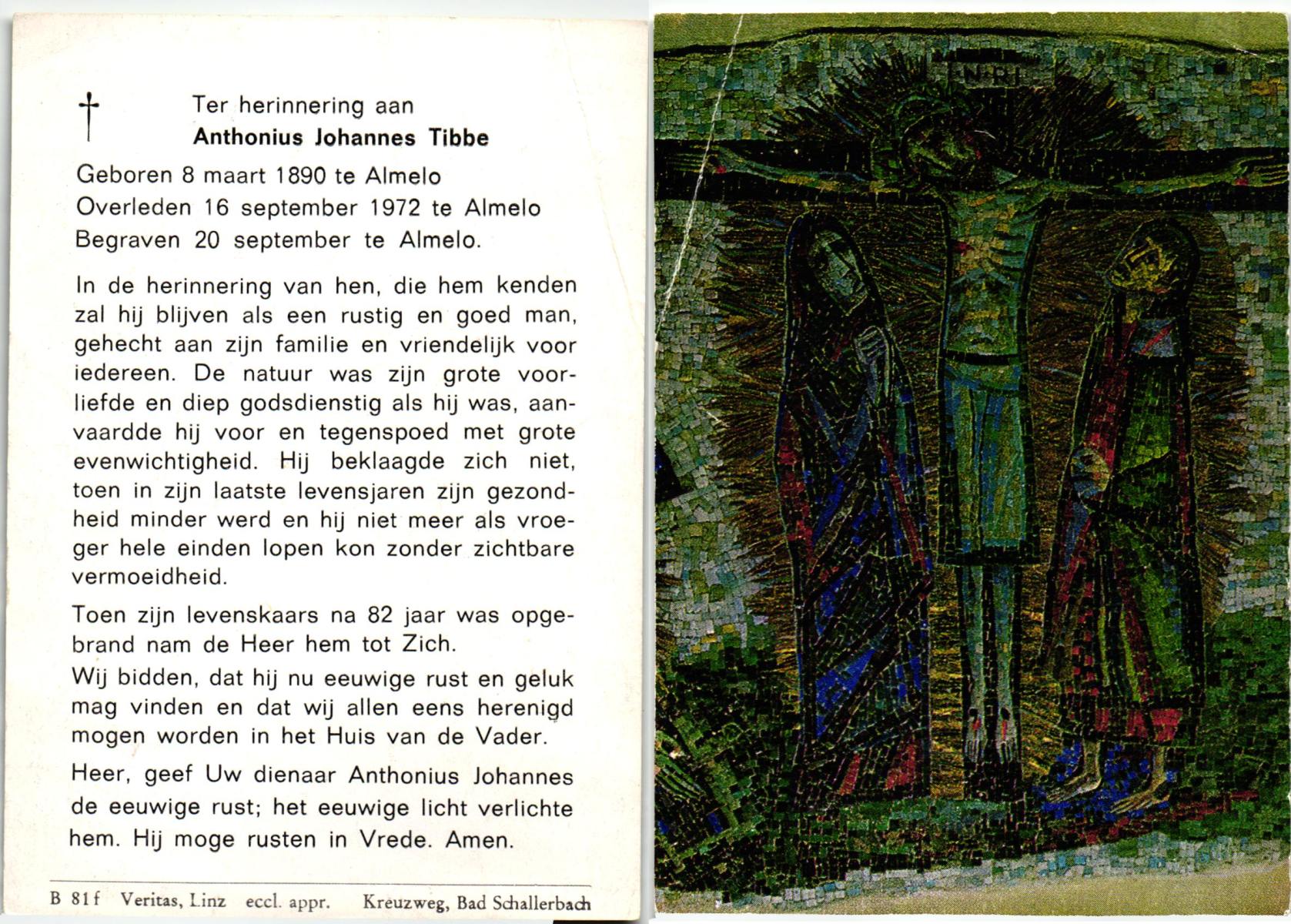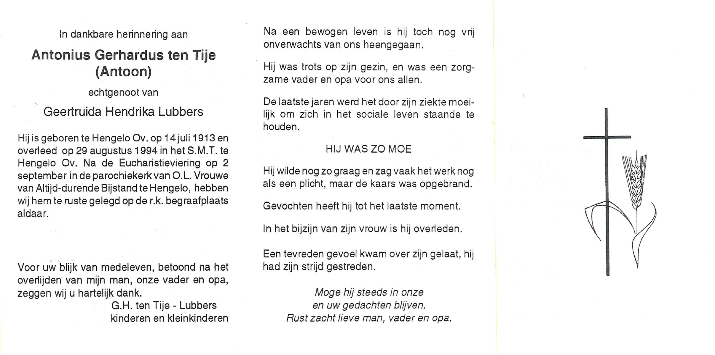 TIJE, ten, Antonius Gerhardus (Antoon), geboren op 14-7-1913 te Hengelo (O), overleden op 29-8-1995 te Hengelo (Ov.) op 82-jarige leeftijd, begraven op 2-9-1995 te Hengelo (Ov.).